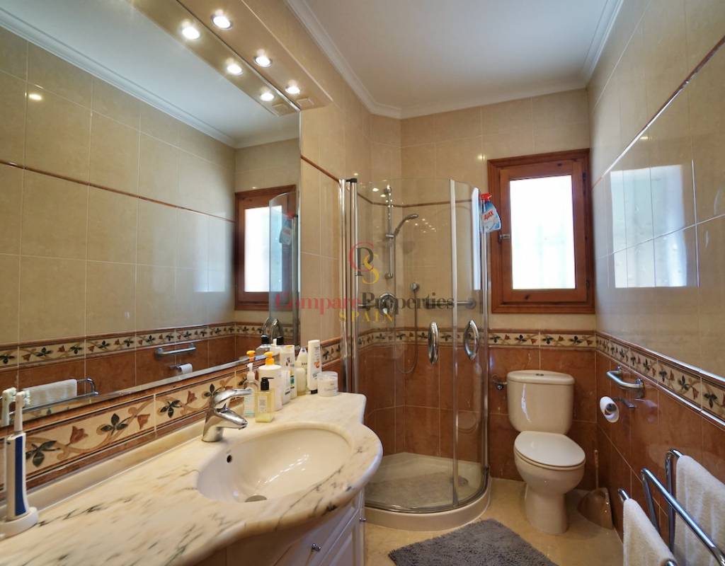 Auf der oberen Ebene finden Sie die fantastische Master-Suite, die eine entspannende Lounge-Sitzecke, ein geräumiges Schlafzimmer mit großen Fenstern, die viel natürliches Sonnenlicht in den Raum bringen, ein Ankleidezimmer und ein en-suite Badezimmer umfasst. Das Schlafzimmer hat Zugang zu einer Balkon-Terrasse, von der aus Sie wiederum die spektakuläre Aussicht auf das Meer, den Peñon de Ifach in Calpe und die Berge der Sierra Bernia genießen können.