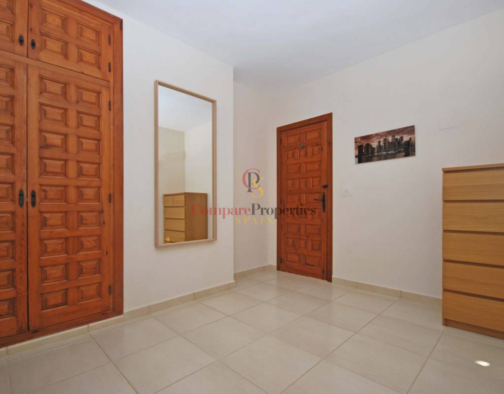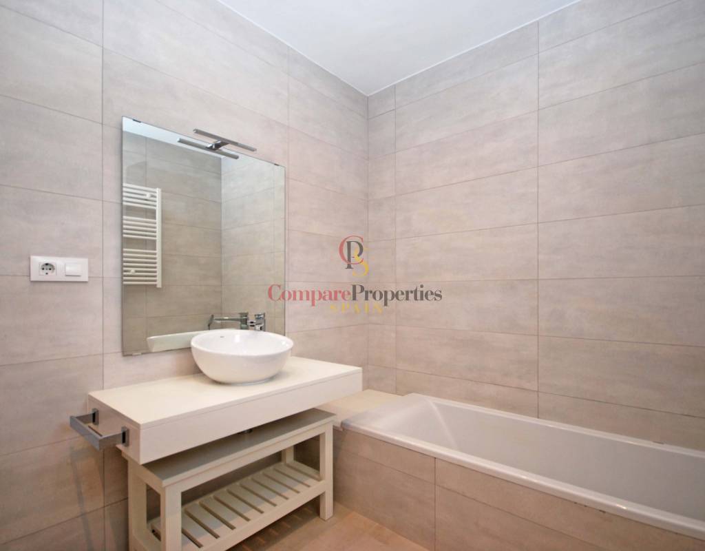 Über die Innentreppe gelangen Sie in das schöne und helle Wohnzimmer mit einem umlaufenden Balkon, von dem aus Sie einen schönen Berg- und Meerblick genießen können, und es gibt auch eine schöne große Terrasse auf der Rückseite mit Blick auf den Poolbereich. Hier finden Sie auch 3 weitere Schlafzimmer und ein Badezimmer mit Badewanne.