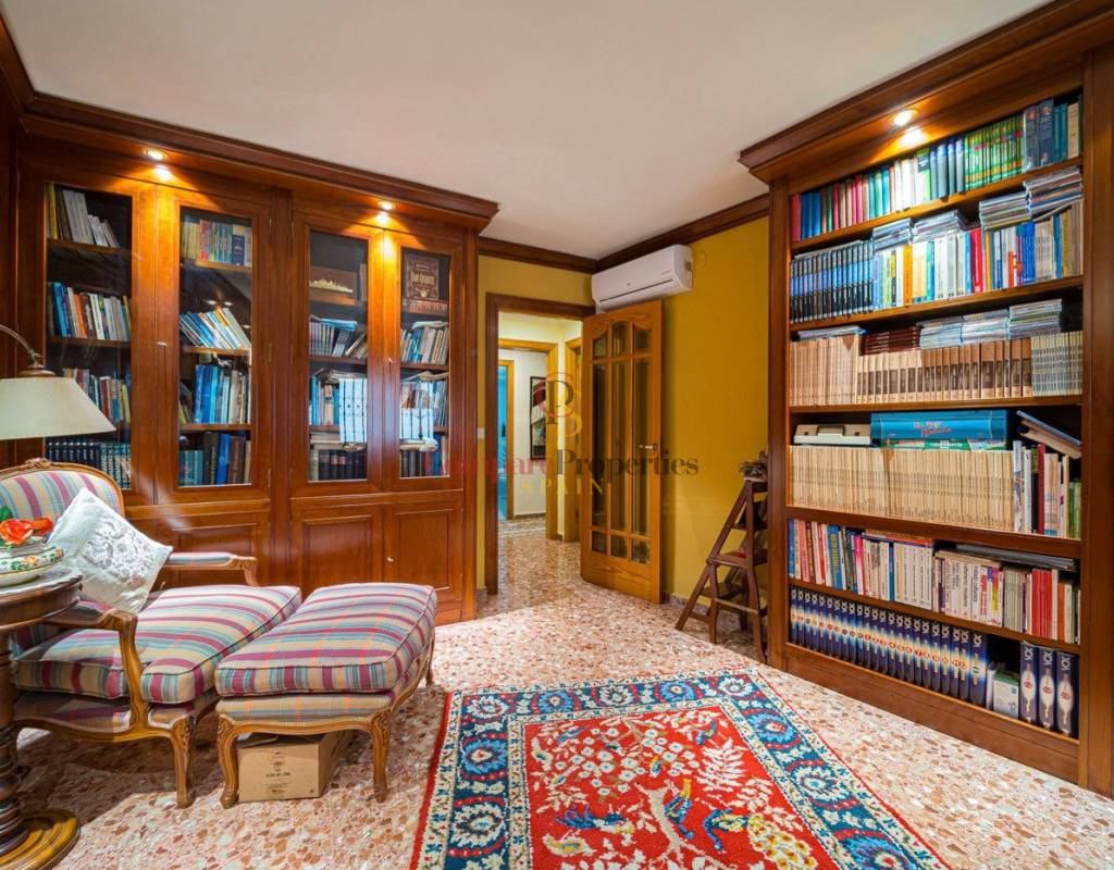 Weiter unten im Flur und auf der linken Seite befindet sich die riesige Küche, die über einen Hauswirtschaftsraum und eine riesige Speisekammer verfügt. Fast direkt vor der Küche befindet sich das dritte, ebenfalls sehr große Schlafzimmer, das derzeit als Büro mit Bibliothek genutzt wird. Daneben befindet sich das geräumige Wohnzimmer mit vorgelagerter Balkonterrasse, und schließlich das große Hauptschlafzimmer mit eigenem Bad.