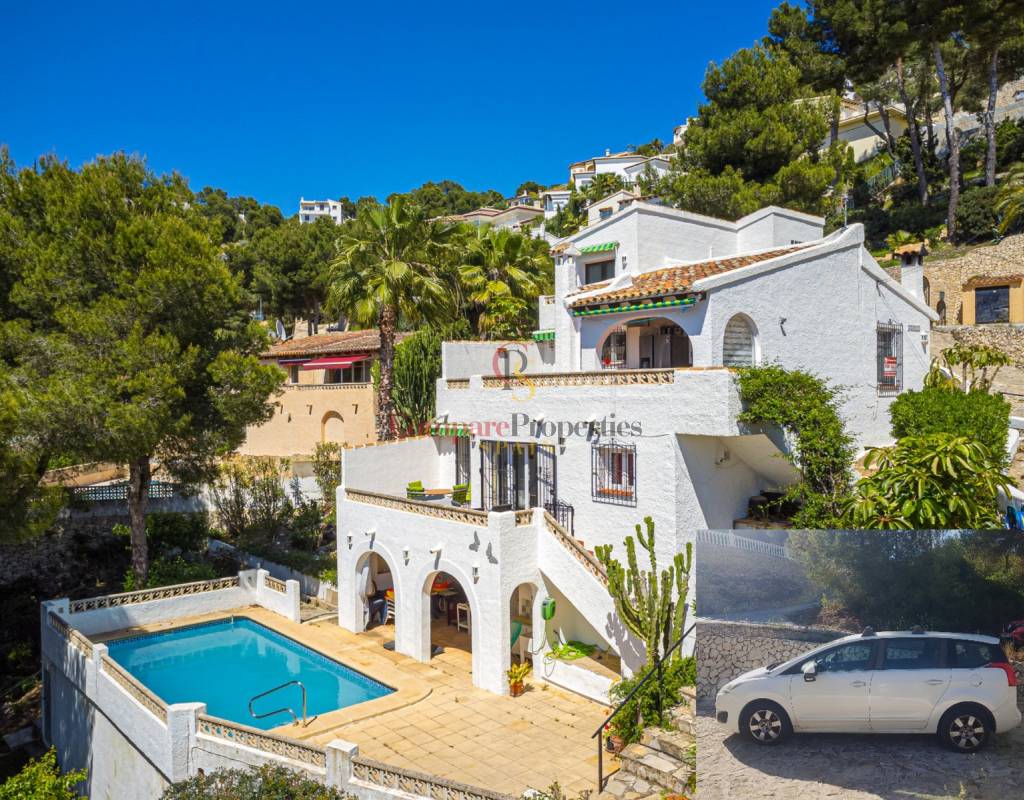 Geräumige Villa mit herrlichem freiem Blick und einem Auto zum Verkauf in Paichi, Moraira, nur 2,6 km vom Stadtzentrum entfernt. Diese Villa erstreckt sich über vier Ebenen, darunter zwei separate Wohnungen, und befindet sich in einer ruhigen und sehr grünen Gegend. An der Seite der Villa befindet sich ein großer Parkplatz, groß genug für mehrere Autos.Ein paar Stufen vom Parkplatz hinunter betreten Sie die Eingangstür der Hauptwohnebene, Sie betreten einen Flur, rechts ist die Treppe hinauf zur Mastersuite, diese besteht aus einem Doppelzimmer mit Balkon und einem modernen Duschbad . Auf der linken Seite befindet sich das Duschbad des Hauses und ein Schlafzimmer/Büro mit Türen, die zur vorderen Terrasse führen. Dann betreten Sie das große L-förmige Wohn-/Esszimmer mit Kamin und Holzofen, vom Essbereich führen Türen auf die vordere Terrasse. Neben dem Essbereich befindet sich eine hervorragende, voll ausgestattete offene Küche mit glänzenden cremefarbenen Einheiten, schwarzen Silestone-Arbeitsplatten und Edelstahlgeräten. Durch eine Tür aus der Eingangshalle finden Sie eine schöne private Seitenterrasse mit Grillplatz und viel Platz zum Essen und Entspannen im Freien, ein großartiger Ort, um Ihre Abende zu verbringen. Die vordere Terrasse ist die Breite der Villa.Die Ebene darunter ist ein separates Apartment, es hat eine eigene vordere Terrasse, Sie betreten ein geräumiges Wohn-/Esszimmer mit offenem Kamin. Auf der rechten Seite befindet sich eine separate Küche, die komplett mit beigen und roten Einheiten und allen Geräten ausgestattet ist, die Sie benötigen. Aus dem Wohnbereich gehen zwei Doppelzimmer, eines mit Türen zur Terrasse und ein Badezimmer mit Badewanne mit Duschvorrichtung.Die untere Ebene umfasst die weitläufige Poolterrasse mit einem 8 x 4 m großen Pool und einer großen offenen Naya, die für Grillabende und Mahlzeiten im Freien ausgestattet ist. Auf der Rückseite der Naya befindet sich ein sehr großer Abstellraum. Die Gartenbereiche auf beiden Seiten der Villa sind gut mit ausgewachsenen Pflanzen und Bäumen bepflanzt.- Kernpunkte:- Baujahr 1982- Zustand: Renoviert- Zwei Kamine- Elektrische Heizkörper- Klimaanlage- Doppelt verglaste Türen und Fenster- Markisen für zusätzlichen Schatten- Viele Außenterrassen- Privatpool 8 x 4 m- Parkplatz für mehrere Autos- Jährliche Steuern 897,26 €- Entfernungen:- 2,6 km zum Stadtzentrum- 1,4 km zu einem Supermarkt- 3,1 km zum Strand und Yachthafen- 5,6 km zum Golfplatz- 9,2 km bis zur Autobahnauffahrt in Benissa- Diese Villa hat viele Möglichkeiten und sollte nicht verpasst werden- Auto inklusive, Peugeot 5008 Baujahr 2014, neue Reifen, neue Bremsen, ITV 2022 und sehr geringer Verbrauch