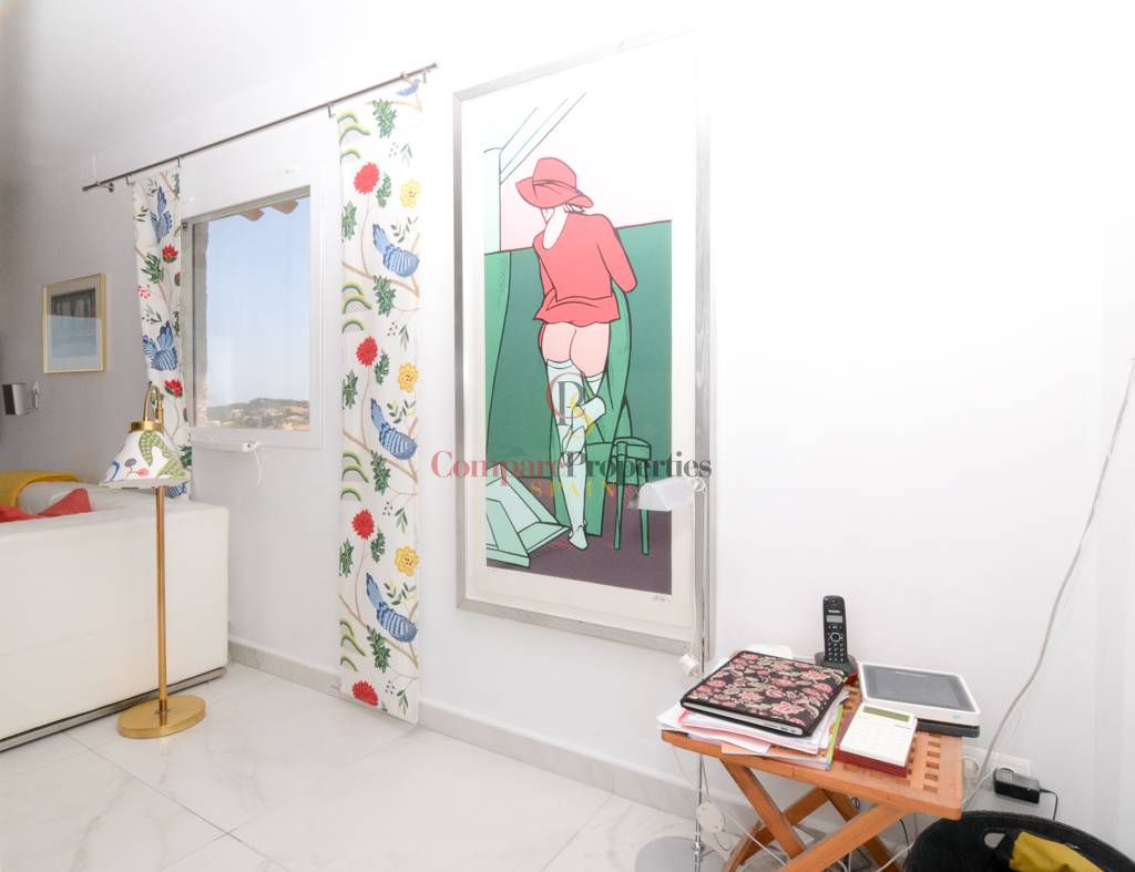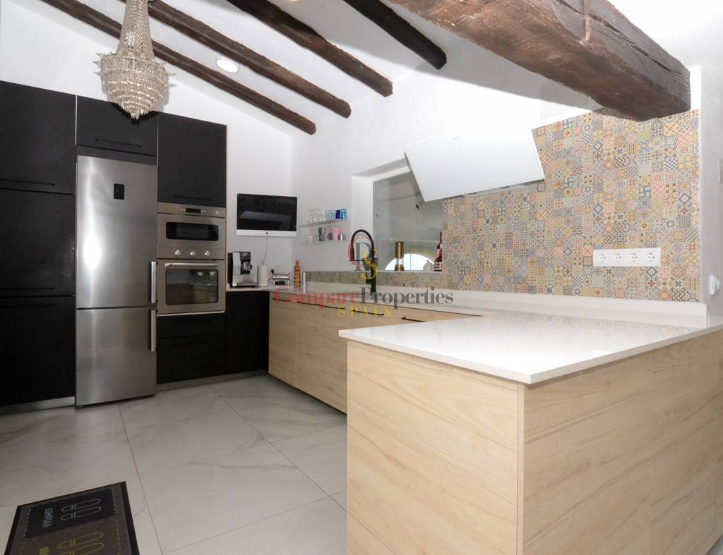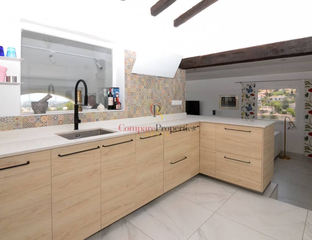 Im Inneren haben wir eine große offene Küche von sehr modernem Stil und ein großes Wohnzimmer mit direktem Blick auf Dénia, sein Meer und seine Burg sowie eine verglaste Terrasse (mit einem faltbaren Glasvorhang), die als Esszimmer und Pelletofen dient.