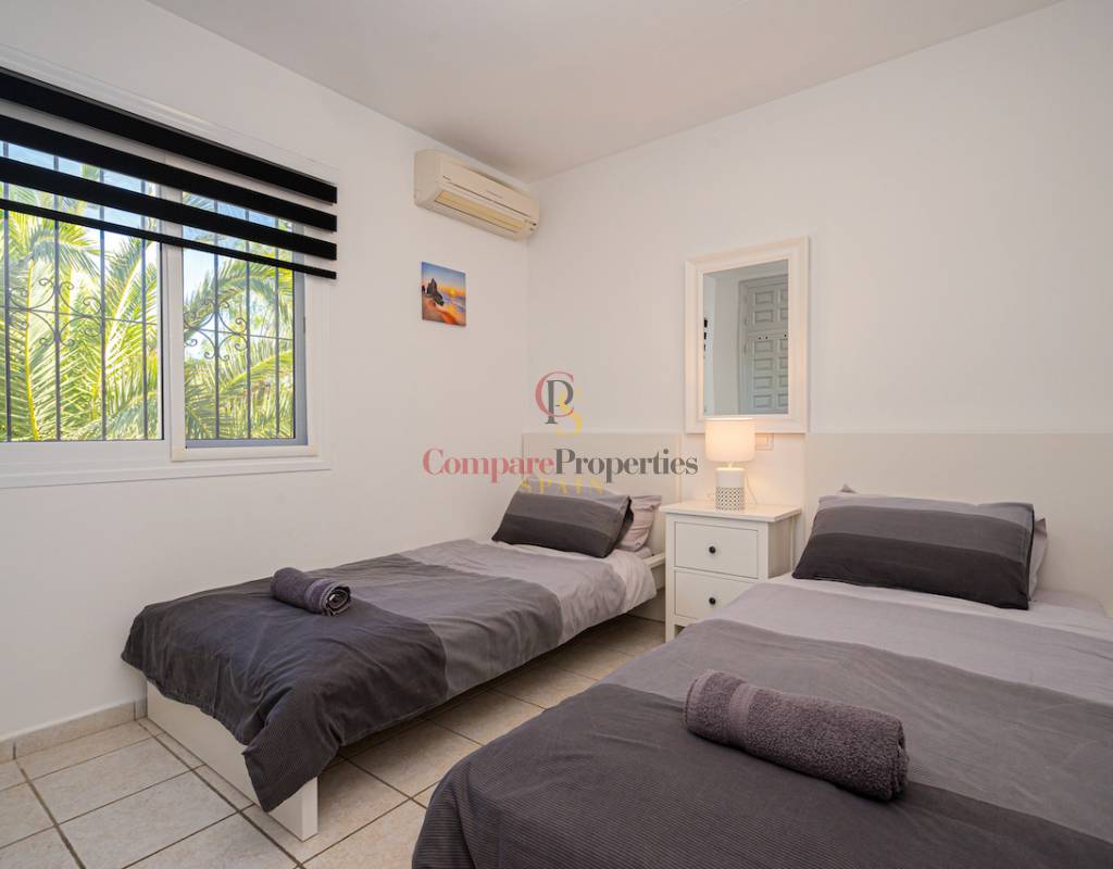 Von der Einfahrt aus betreten wir die Villa in den offenen Wohn- und Essbereich und auf der rechten Seite eine voll ausgestattete Küche mit allen Geräten. Neben der Küche befindet sich ein Flur, der Zugang zu den Schlafzimmern bietet - ein Doppelschlafzimmer mit Einbauschränken, ein Familien-Duschbad und am anderen Ende des Flurs ein sehr großes Hauptschlafzimmer mit Doppelbett und einem großen eigenen Bad und viel Stauraum in den Einbauschränken. Auf dieser Ebene befindet sich auch eine überdachte Terrasse, auf der man sich im Schatten entspannen kann, eine Pergola, die derzeit eine Tischtennisplatte beherbergt, und ein Zugang zum Garten, der sich um die Seiten und die Rückseite der Villa herum erstreckt. Der Garten ist pflegeleicht und hat eine gute Auswahl an reifen Pflanzen, einschließlich duftendem Jasmin, Oliven und Zitrusfrüchten.