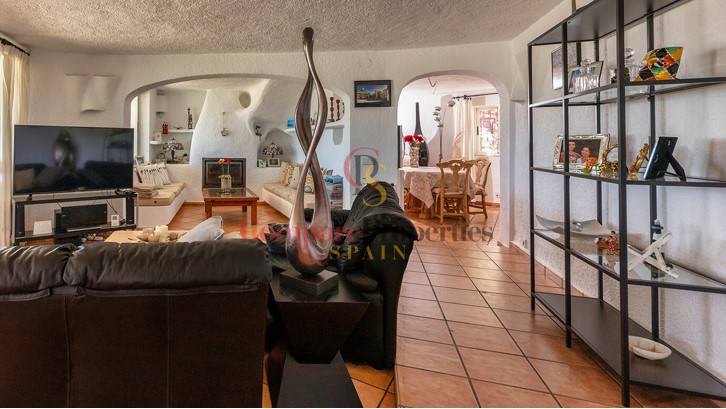 Vom Pool aus kann man den ganzen Tag die Sonne genießen, bis sie abends hinter dem Berg Montgó untergeht. Der Boden der Außenterrassen ist ebenso aus handgemachten Terra-Cotta, wie auch die Böden des stilvollen Intérieurs.