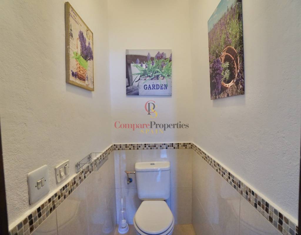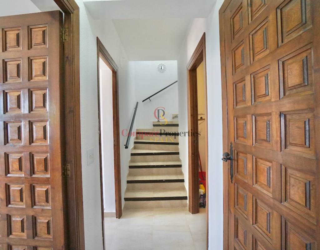 Das Hotel liegt am Ende einer sehr ruhigen Sackgasse, diese renovierte drei Schlafzimmer, zwei Badezimmer Eigentum ist über drei Ebenen verteilt und ist von einem niedrigen Wartung Garten umgeben. Der Parkplatz ist direkt vor der Tür und wir betreten das Erdgeschoss ein geräumiger und heller offener Wohnbereich mit einer voll ausgestatteten Küche, Esszimmer und Wohnzimmer. Es gibt charakteristische Holzbalken an der Decke und einen schönen elektrischen Kamin für kühlere Abende. Hier gibt es große Glastüren, die direkt auf den nach Süden ausgerichteten Balkon führen, von dem aus Sie einen ungehinderten Blick auf das Mittelmeer und die Küste genießen können.