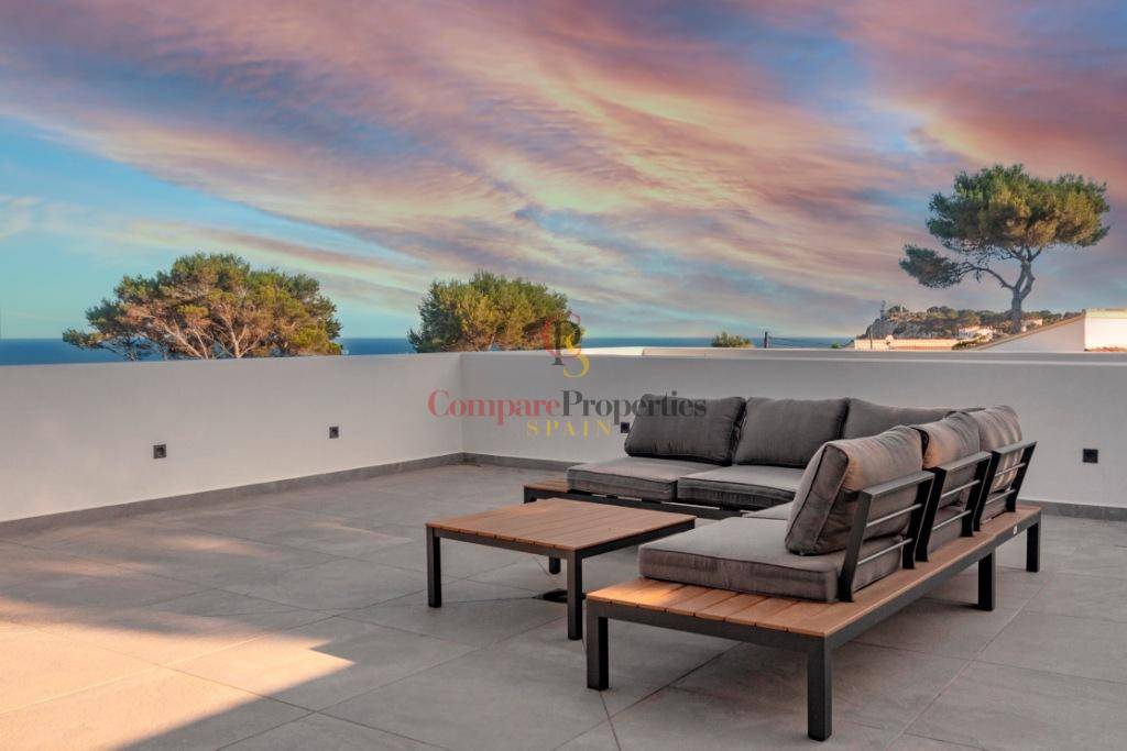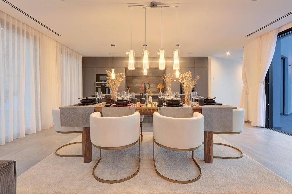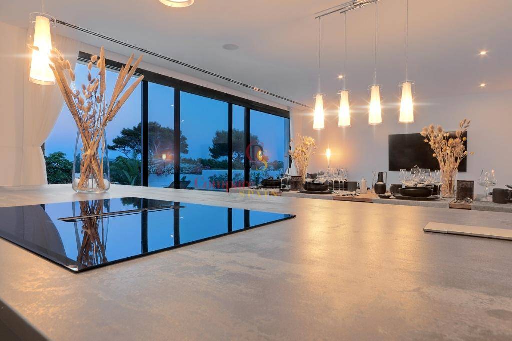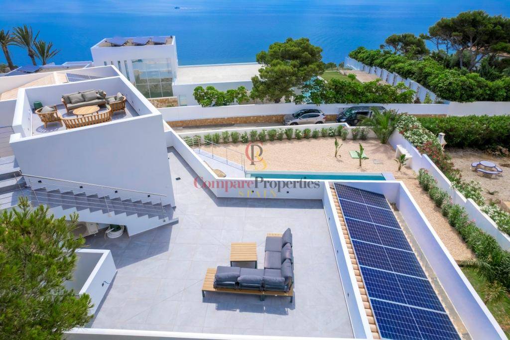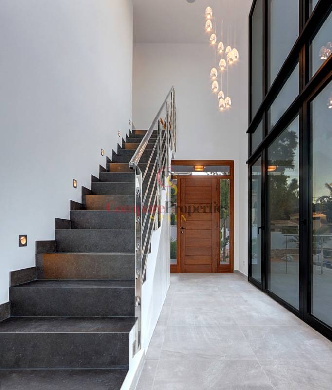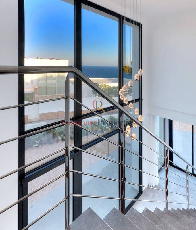 Das Haus ist über eine spektakuläre und moderne Eingangshalle mit Meerblick zugänglich, verfügt über ein geräumiges und helles Wohnzimmer mit voll ausgestatteter offener Küche. Die Villa verfügt über 4 Schlafzimmer, zwei Badezimmer und ein Gäste-WC. 3 der Schlafzimmer befinden sich im Erdgeschoss und das Hauptschlafzimmer mit Bad in Suite und Ankleideraum befindet sich im zweiten Stock. Vom Hauptschlafzimmer aus haben Sie Zugang zu zwei wunderschönen Terrassen mit herrlichem Ausblick.