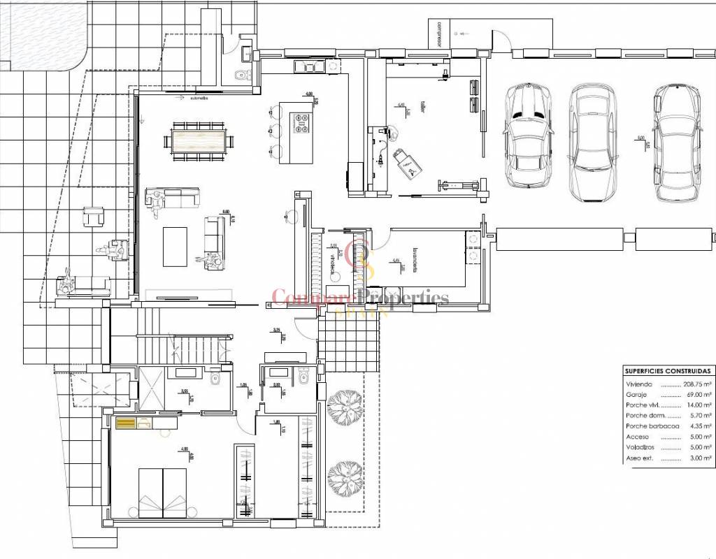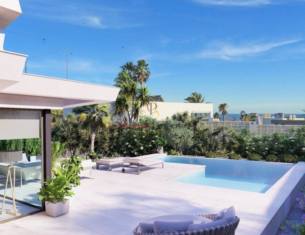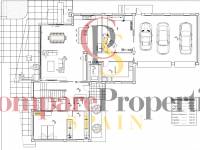 Auf zwei Etagen verteilt, bietet diese moderne Villa alle Annehmlichkeiten. Die Garage oder der Haupteingang bietet Zugang zum Erdgeschoss, bestehend aus einem hellen Wohnzimmer, das mit der voll ausgestatteten Küche mit Kücheninsel verbunden ist. Darüber hinaus finden wir einen Abstellraum, Terrasse, Waschküche, WC und das Hauptschlafzimmer mit Bad en suite und Einbauschränken. Sowohl das Wohnzimmer als auch das Schlafzimmer haben direkten Zugang zur teilweise überdachten Terrasse mit Pool.