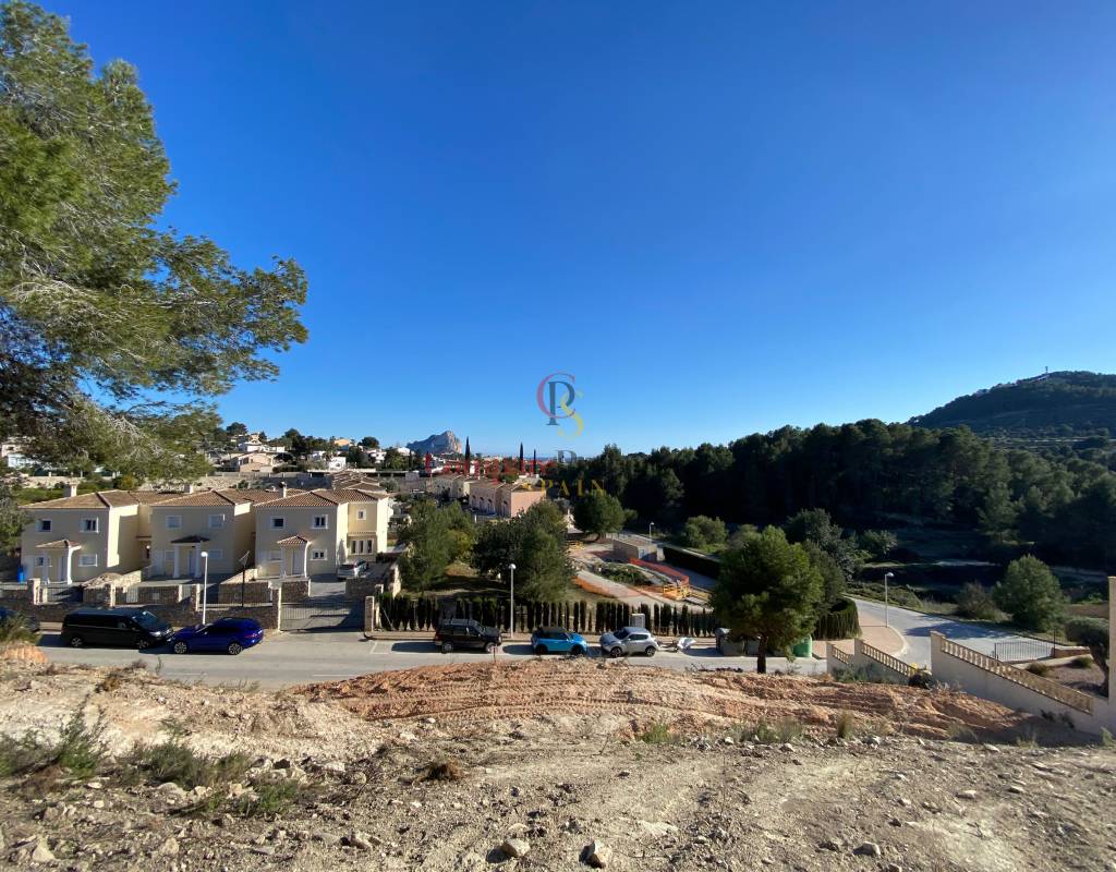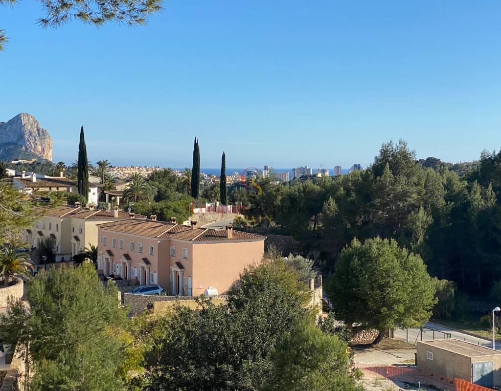 Blick auf den Felsen von Ifach und das Meer. Das Land ist sauber und bereit, eine Villa von ca. 200 m2 plus Terrassen zu bauen.