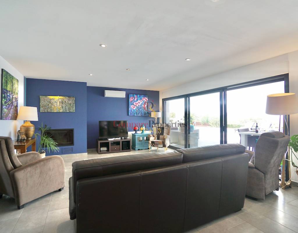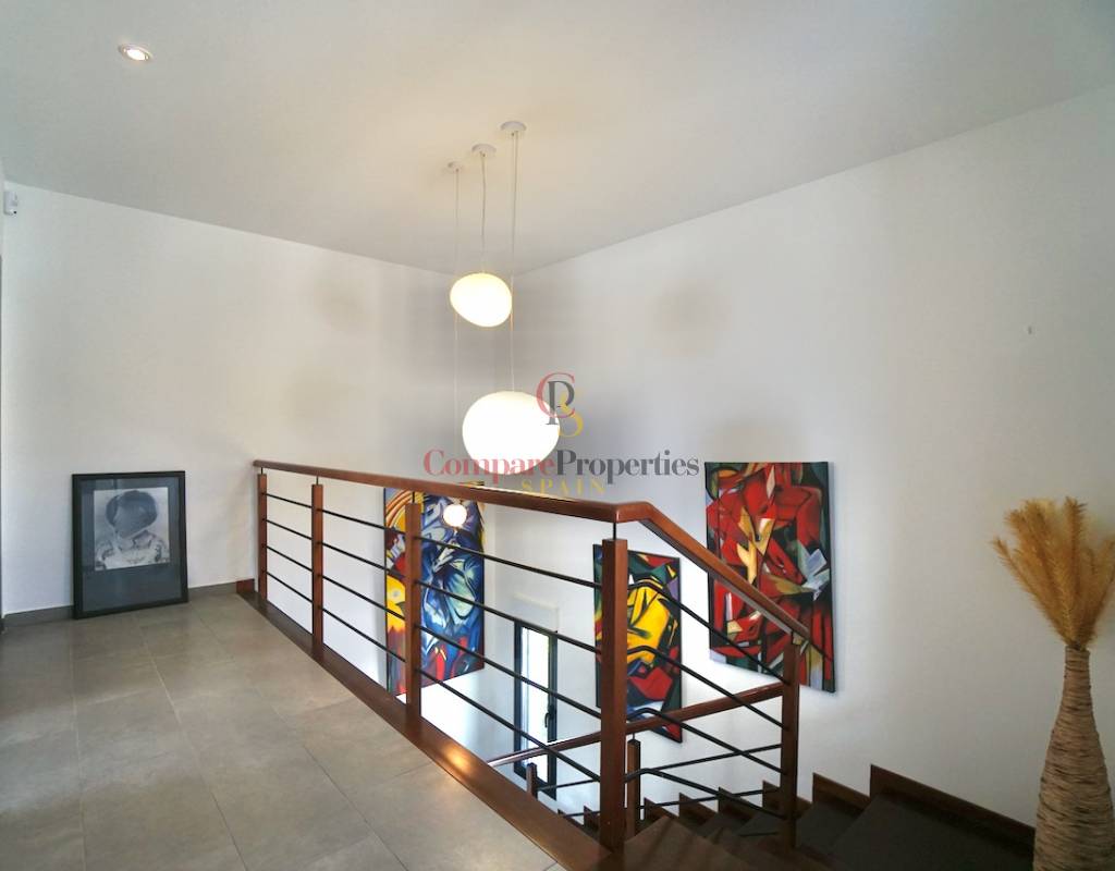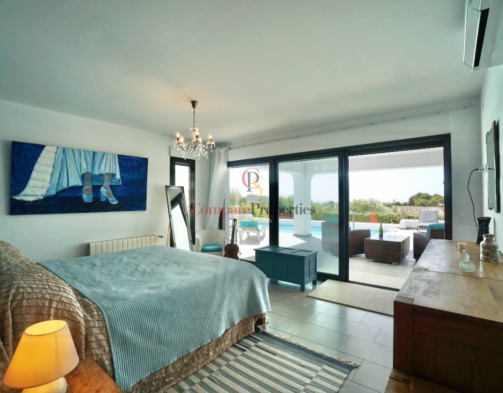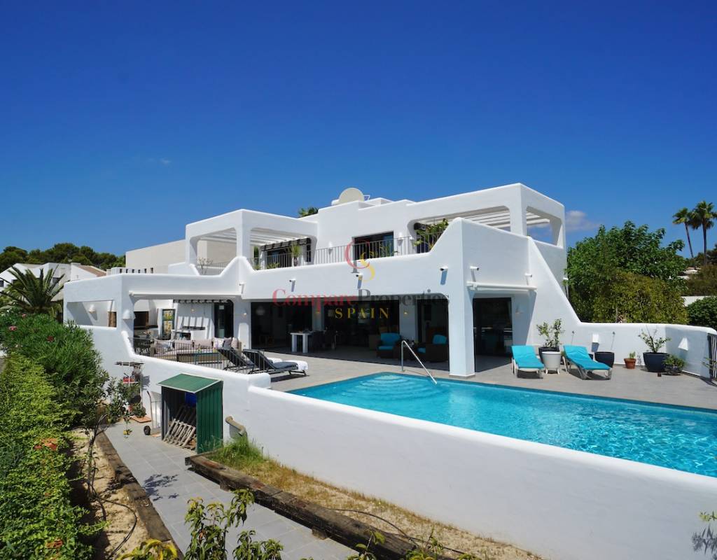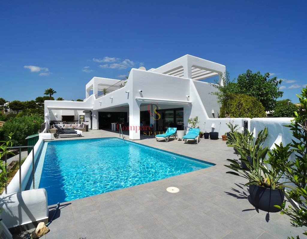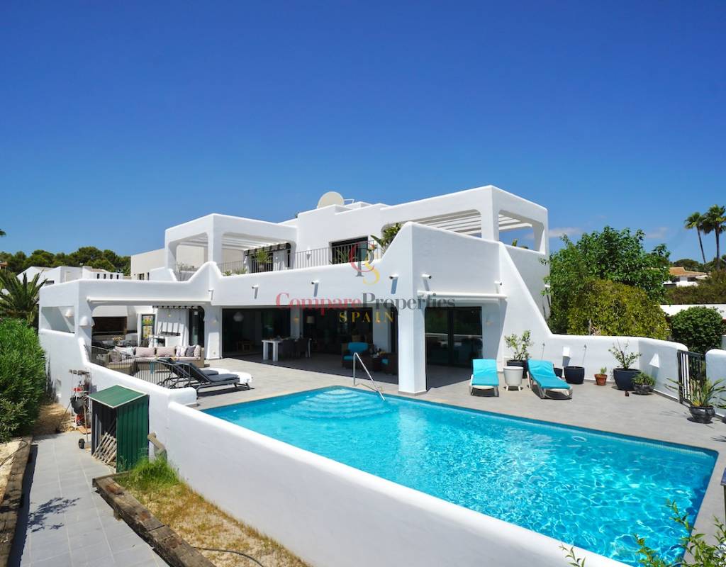 Villa im Ibiza-Stil - schlüsselfertigZentralheizung (Gas) mit Heizkörpern und einem HolzofenKlimaanlage - warm und kaltNach Süden ausgerichtet Schöner Meerblick und freie SichtCarport und Parkplatz abseits der StraßeSchöner, pflegeleichter GartenSchwimmbad und SommerkücheAufzugUnterbau & Lagerung