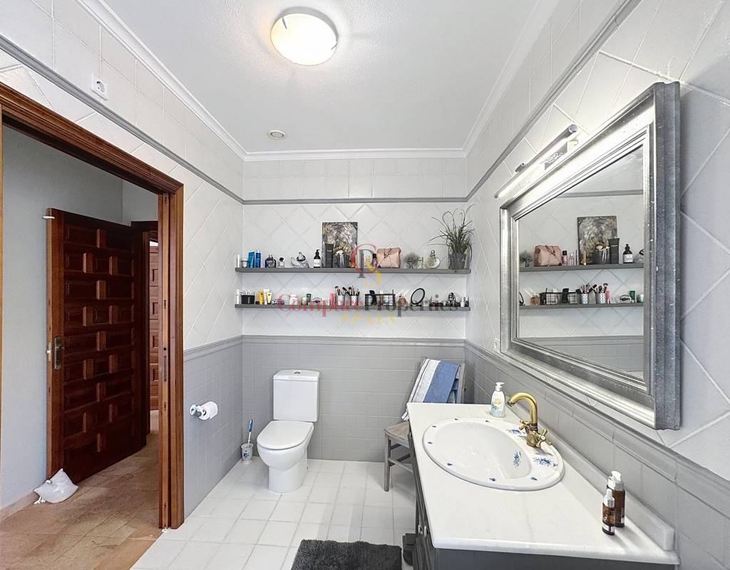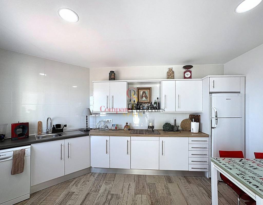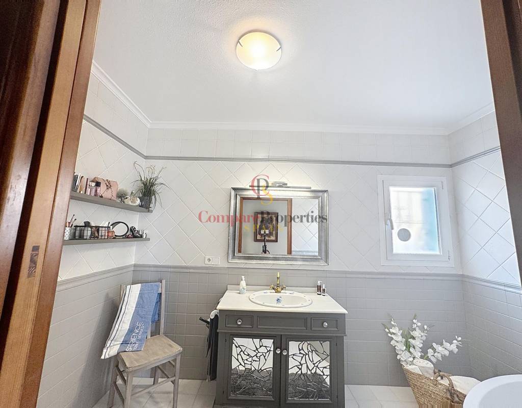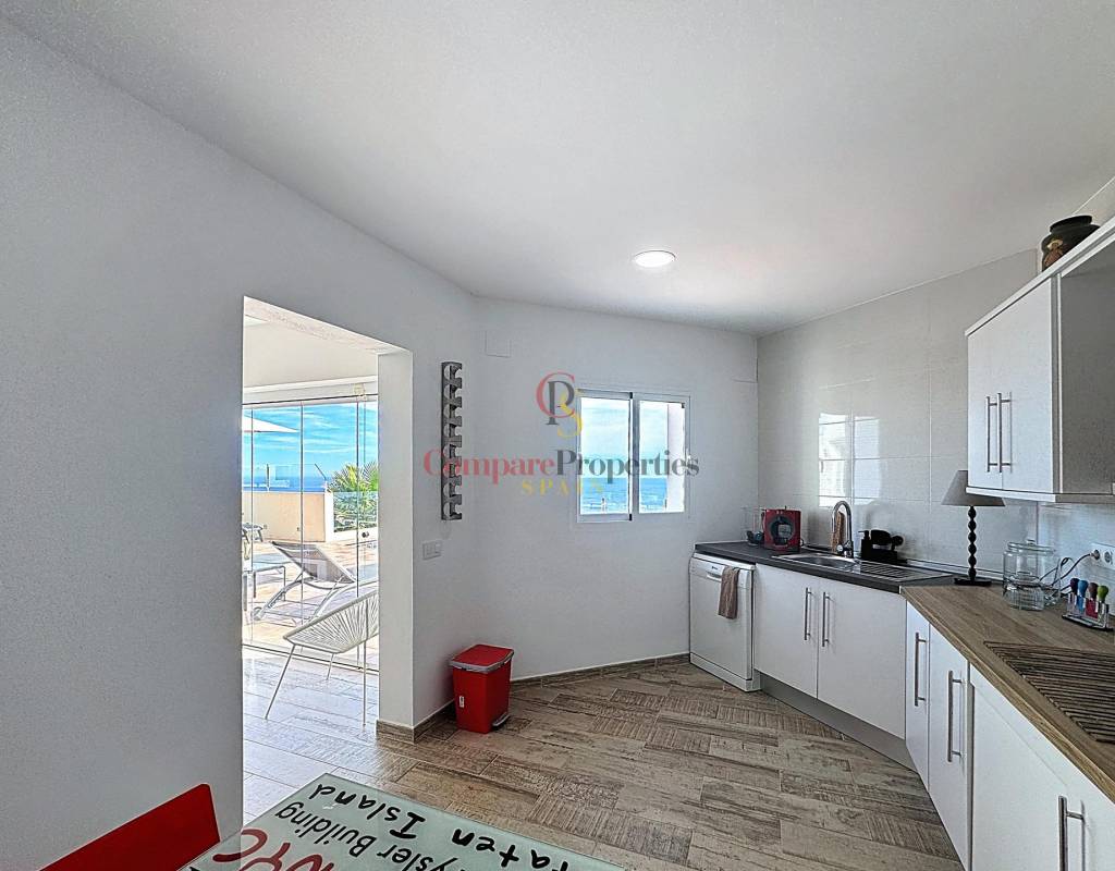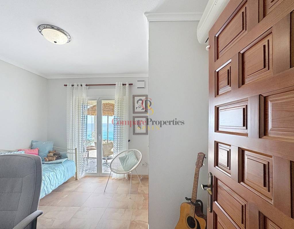 Zwei Doppelschlafzimmer mit Einbauschränken, eines davon mit Meerblick.Komplettes Badezimmer und Waschküche mit Fenster.Hauptschlafzimmer mit Bad en suite, Ankleidezimmer und direktem Zugang zur Terrasse.Offene Küche, die zum Esszimmer hin offen ist, mit direktem Zugang zur überdachten Terrasse mit Meerblick.Wohnzimmer mit Kamin, das in zwei Bereiche unterteilt ist: einen Fernsehbereich und einen weiteren, der als Panoramablick konzipiert ist, von dem aus Sie Cabo de la Nao, Ibiza und den Torre del Portet sehen können.ErdgeschossEine Außentreppe führt ins Erdgeschoss, wo Sie die Poolterrasse und einen gemütlichen Gästebereich finden: