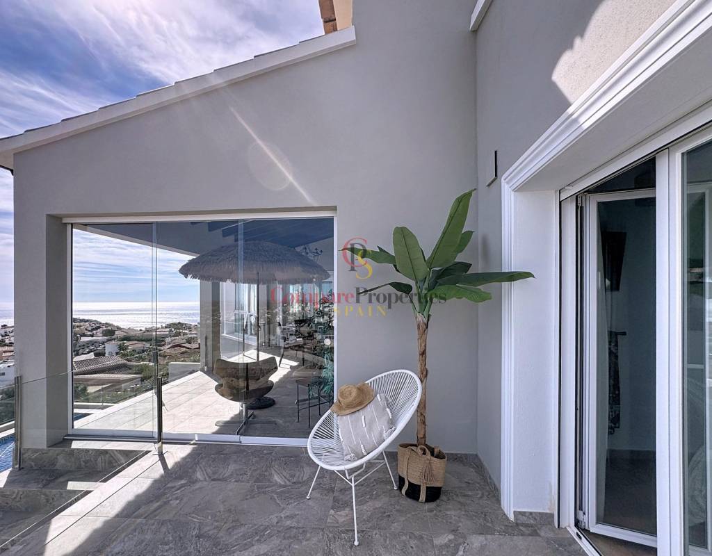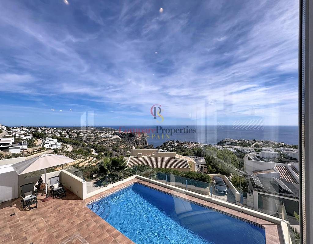 Spektakuläre mediterrane Villa mit Panoramablick auf das Meer in Cumbre del SolEine einzigartige Immobilie mit mediterranem CharmeDiese exklusive Villa im mediterranen Stil steht imposant auf einem 803 m² großen Grundstück in der Wohngegend Lirios, in der prestigeträchtigen Urbanisation Cumbre del Sol, in der Gemeinde Benitachell, zwischen Jávea und Moraira. Von seiner erhöhten Lage aus bietet es einen atemberaubenden Panoramablick auf das Meer, das Cabo de la Nao, die Insel Ibiza am Horizont und den Torre Vigia del Portet de Moraira.