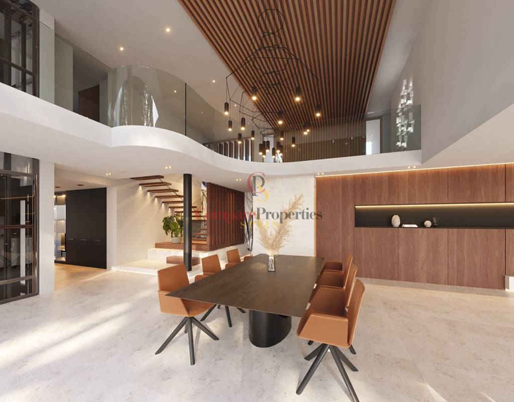 In privilegierter Lage der exklusiven Wohnanlage „Jazmines“ thront die Villa Marblau, eine Immobilie, die Luxus und Privatsphäre auf ein neues Level hebt. Ihre moderne Architektur, geprägt von klaren Linien und edlen Materialien, verschmilzt harmonisch mit der mediterranen Landschaft und schafft ein Wohnambiente von stilvoller Ruhe und zeitloser Eleganz.Der Zugang zur Villa erfolgt über das oberste Stockwerk, wo ein großzügiger, überdachter Außenstellplatz sowie eine geschlossene Garage mit Platz für mehrere Fahrzeuge zur Verfügung stehen. Von hier aus führt die Eingangshalle in die Ruhebereiche des Hauses, die über einen Aufzug und eine elegante Innentreppe mit den weiteren Ebenen verbunden sind. Dadurch werden höchster Komfort und eine durchdachte Raumnutzung sichergestellt.Die Villa erstreckt sich über drei Etagen und umfasst insgesamt fünf Schlafzimmer und neun Badezimmer. Das Herzstück bildet das offene Wohn-Esszimmer im Erdgeschoss, das nahtlos mit der Designerküche mit zentraler Kochinsel in Nussbaum und Anthrazit verschmilzt. Auf derselben Ebene befindet sich die exklusive Master-Suite mit Ankleidezimmer, privatem Bad und direktem Zugang zur Terrasse. In der oberen Etage bieten drei weitere Schlafzimmer mit Bad en suite und privaten Terrassen höchsten Komfort für Gäste. Das Untergeschoss ist ganz dem Wohlbefinden gewidmet: ein Heimkino mit Surround-System, ein Fitnessbereich, ein beheizter Innenpool, Sauna und Hamam laden zur Entspannung ein. Außerdem befindet sich hier ein voll ausgestattetes Gästestudio mit Küche, Wohnbereich und einem zusätzlichen Schlafzimmer mit eigenem Bad.Die Villa Marblau verfügt über modernste Premium-Technologie: Kanal-Klimaanlage mit Mitsubishi Electric®-Technologie, Fußbodenheizung mit Ecodan-Hybridsystem, Smart-Home-Steuerung, wärmegedämmte Außenverglasung mit Sonnenschutz, integrierte Geräten von Marken wie Miele und Siemens sowie exklusive Lichtgestaltung von FLOS und Arkoslight. Die Badezimmer zeichnen sich durch schlichte Raffinesse aus. Sie sind mit wandhängenden Sanitäranlagen, Aufsatzwaschbecken, integrierter Armaturentechnik und großformatigen Wandverkleidungen in warmen und edlen Farbtönen ausgestattet.Von der Terrasse aus eröffnet sich ein ständig wechselndes Panorama: das Meer, der markante Felsen Peñón de Ifach und die Küstenlinie formen ein lebendiges Kunstwerk. Der endlos lange Pool scheint mit dem Himmel zu verschmelzen und lädt zur Entschleunigung und zum stilvollen Leben am Mittelmeer ein.
