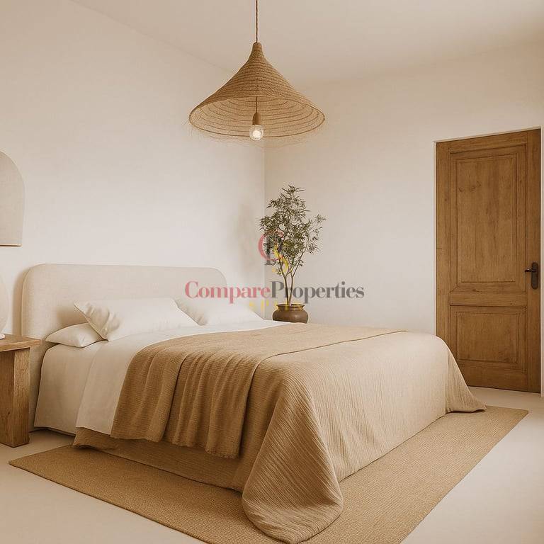 Das Haus ist mit einem Fokus auf natürliches Licht und Komfort gestaltet. Es verfügt über drei Schlafzimmer und drei vollständige Badezimmer, die sicherstellen, dass jeder Raum seine eigene Privatsphäre oder Zugang zu einem Badezimmer hat. Der Wohnbereich integriert ein moderna WohnzimmerEsszimmer mit einer offenen Küche und direktem Zugang zu den Poolbereichen.