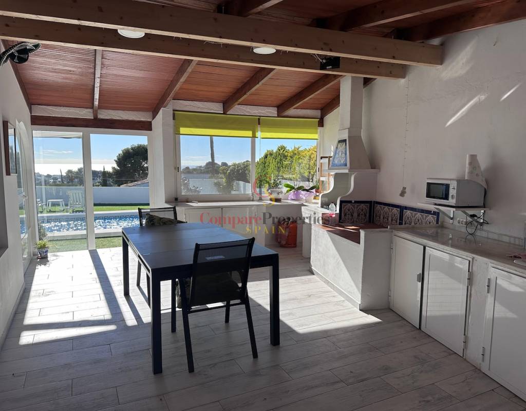 Von der Naya aus haben Sie auch Zugang zu einer überdachten Sommerküche und einem Essbereich, der sich perfekt für gesellige Runden eignet. Dieser führt auf eine große Poolterrasse mit einem großzügigen Swimmingpool und offenem Meerblick, die einen ausgezeichneten Raum bietet, um den mediterranen Lebensstil zu genießen. Der überdachte Grillbereich ist direkt mit dem Haus verbunden, sodass Sie das ganze Jahr über bequem und angenehm im Freien essen können.