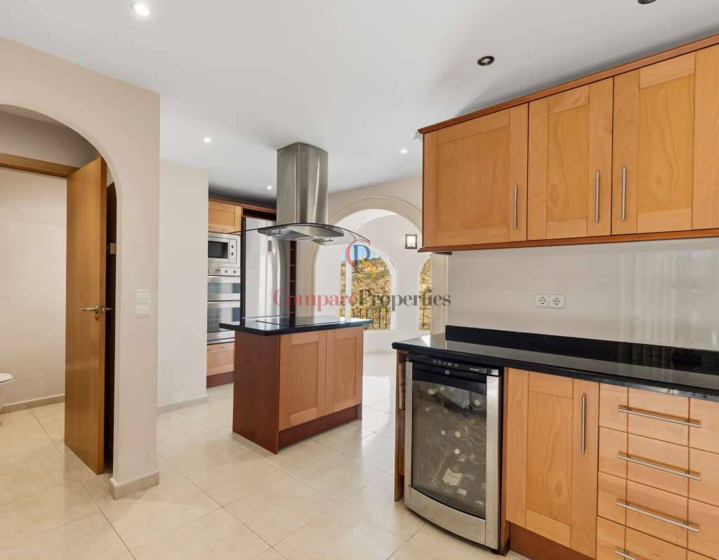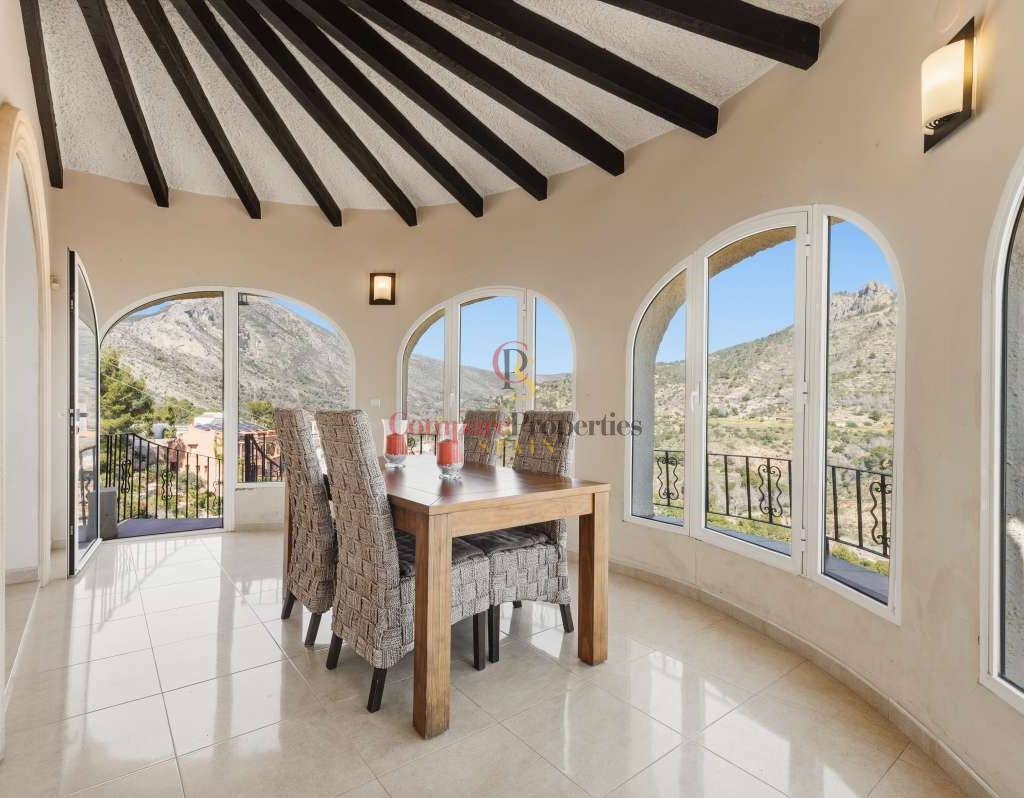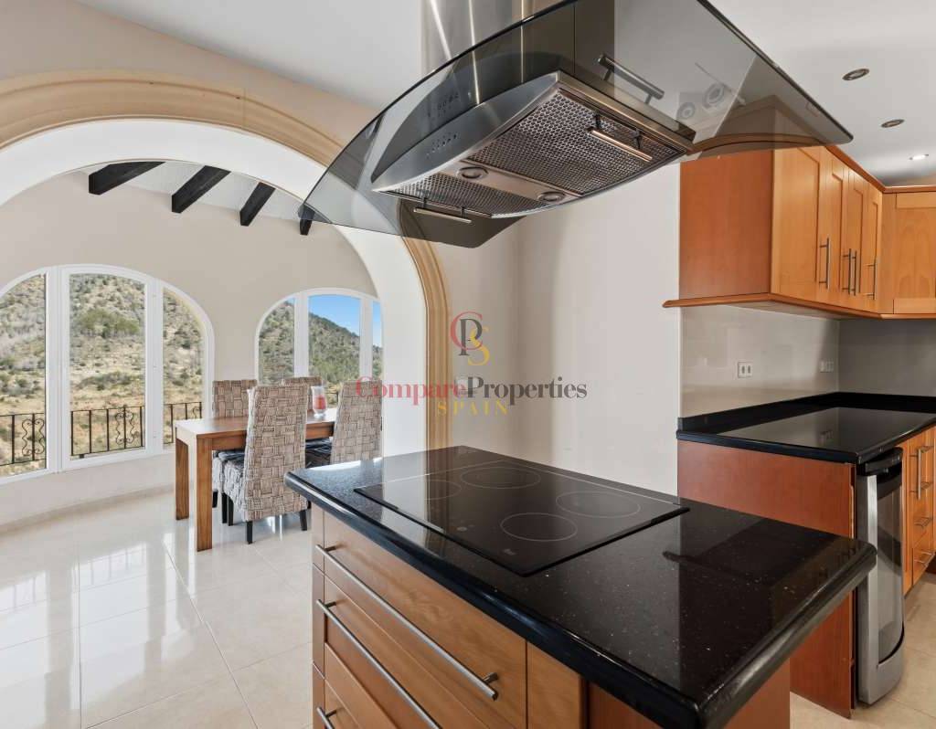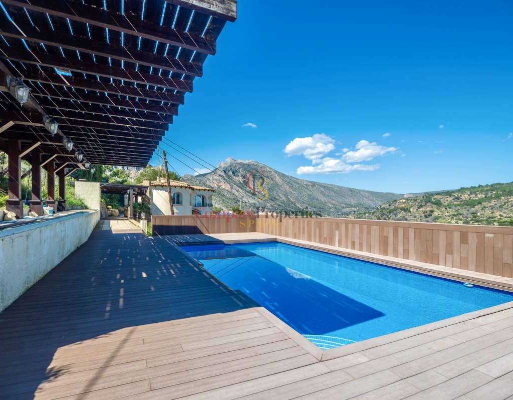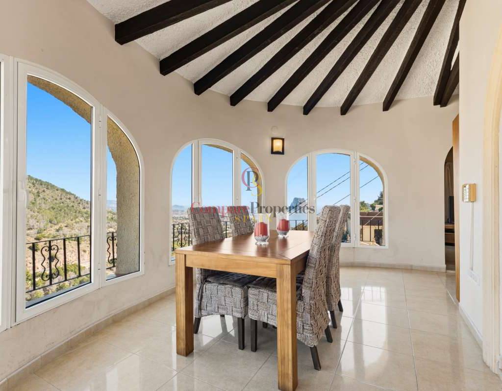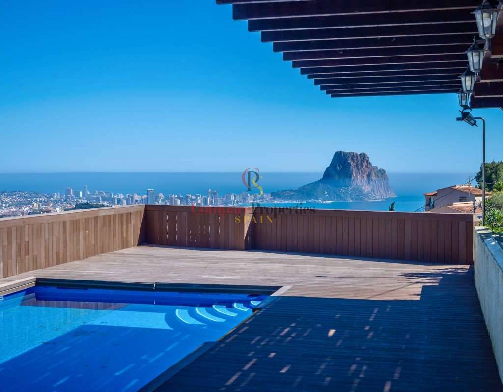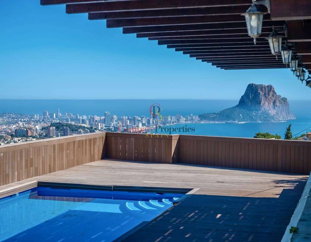 In der begehrten Wohngegend Maryvilla in Calpe gelegen, bietet diese charmante Villa die perfekte Kombination aus Privatsphäre, Ruhe und atemberaubendem Panoramablick auf das Meer. In ruhiger Hanglage befindet sich das Anwesen nur wenige Fahrminuten vom Strand, dem Yachthafen, Restaurants, Bars und dem lebhaften Stadtzentrum entfernt und ist somit ideal als Feriendomizil und Kapitalanlage. Die 1970 erbaute und 2012 innen komplett renovierte Villa liegt auf einem großzügigen Grundstück von 1.733 m² mit einer Wohnfläche von 285 m². Das Anwesen erstreckt sich über zwei separate Ebenen mit jeweils eigenem Eingang und bietet somit hervorragende Flexibilität für Gäste oder zur Vermietung. Die Hauptebene verfügt über einen hellen und geräumigen Wohnbereich mit viel Tageslicht dank großer Fenster, einen Essbereich und ein gemütliches Wohnzimmer mit Kamin – perfekt für entspannte Abende. Auf dieser Etage befinden sich außerdem eine voll ausgestattete Küche, ein Gäste-WC und ein Hauptschlafzimmer mit eigenem Bad. Die über eine Treppe erreichbare zweite Ebene bietet einen separaten Wohnbereich mit eigener Küche, einem gemütlichen Wohnzimmer, zwei Schlafzimmern und einem Badezimmer – ideal für die Unterbringung von Familie oder Gästen. Der Außenbereich der Villa ist perfekt auf den mediterranen Lebensstil abgestimmt: Ein privater Swimmingpool mit Sonnenterrasse, ein Grillplatz für Mahlzeiten im Freien und bequeme Parkmöglichkeiten laden zum Verweilen ein. Mehrere Terrassen bieten einen atemberaubenden Panoramablick auf das Meer und die umliegende Landschaft. Dank ihrer ruhigen Lage, der herrlichen Aussicht und der flexiblen Raumaufteilung ist diese Immobilie eine ausgezeichnete Wahl als Ferienhaus und bietet gleichzeitig ein hohes Potenzial für Mieteinnahmen.