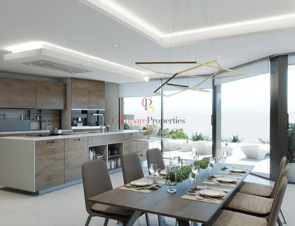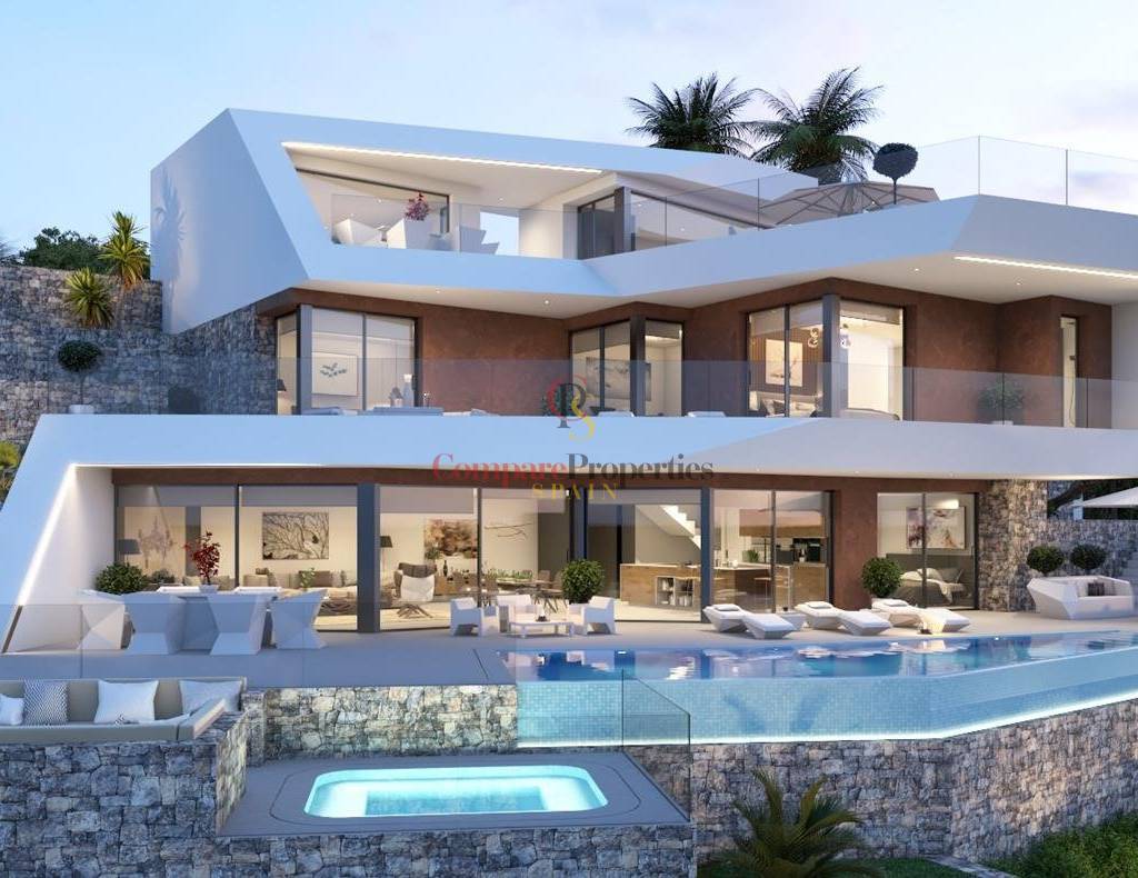 Esta espectacular villa nueva en venta en Benissa disfruta de vistas panorámicas al mar y a la montaña.