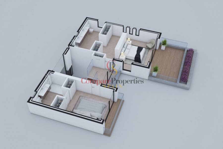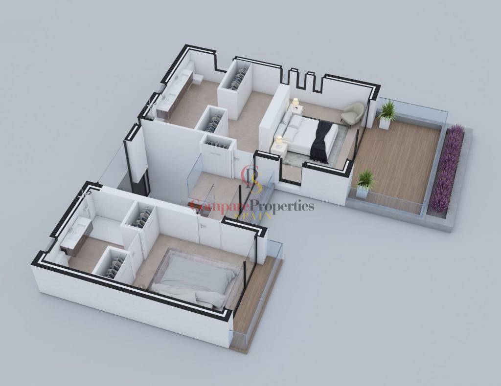 En la planta superior hay otros dos dormitorios, ambos con grandes baños en suite y armarios empotrados y una gran terraza para tomar el sol.