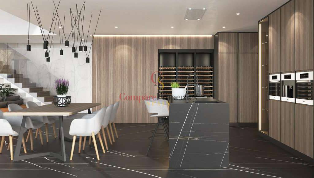 Cocina Dica de alta gama, electrodomésticos Gaggenau, grifería Grohe, carpintería Cortizo Cor Vision Plus, cristales antisolares, persianas automáticas, suelos porcelánicos de gran formato 3,20m x 1,60m, Mi casa, LED, mecanismos eléctricos Bticino.