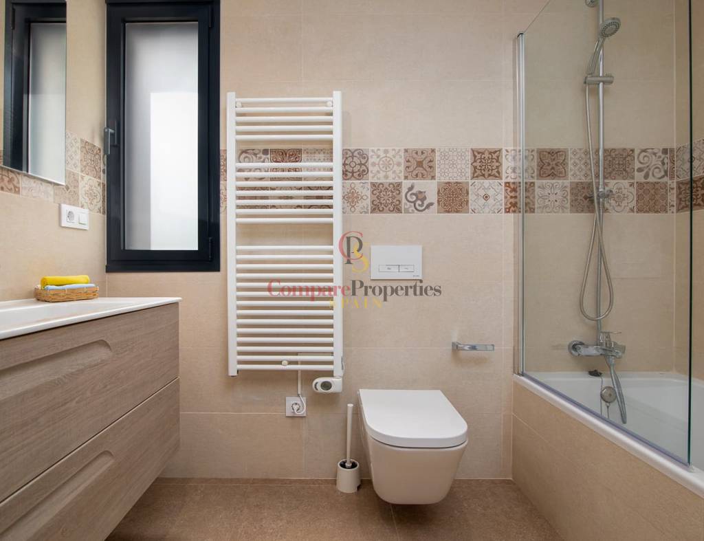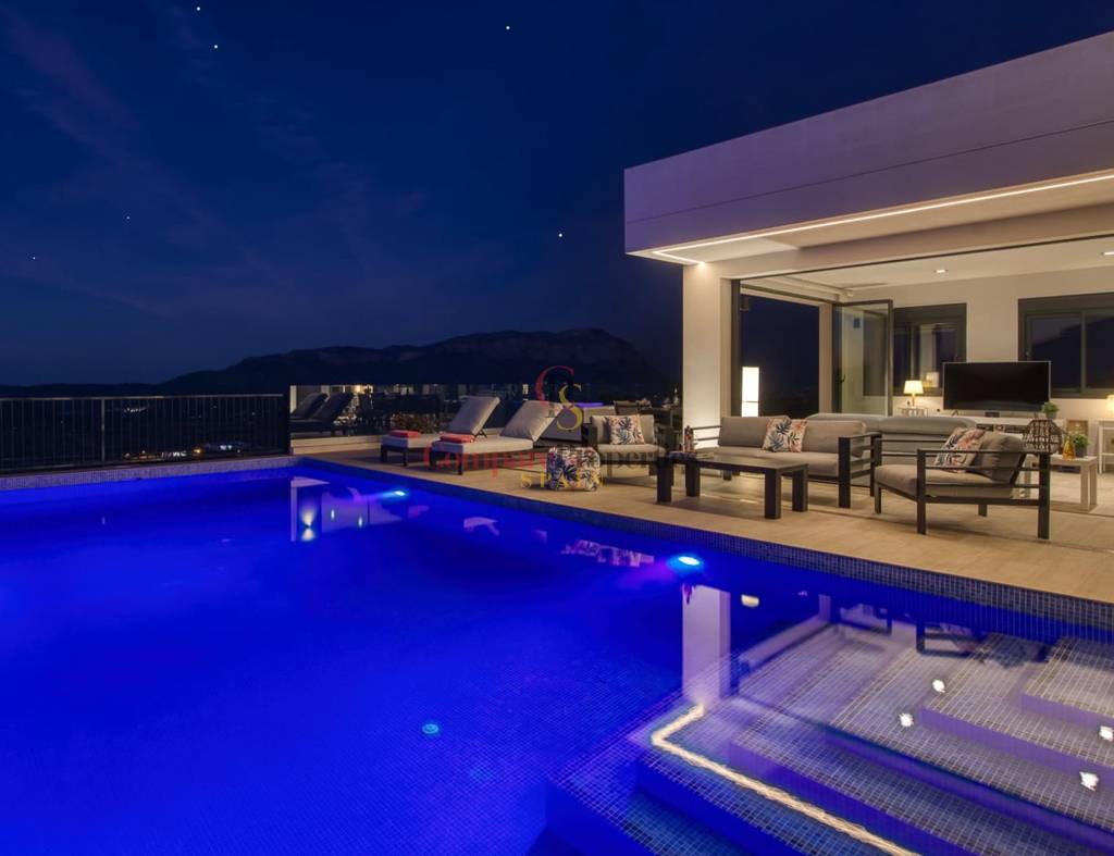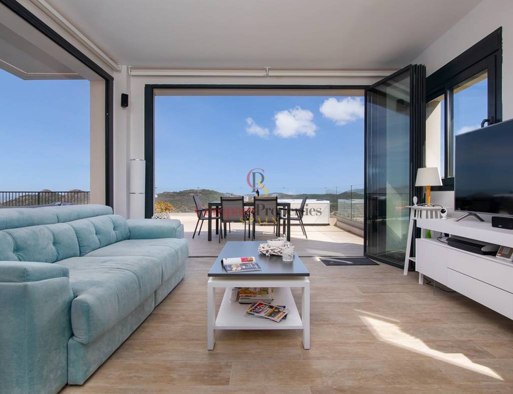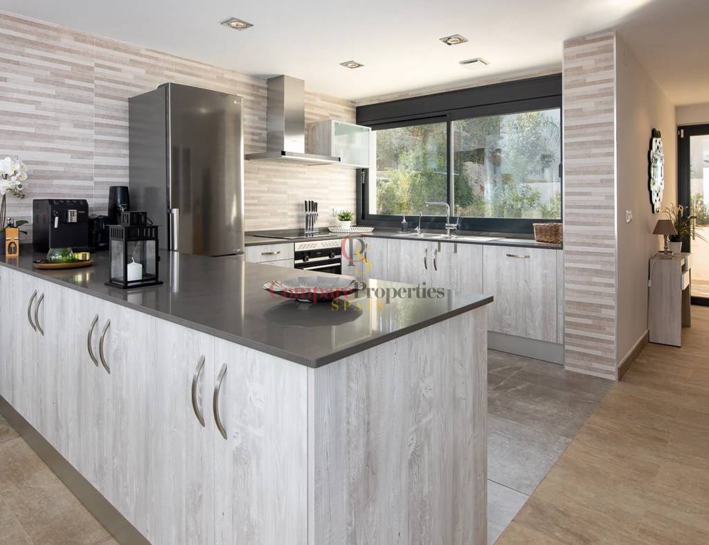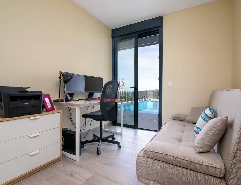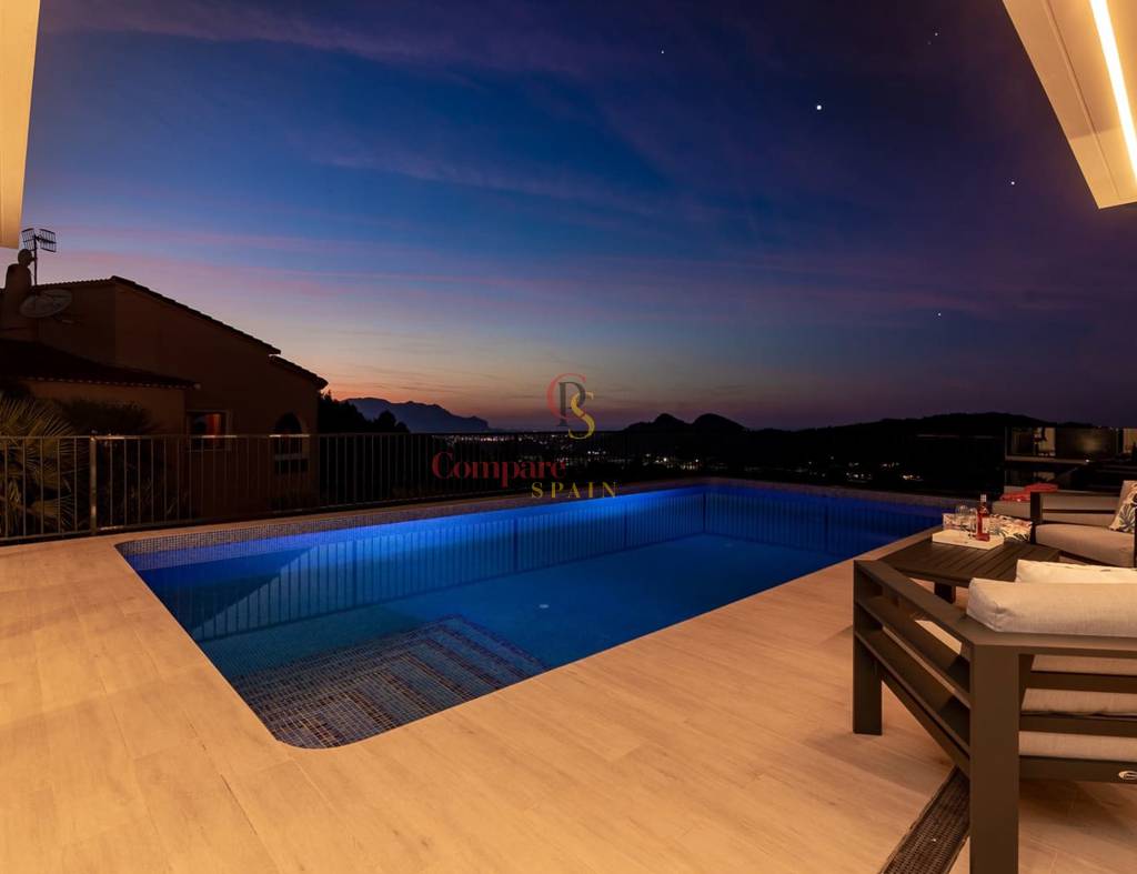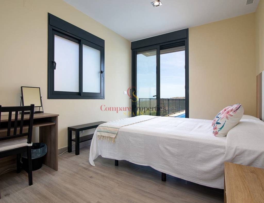 Construida en 2020 sobre una parcela de 720 m2, la vivienda cuenta con 135 m2 y además el sótano. Toda la vivienda se encuentra en una planta, en ella tenemos las 3 habitaciones con magníficas vistas a las montañas, y 2 cuartos de baño (uno de ellos en suite y el otro con ducha). Destaca sobre todo, su gran salón con cocina abierta totalmente acristalado para explotar al máximo las maravillosas vistas. Este cristal se puede replegar para unir el interior con la gran terraza y la piscina de efecto infinity.