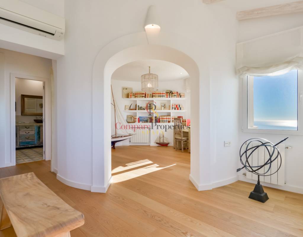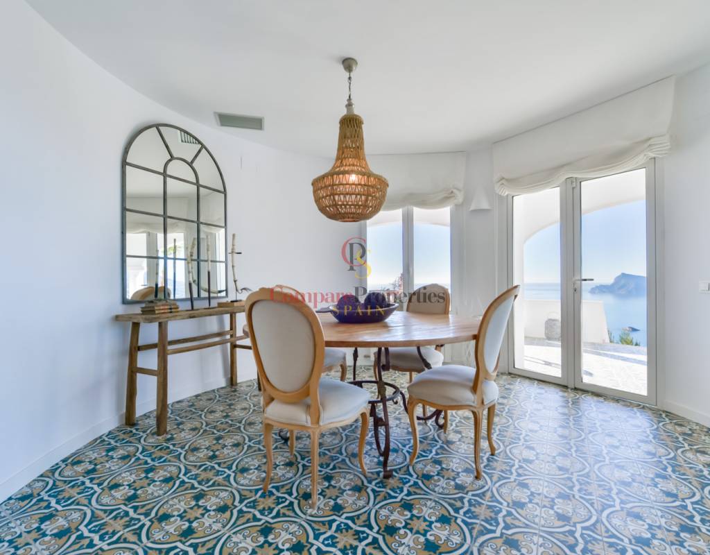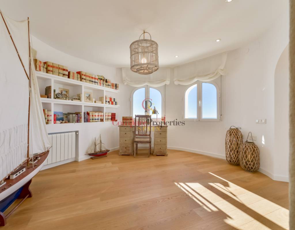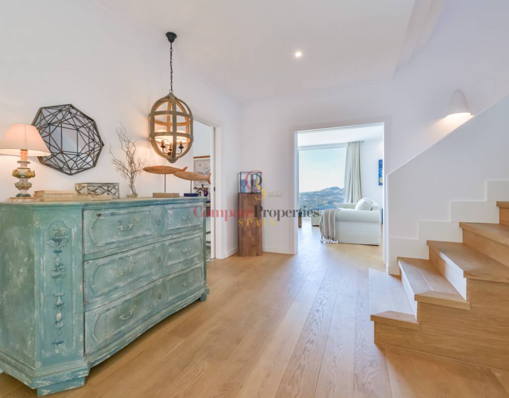 La villa de estilo moderno tiene 2 plantas y consta de una casa principal y una casa de invitados independiente. En la planta baja encontramos el salón con chimenea. Desde el sofá se puede disfrutar del mar Mediterráneo. &.;Las diferentes habitaciones están conectadas por bonitos arcos de Tusca que dan a la casa un aspecto cálido y lujoso. El salón está conectado directamente con el comedor. Aquí también se puede disfrutar de estupendas vistas al mar. Adyacente encontramos la moderna cocina totalmente equipada. Incluso el vestíbulo de esta casa tiene estilo. En este nivel también hay 3 dormitorios y 2 baños y un lavadero. En la planta superior se encuentra el dormitorio principal con baño en suite, vestidor y sauna. Parte de ella se utiliza ahora como oficina. Hay una casa de invitados independiente con distribución diáfana: salón-comedor, cocina completa, dormitorio y baño.