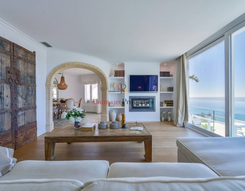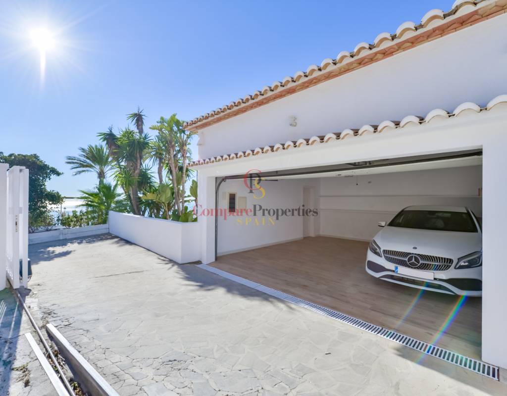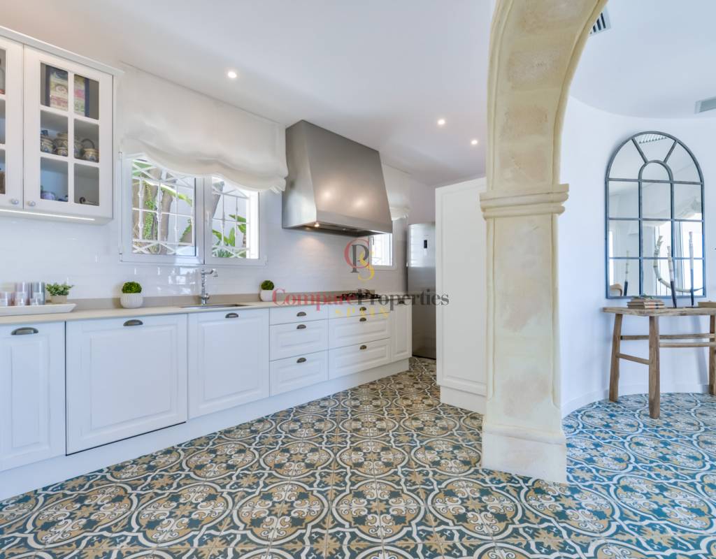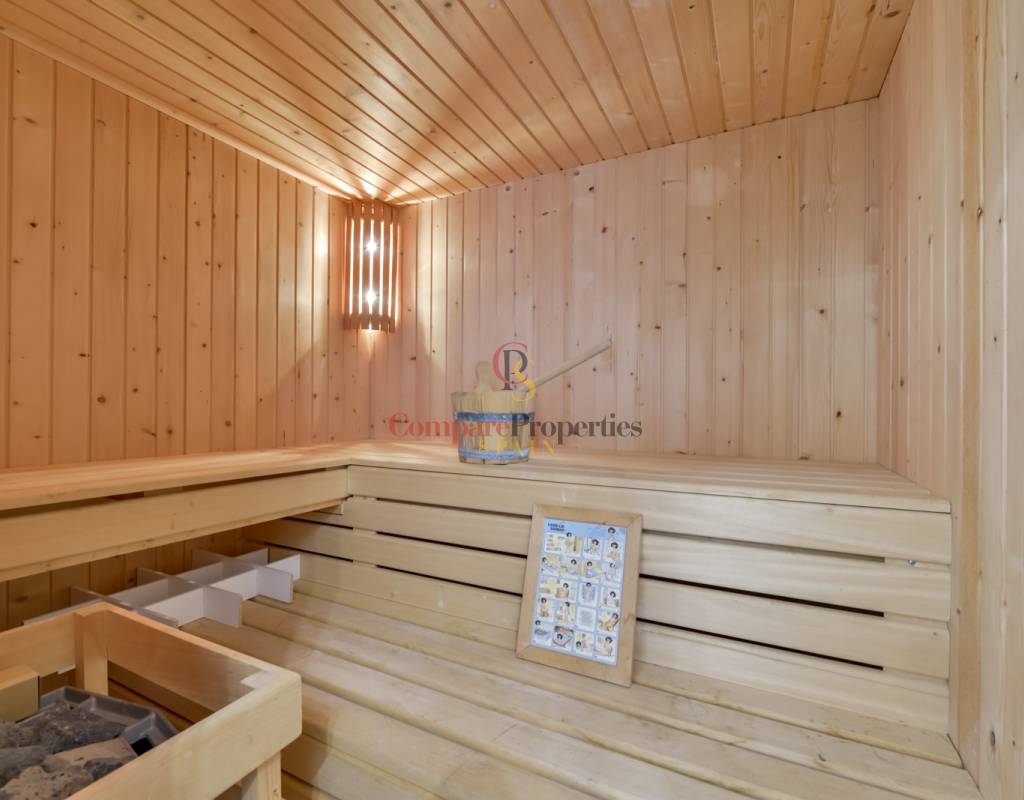La villa de estilo moderno tiene 2 plantas y consta de una casa principal y una casa de invitados independiente. En la planta baja encontramos el salón con chimenea. Desde el sofá se puede disfrutar del mar Mediterráneo. &.;Las diferentes habitaciones están conectadas por bonitos arcos de Tusca que dan a la casa un aspecto cálido y lujoso. El salón está conectado directamente con el comedor. Aquí también se puede disfrutar de estupendas vistas al mar. Adyacente encontramos la moderna cocina totalmente equipada. Incluso el vestíbulo de esta casa tiene estilo. En este nivel también hay 3 dormitorios y 2 baños y un lavadero. En la planta superior se encuentra el dormitorio principal con baño en suite, vestidor y sauna. Parte de ella se utiliza ahora como oficina. Hay una casa de invitados independiente con distribución diáfana: salón-comedor, cocina completa, dormitorio y baño.