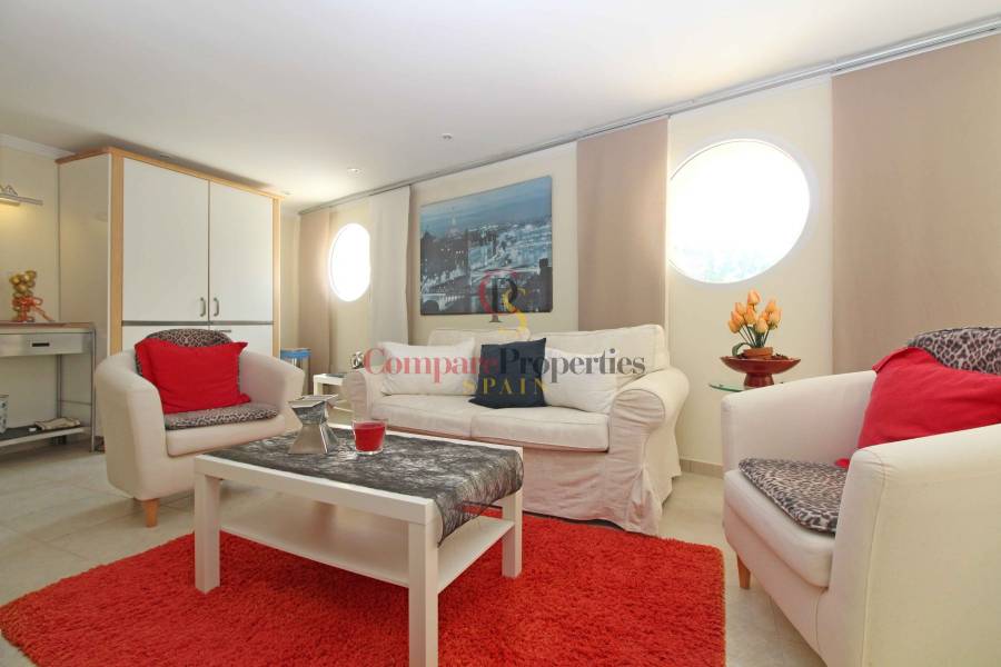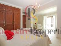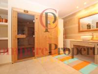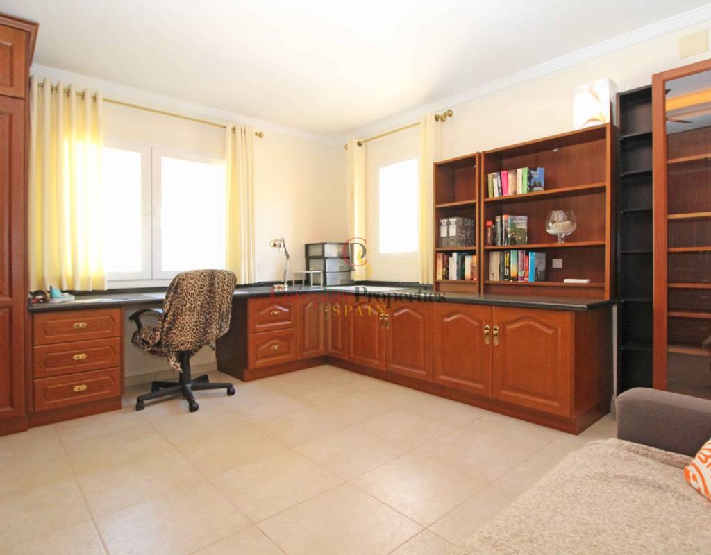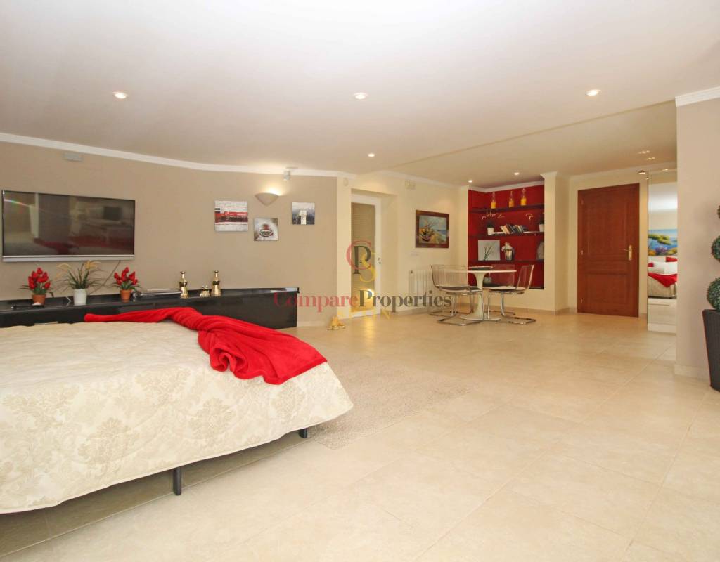 Esta propiedad "debe ver" tiene 2 plantas. La casa principal se encuentra en la planta superior. Una planta más abajo hay una espaciosa casa de invitados. La planta superior consta de un gran salón con llamativa chimenea y acceso directo a la terraza cubierta. El comedor está un escalón más abajo. Hay una cocina totalmente equipada con acceso directo a la terraza. Además, aquí se encuentra el dormitorio principal con baño en suite. Una pequeña escalera (6 escalones) lleva a una habitación que ahora sirve de despacho, pero que también podría utilizarse como vestidor. Los otros 2 dormitorios comparten un cuarto de baño. Por último, hay un aseo de invitados. En la planta baja hay un piso completo y espacioso con salón-comedor, cocina totalmente equipada, cuarto de baño grande con jacuzzi y sauna. Desde el apartamento tiene acceso directo a la terraza de la piscina con magníficas vistas al mar. Lavadero y trastero.