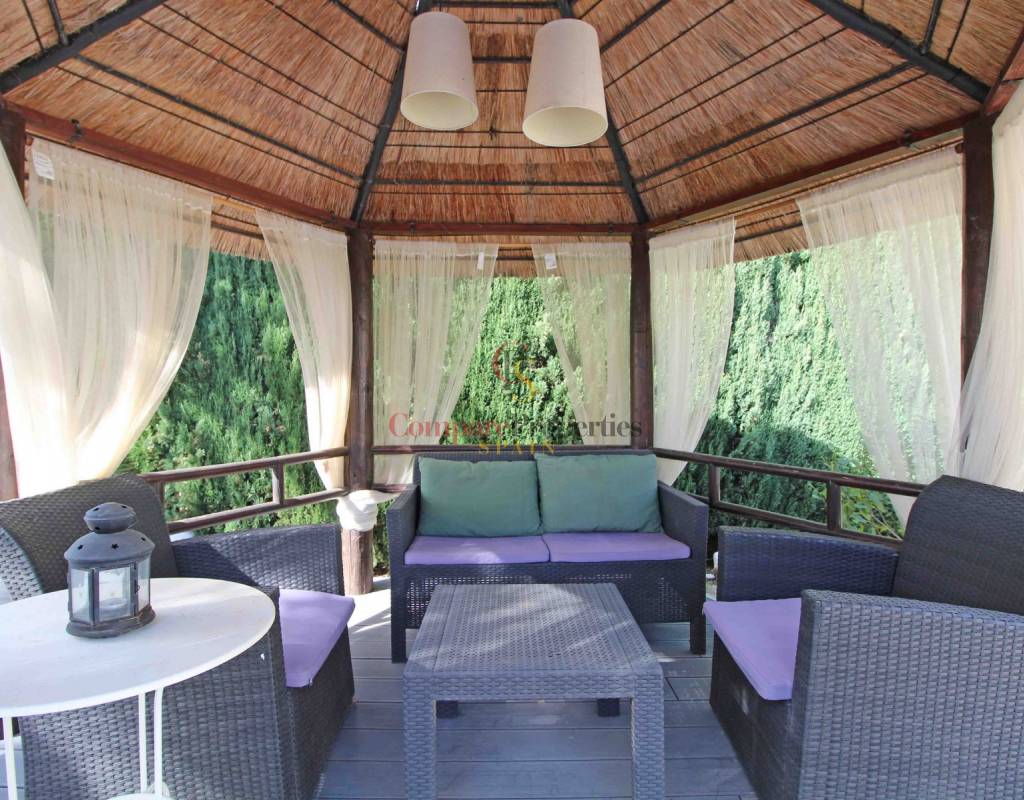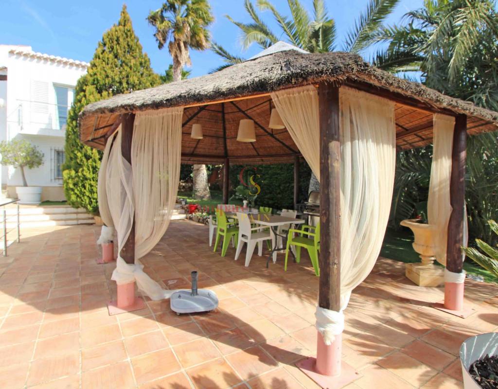 La villa está rodeada por un hermoso jardín verde de bajo mantenimiento con muchas palmeras que le dan un toque mediterráneo veraniego. La piscina es de 10x6 m y hay una ducha exterior. Hay mucho espacio para varias zonas de estar y tumbonas. Muy decorativos son los 2 cenadores tropicales. El lugar perfecto para relajarse y disfrutar del Mediterráneo.&.;