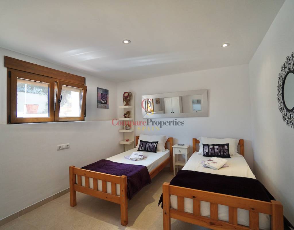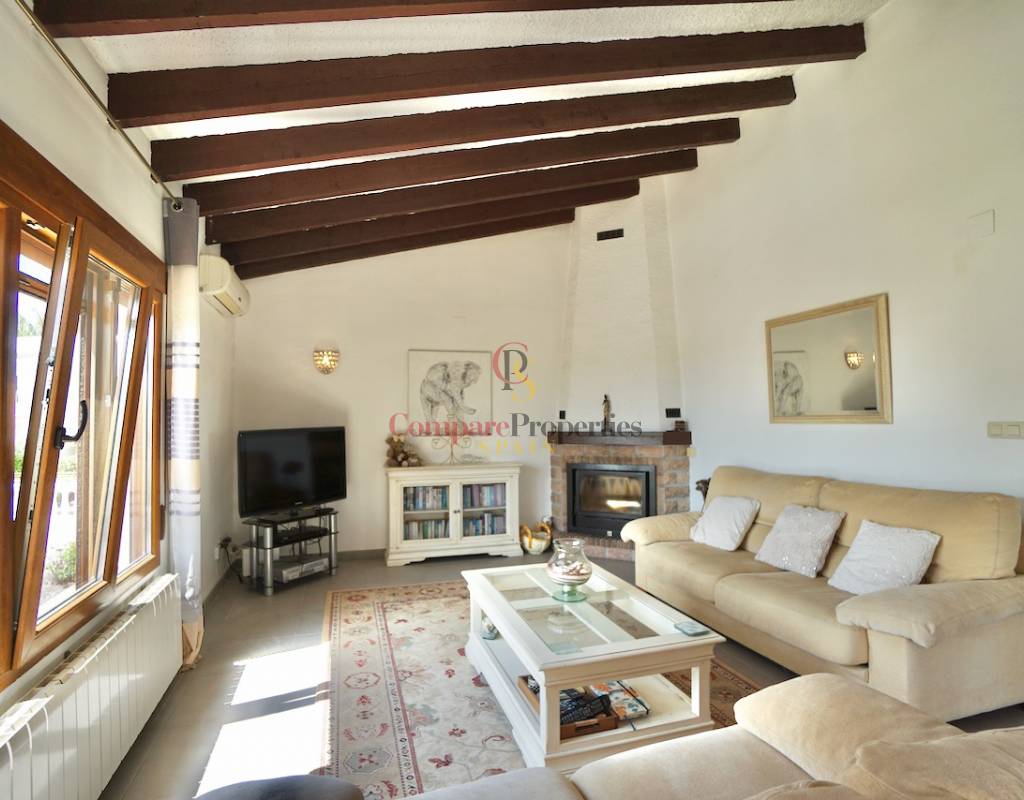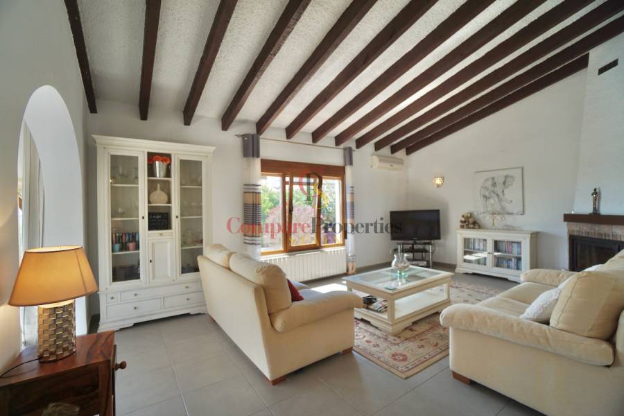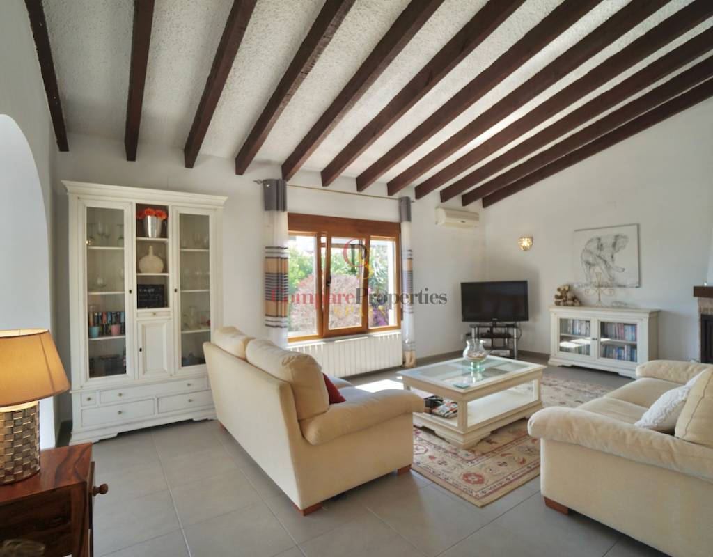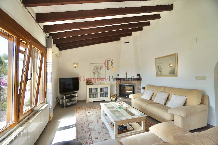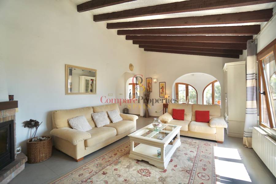 Hay varias zonas para sentarse alrededor de la villa, perfectas para disfrutar del sol o relajarse a la sombra. Frente a la entrada de la villa hay un cenador muy acogedor a la sombra, con sofás de exterior y cubierto de fragante jazmín. Desde aquí entramos en una acogedora sala de recepción con la cocina independiente totalmente equipada a la izquierda. La cocina es moderna y como nueva, con armarios blancos y encimera negra. Otra puerta conduce a la amplia sala de estar con chimenea para las noches más frescas, vigas de madera tradicionales en los techos altos y desde los sofás se tiene una vista abierta y también vistas al mar. En la parte delantera de la villa junto a la sala de estar, hay un encantador comedor independiente que es muy luminoso y brillante con un montón de ventanas. De vuelta a la recepción y a lo largo del pasillo hay un cuarto de baño familiar, un dormitorio doble con armarios empotrados y vistas al jardín, y el dormitorio principal también con armarios empotrados y puertas francesas dobles que se abren a otra terraza.