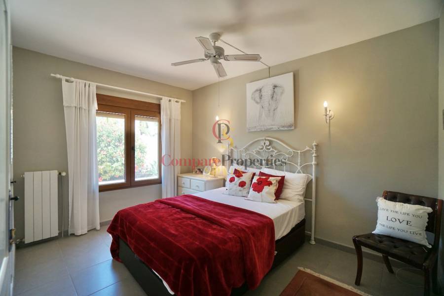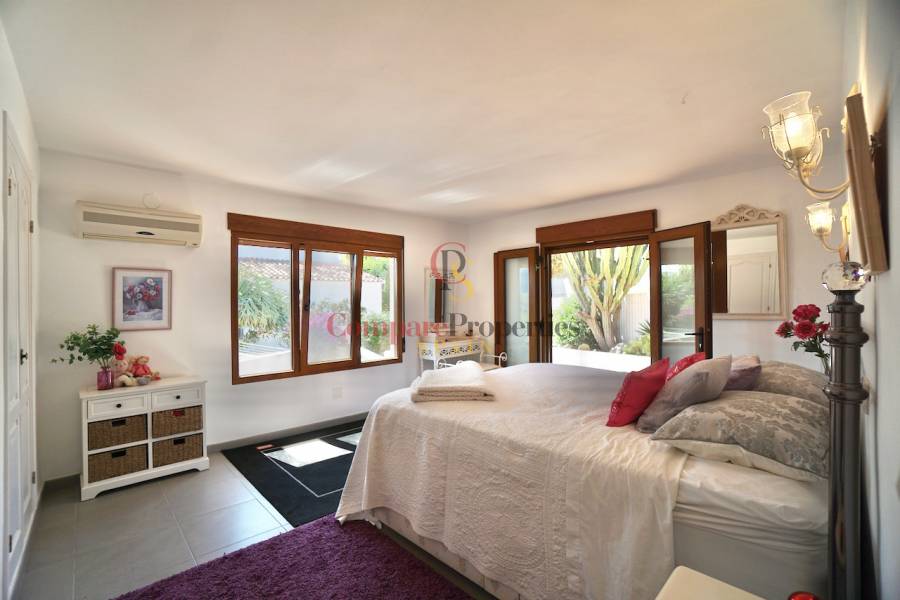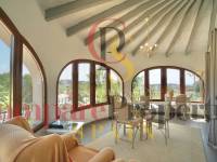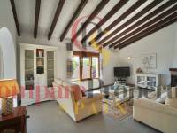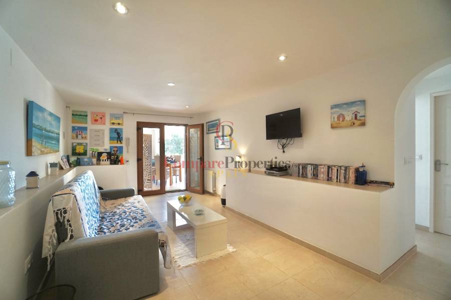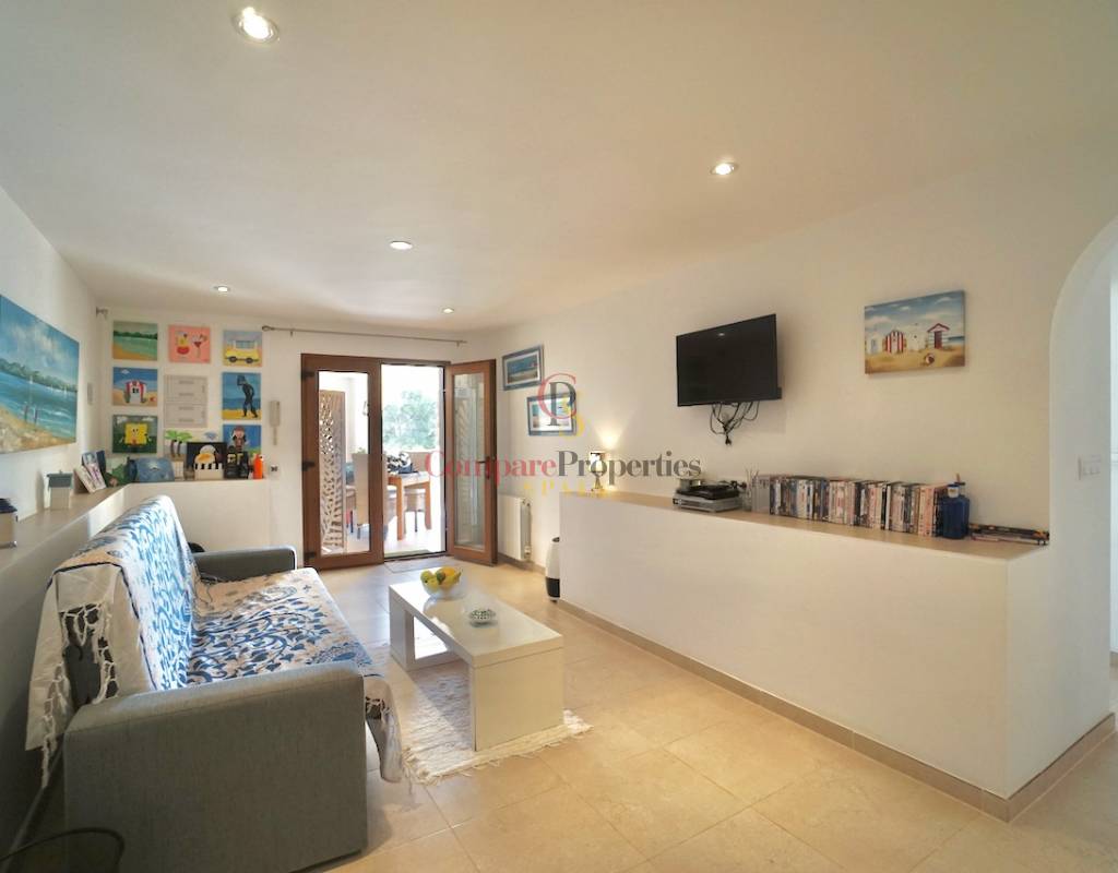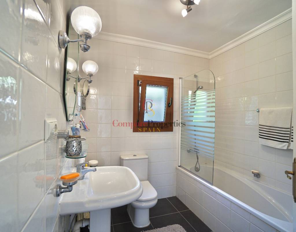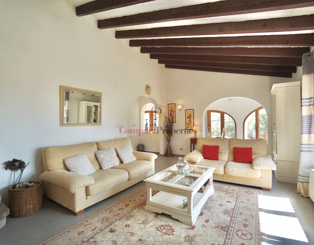 Hay varias zonas para sentarse alrededor de la villa, perfectas para disfrutar del sol o relajarse a la sombra. Frente a la entrada de la villa hay un cenador muy acogedor a la sombra, con sofás de exterior y cubierto de fragante jazmín. Desde aquí entramos en una acogedora sala de recepción con la cocina independiente totalmente equipada a la izquierda. La cocina es moderna y como nueva, con armarios blancos y encimera negra. Otra puerta conduce a la amplia sala de estar con chimenea para las noches más frescas, vigas de madera tradicionales en los techos altos y desde los sofás se tiene una vista abierta y también vistas al mar. En la parte delantera de la villa junto a la sala de estar, hay un encantador comedor independiente que es muy luminoso y brillante con un montón de ventanas. De vuelta a la recepción y a lo largo del pasillo hay un cuarto de baño familiar, un dormitorio doble con armarios empotrados y vistas al jardín, y el dormitorio principal también con armarios empotrados y puertas francesas dobles que se abren a otra terraza.