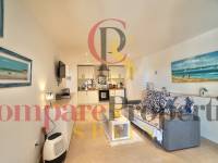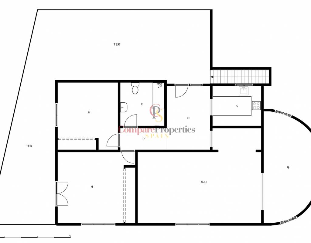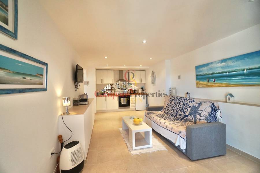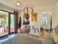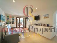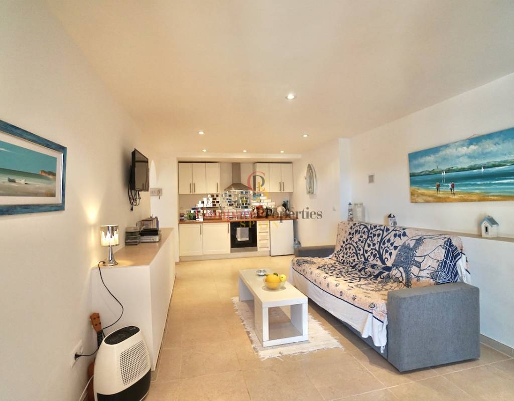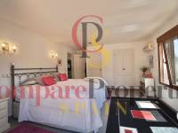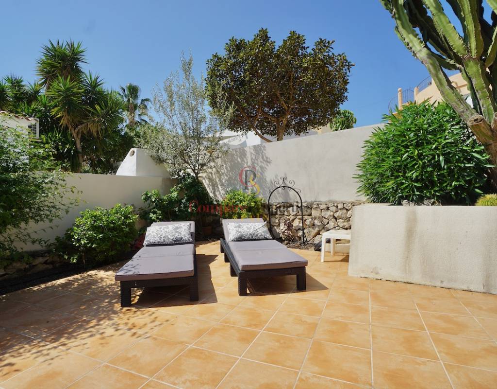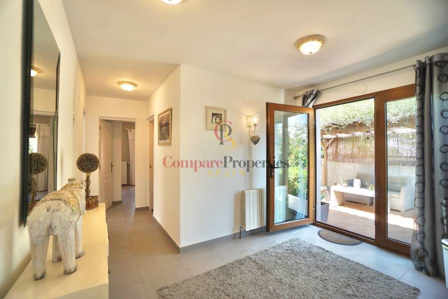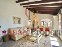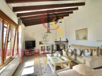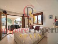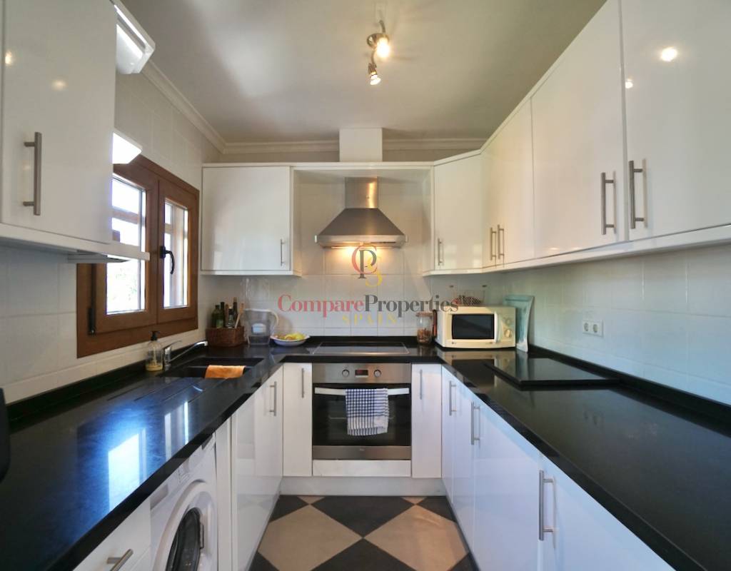 Hay varias zonas para sentarse alrededor de la villa, perfectas para disfrutar del sol o relajarse a la sombra. Frente a la entrada de la villa hay un cenador muy acogedor a la sombra, con sofás de exterior y cubierto de fragante jazmín. Desde aquí entramos en una acogedora sala de recepción con la cocina independiente totalmente equipada a la izquierda. La cocina es moderna y como nueva, con armarios blancos y encimera negra. Otra puerta conduce a la amplia sala de estar con chimenea para las noches más frescas, vigas de madera tradicionales en los techos altos y desde los sofás se tiene una vista abierta y también vistas al mar. En la parte delantera de la villa junto a la sala de estar, hay un encantador comedor independiente que es muy luminoso y brillante con un montón de ventanas. De vuelta a la recepción y a lo largo del pasillo hay un cuarto de baño familiar, un dormitorio doble con armarios empotrados y vistas al jardín, y el dormitorio principal también con armarios empotrados y puertas francesas dobles que se abren a otra terraza.