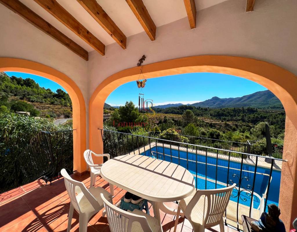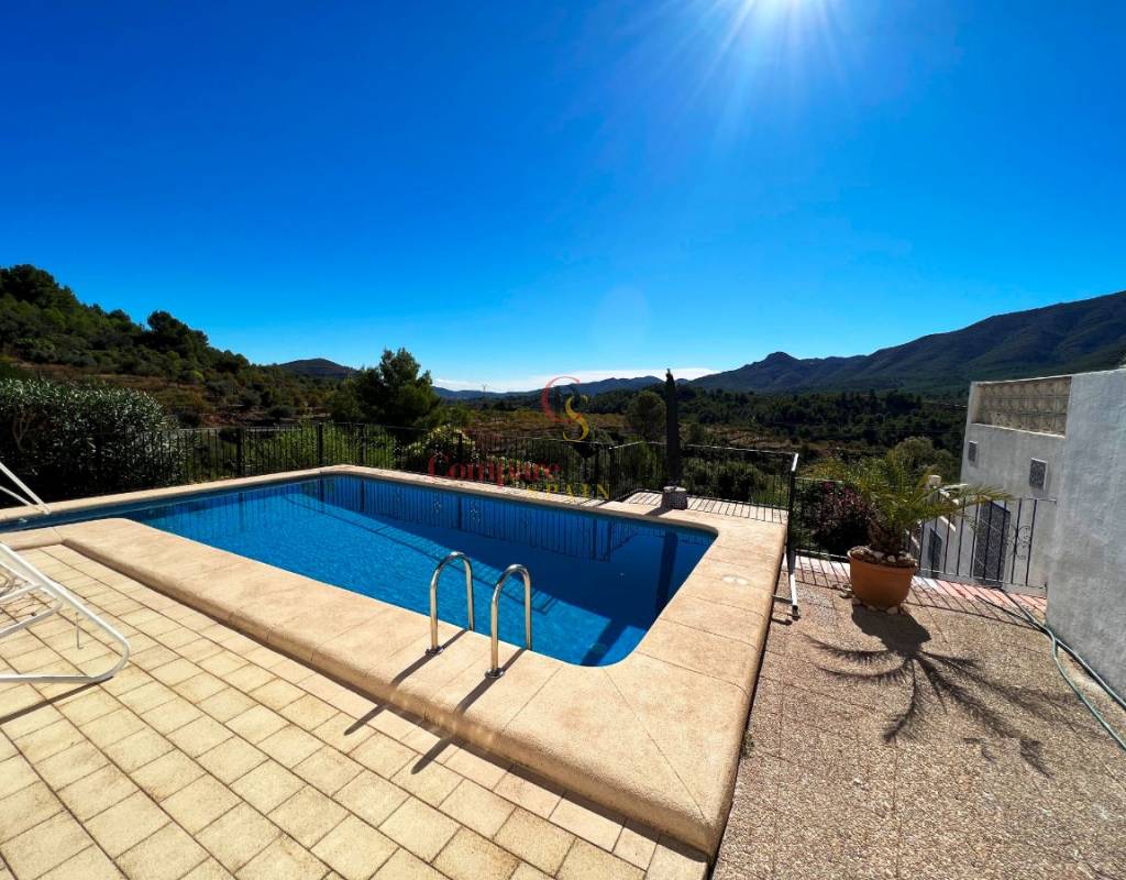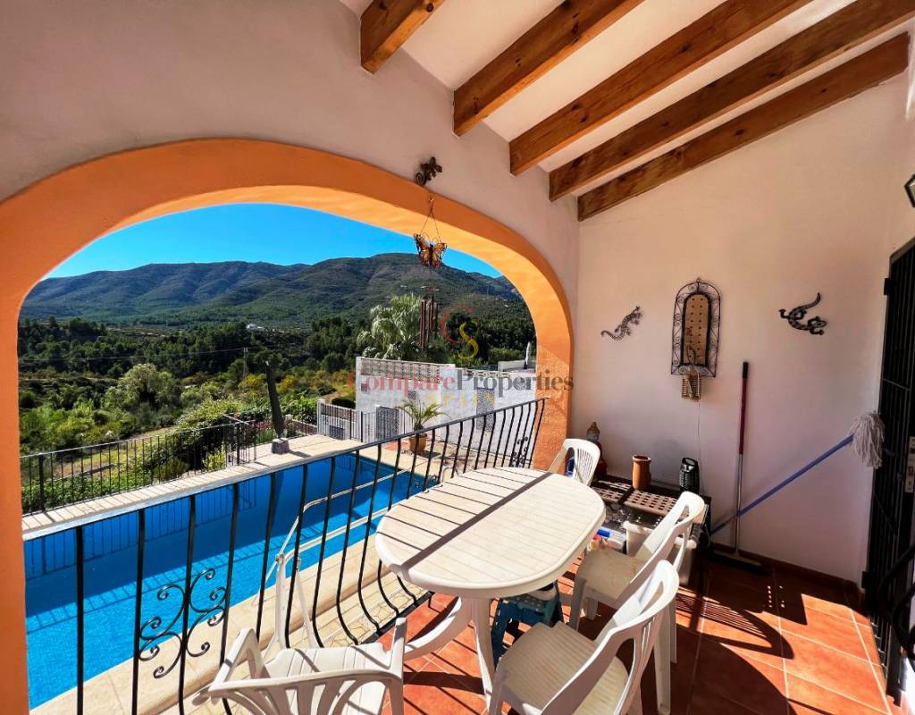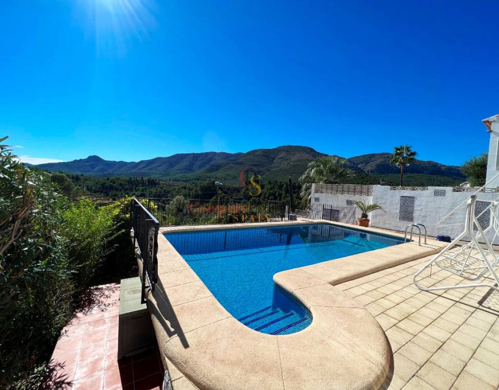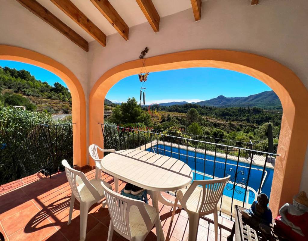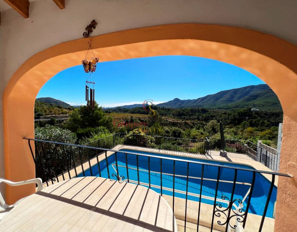 Primera línea, villa independiente con fabulosas vistas orientadas al sur a través del valle de Jalón. El alojamiento consta de un vestíbulo de entrada que conduce a una cocina abierta de estilo americano equipada, un salón comedor con chimenea de piedra Tosca, techos con vigas de madera, puerta exterior que conduce a una naya cubierta privada con fantásticas vistas sobre el valle y sobre la piscina y la terraza. Perfecto para cenar al aire libre. Hay un pasillo, con almacenamiento, a un dormitorio doble con armarios empotrados, un baño familiar, un dormitorio doble con armarios empotrados, y un cuarto de ducha. En el exterior hay una piscina de 8 x 4 m2 con una zona de solárium privada con azulejos que desvían el calor, una barbacoa incorporada y una terraza de nivel inferior con jardines mediterráneos, llena de arbustos, flores y su propia parra. Todo el jardín tiene su propio sistema de riego. La propiedad se encuentra en un tranquilo callejón sin salida. Esta propiedad se beneficia de la calefacción central de gas, doble acristalamiento, aislamiento de la pared de la cavidad, mosquiteros, aparcamiento en la calle, y el almacenamiento. Ver es muy recomendable para apreciar la primera línea, wow factor de puntos de vista.