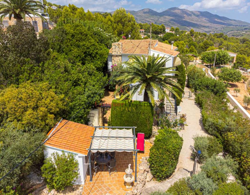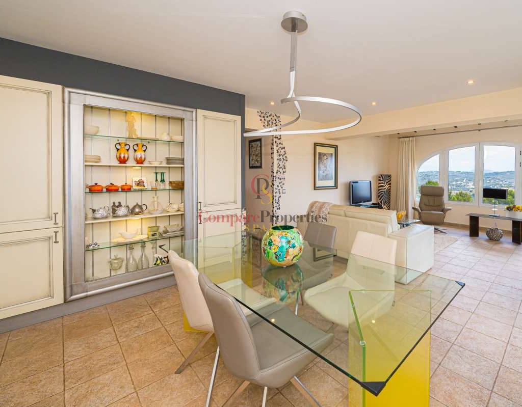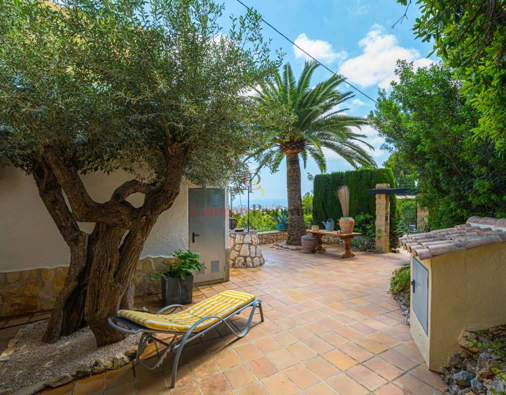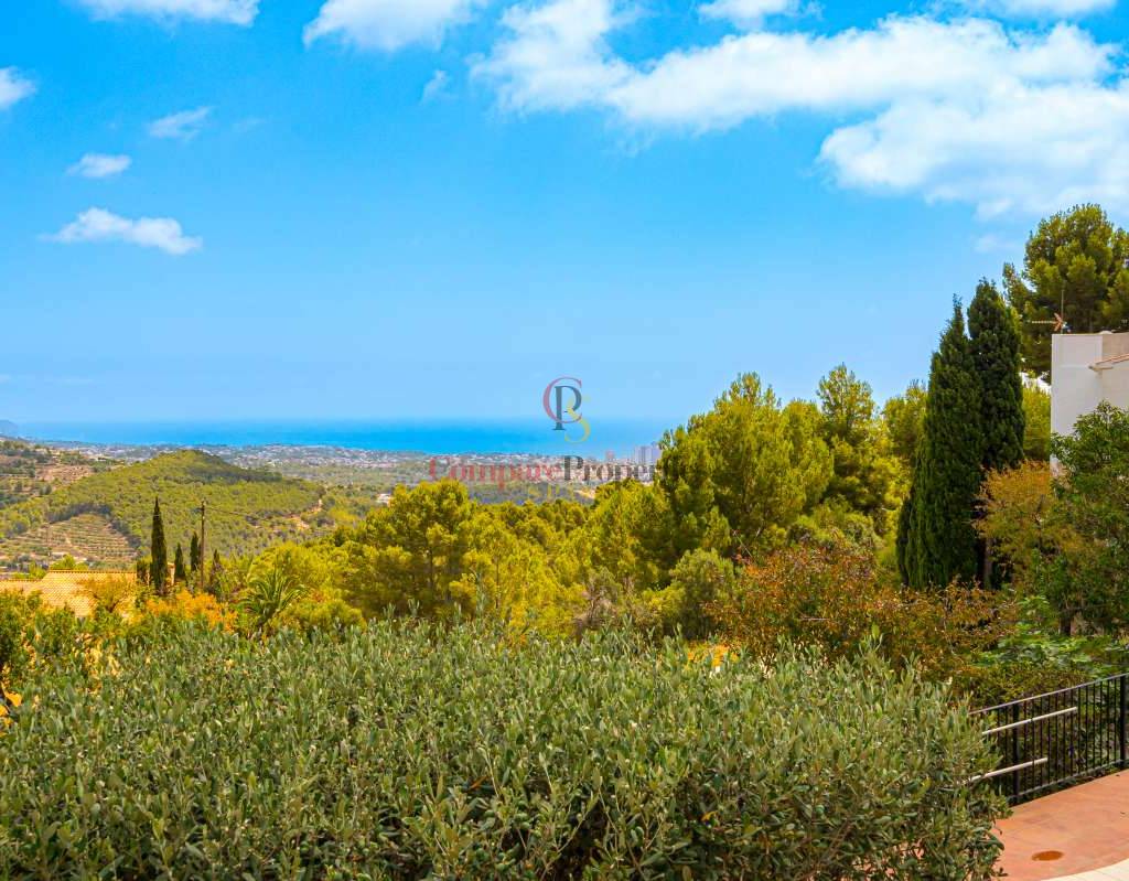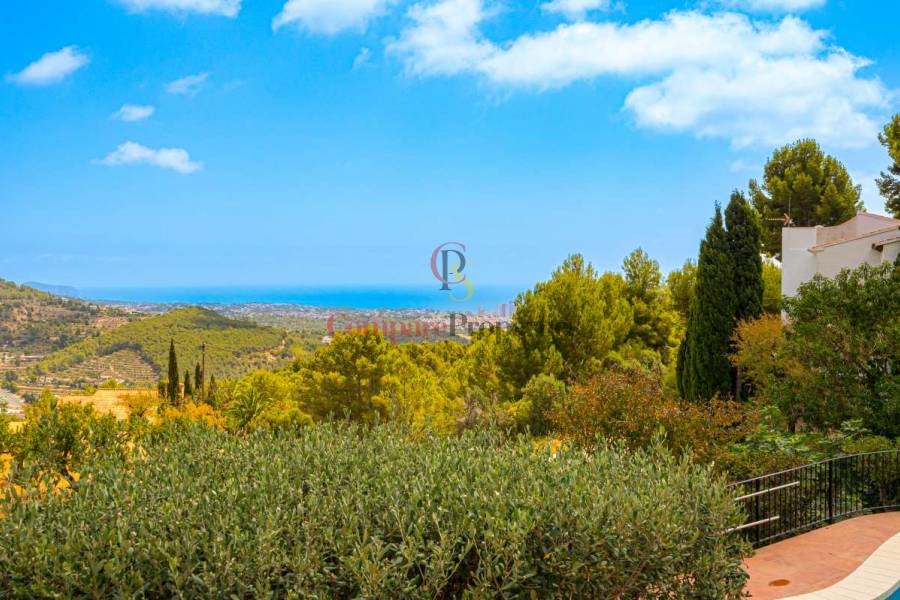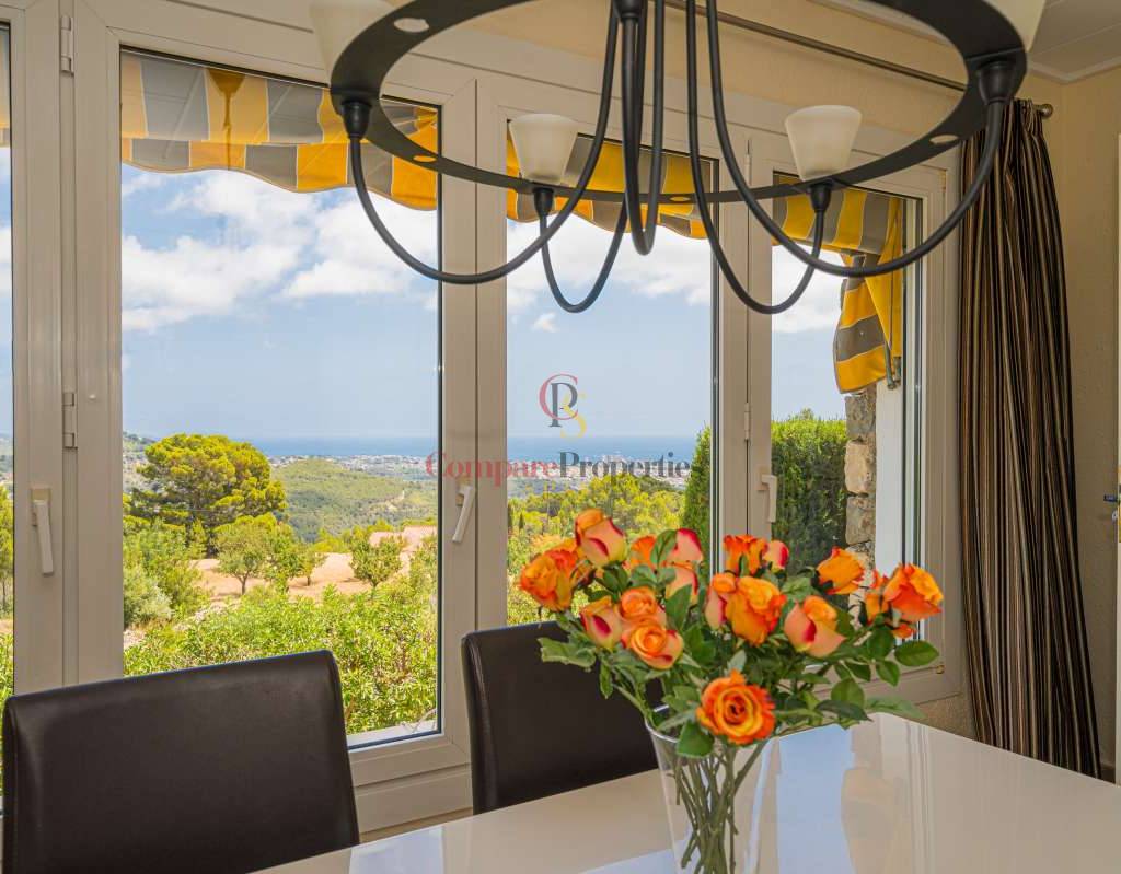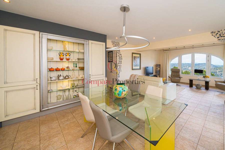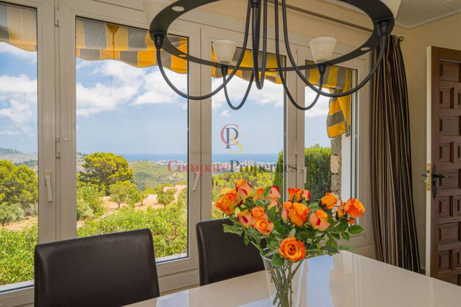 Esta hermosa villa está situada en el municipio de Benissa en la frontera de Calpe, en medio de un oasis verde de paz y sólo 6 minutos en coche del centro de Calpe y hermosas playas de arena. La villa está rodeada por el imponente paisaje montañoso d' Olta, con amplias vistas al mar Mediterráneo, incluyendo el símbolo de Calpe, la majestuosa montaña Ifach d' Peñon. La villa ofrece espectaculares vistas de Calpe, Benissa, Moraira, Teulada, entre otros, y en el fondo incluso se puede ver la montaña Montgo en Denia. La casa tiene dos unidades de vivienda, ambas con entrada propia, con varias posibilidades. Por ejemplo como actualmente se utiliza en parte (arriba) por los propietarios y en parte para alquiler abajo, (unas 48 semanas al año) o para una familia pareja mayor y niños (cada uno por separado). Como las dos plantas también están conectados internamente, por supuesto, también puede utilizar la villa como una casa unifamiliar.