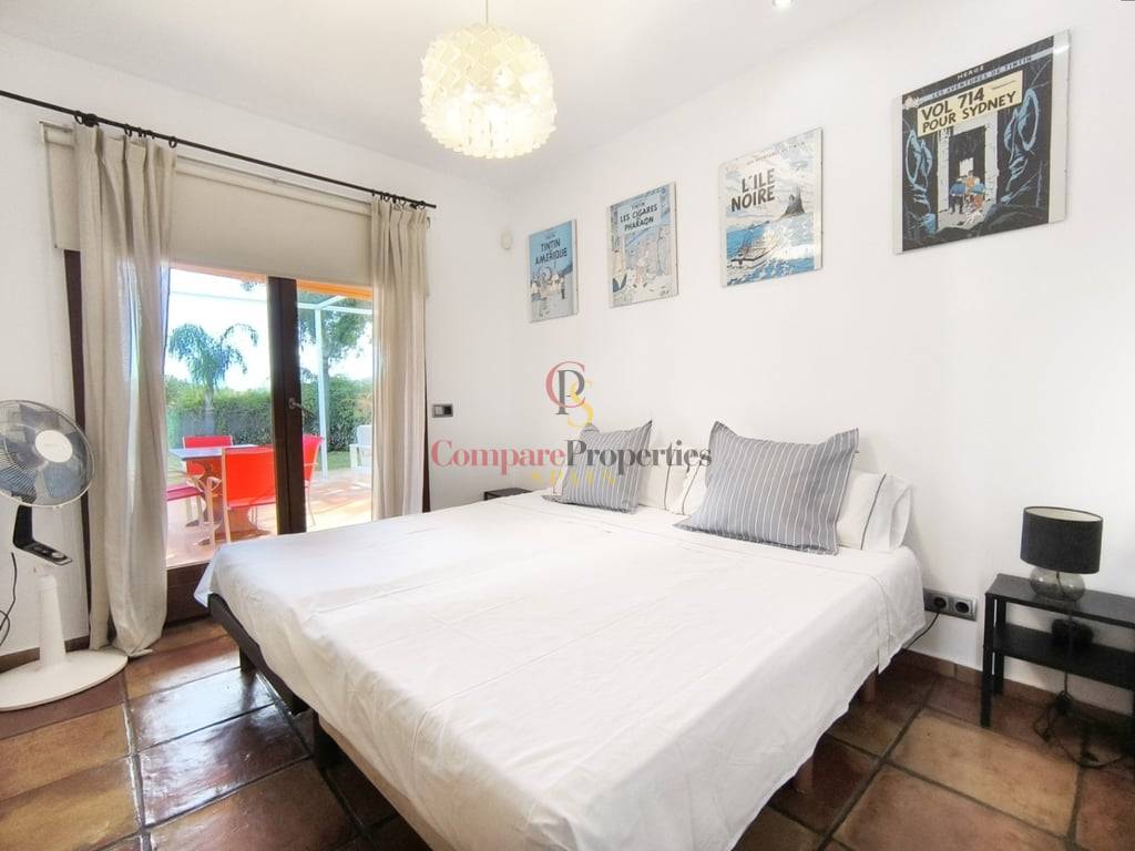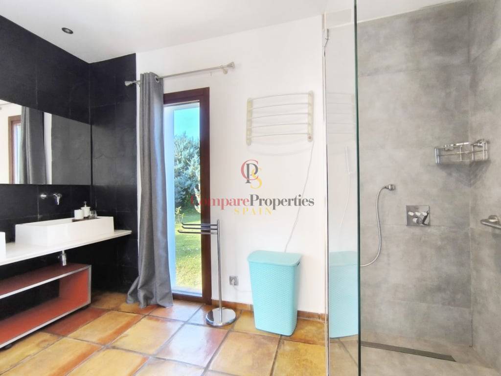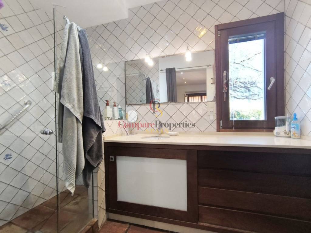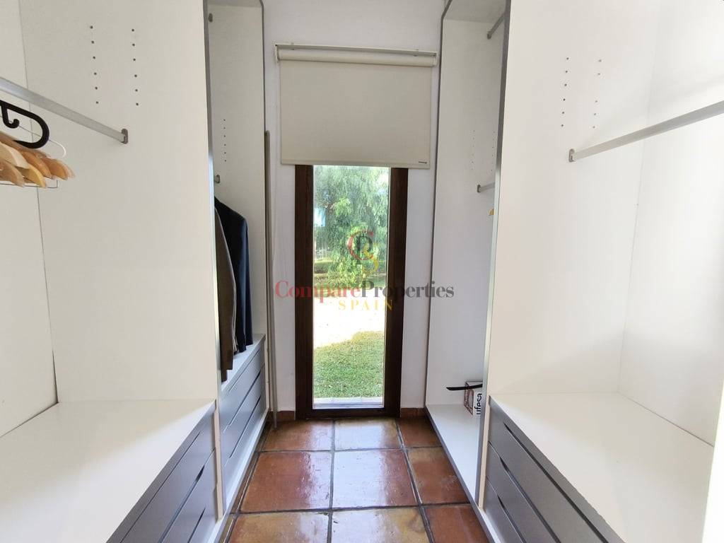 En el exterior, la villa cuenta con una piscina de gran tamaño, ideal para disfrutar del clima mediterráneo. Su orientación privilegiada garantiza luz natural durante todo el día y todo el año, creando un ambiente cálido y acogedor en cada estación.