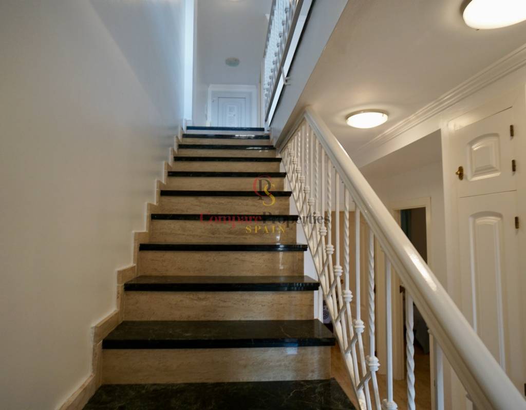 La planta superior ofrece un acogedor hall de entrada con aseo de invitados, un amplio salón-comedor con vistas al mar y acceso a una gran terraza soleada con vistas a la piscina y a la playa. La cocina es independiente, completamente equipada, y cuenta con lavadero.
