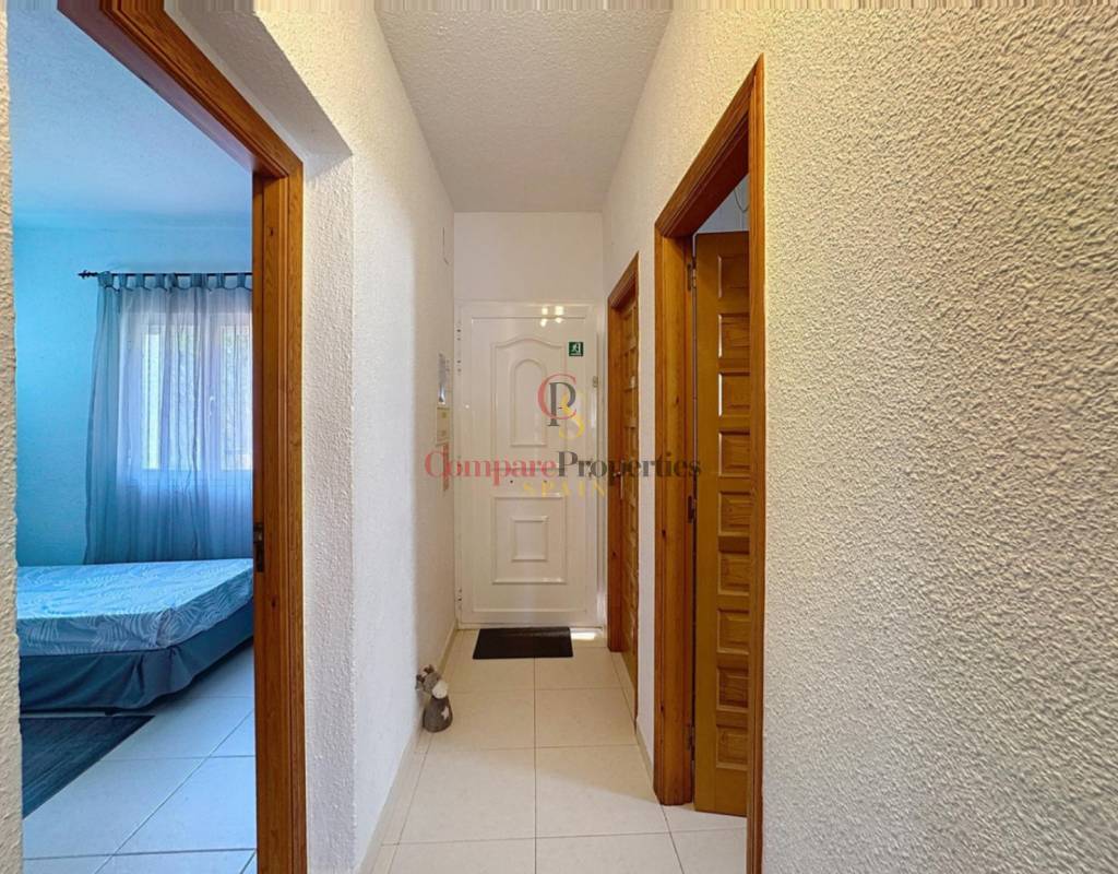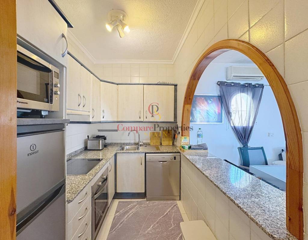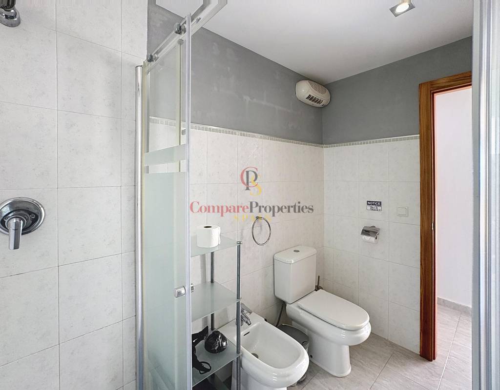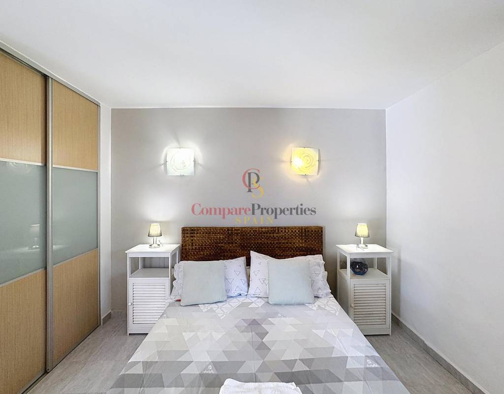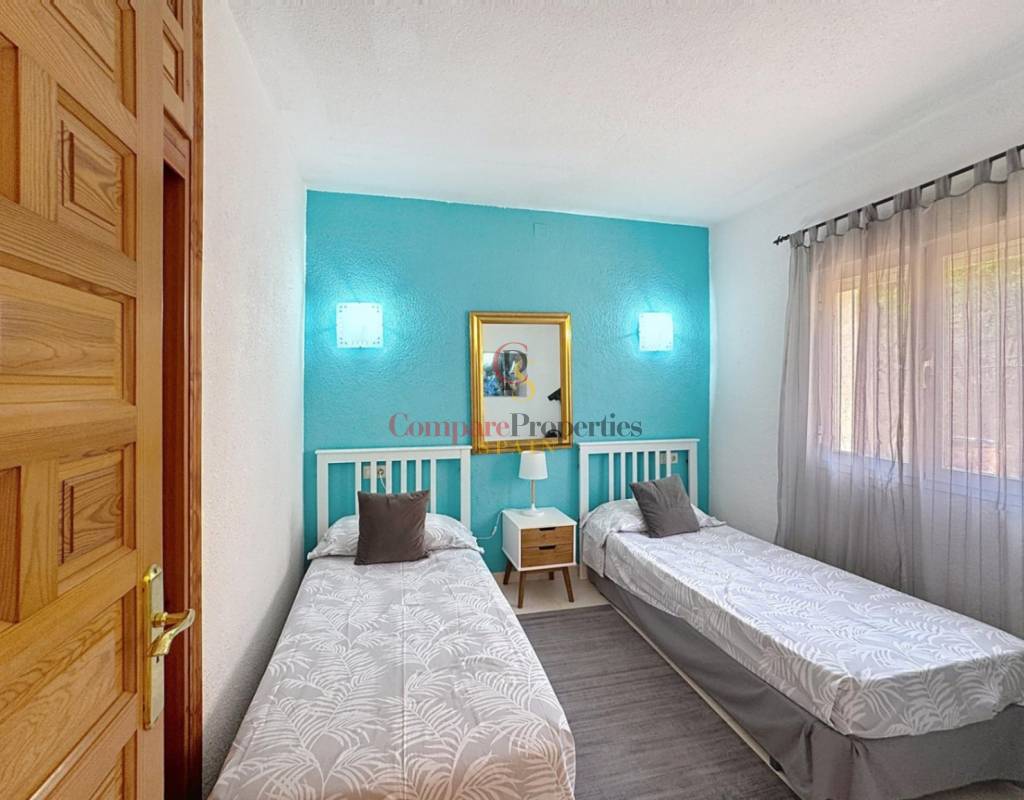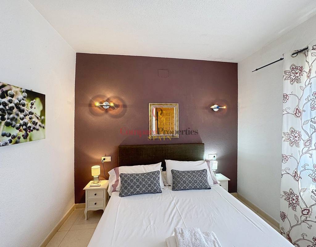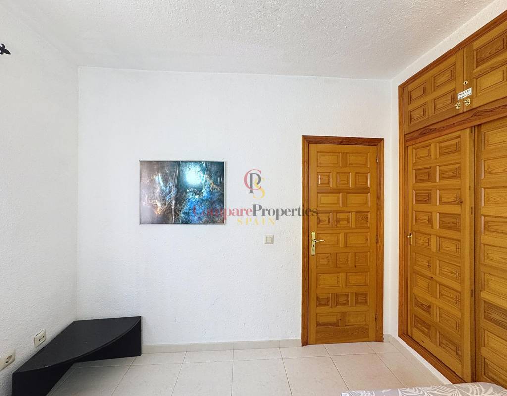 Dos dormitorios dobles, luminosos y con armarios empotrados.Un cuarto de baño completo.Salón-comedor con chimenea, perfecto para relajarse en cualquier época del año.Cocina americana totalmente equipada.Amplia terraza desde la que se pueden disfrutar de espectaculares vistas al mar.La planta baja, con acceso directo a la zona de la piscina, alberga: