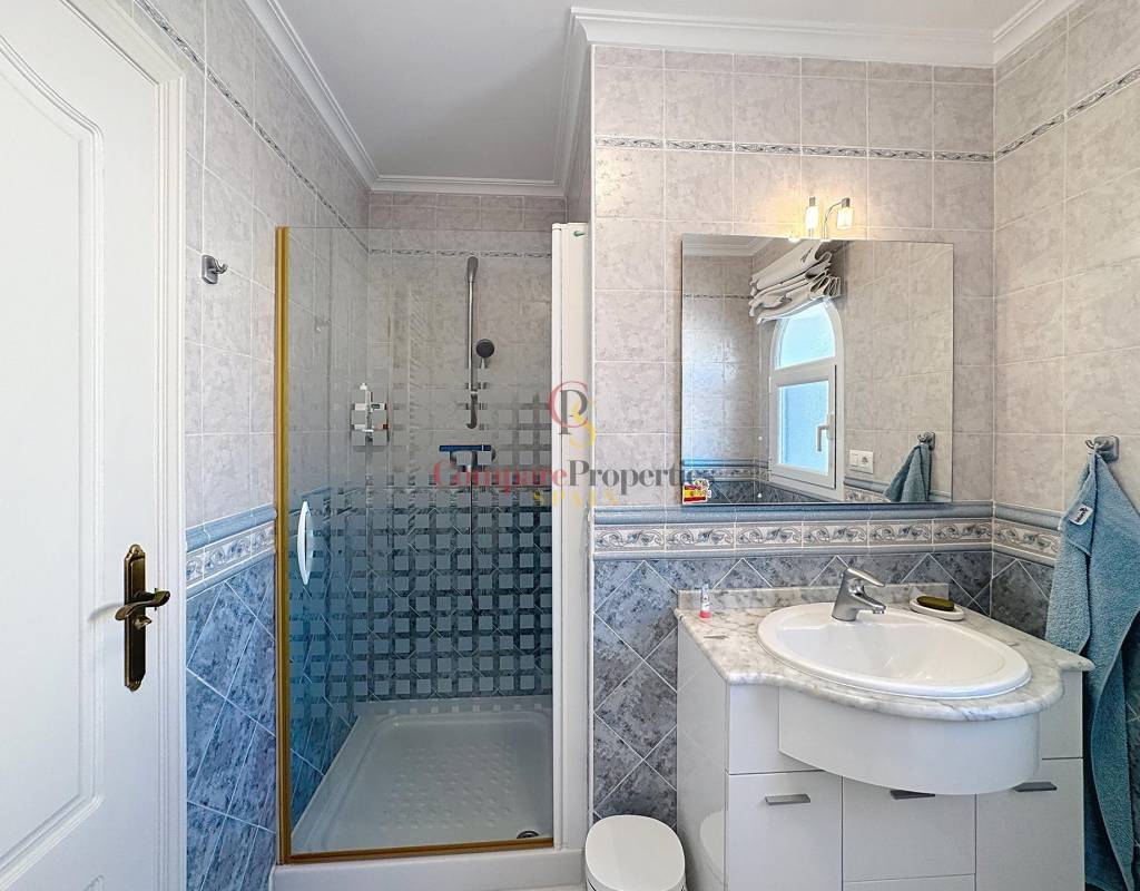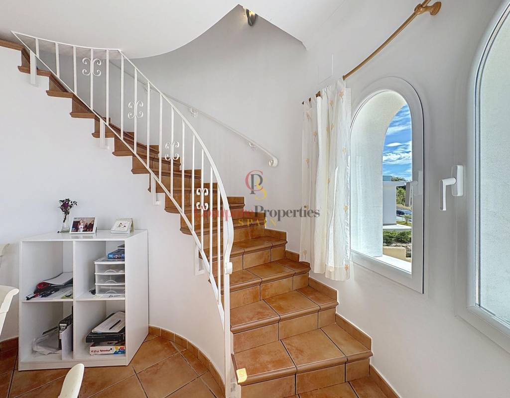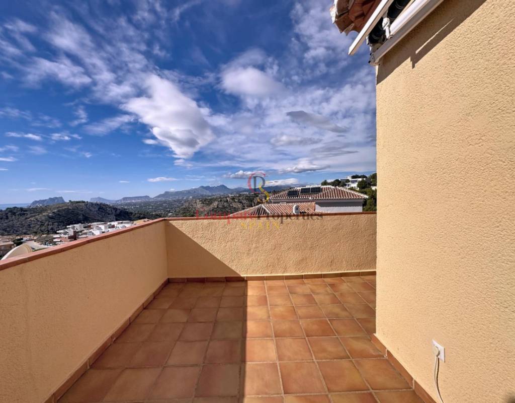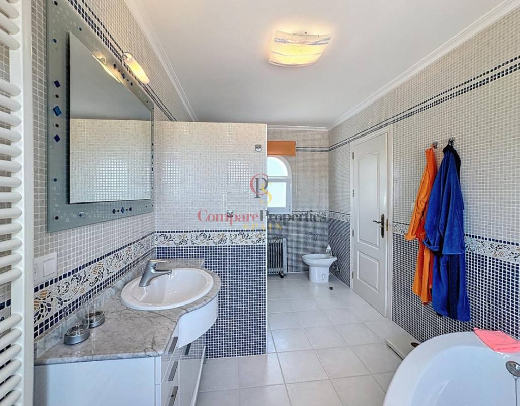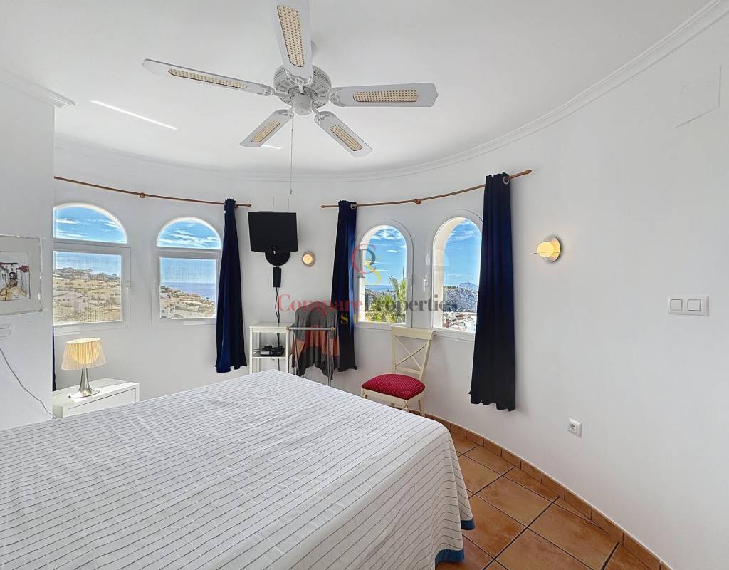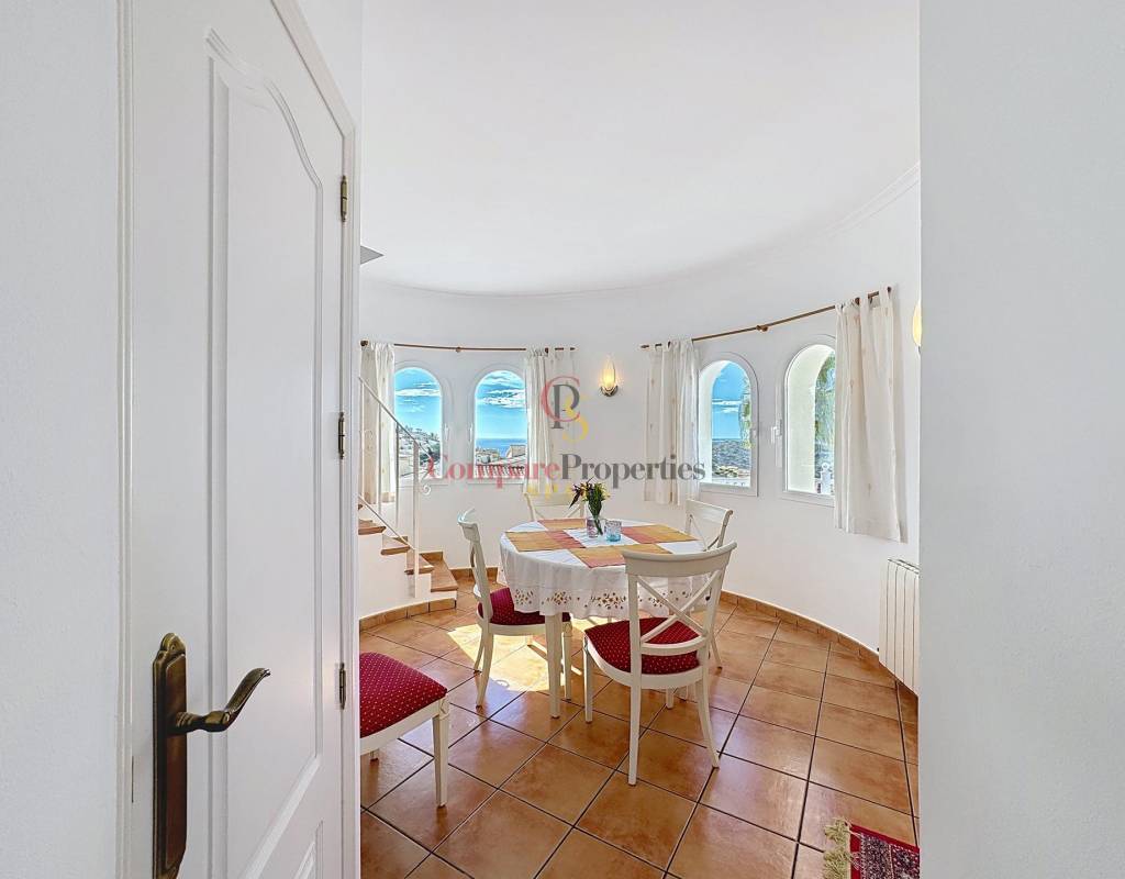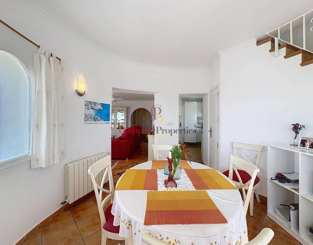 Un dormitorio doble con armarios empotrados, vistas al mar y acceso directo a la terraza.Un cuarto de baño completo.Una cocina independiente con lavadero y despensa, muy luminosa gracias a su ventana exterior.Un amplio salón con chimenea, conectado a la terraza cubierta y a la piscina, ideal para disfrutar del clima mediterráneo.Un comedor con acceso por escalera interior a la planta alta.Planta altaEn este nivel se sitúa un dormitorio principal tipo suite con vestidor, baño con ducha y bañera, y acceso a una terraza con impresionantes vistas al mar y al Peñón de Ifach de Calpe.