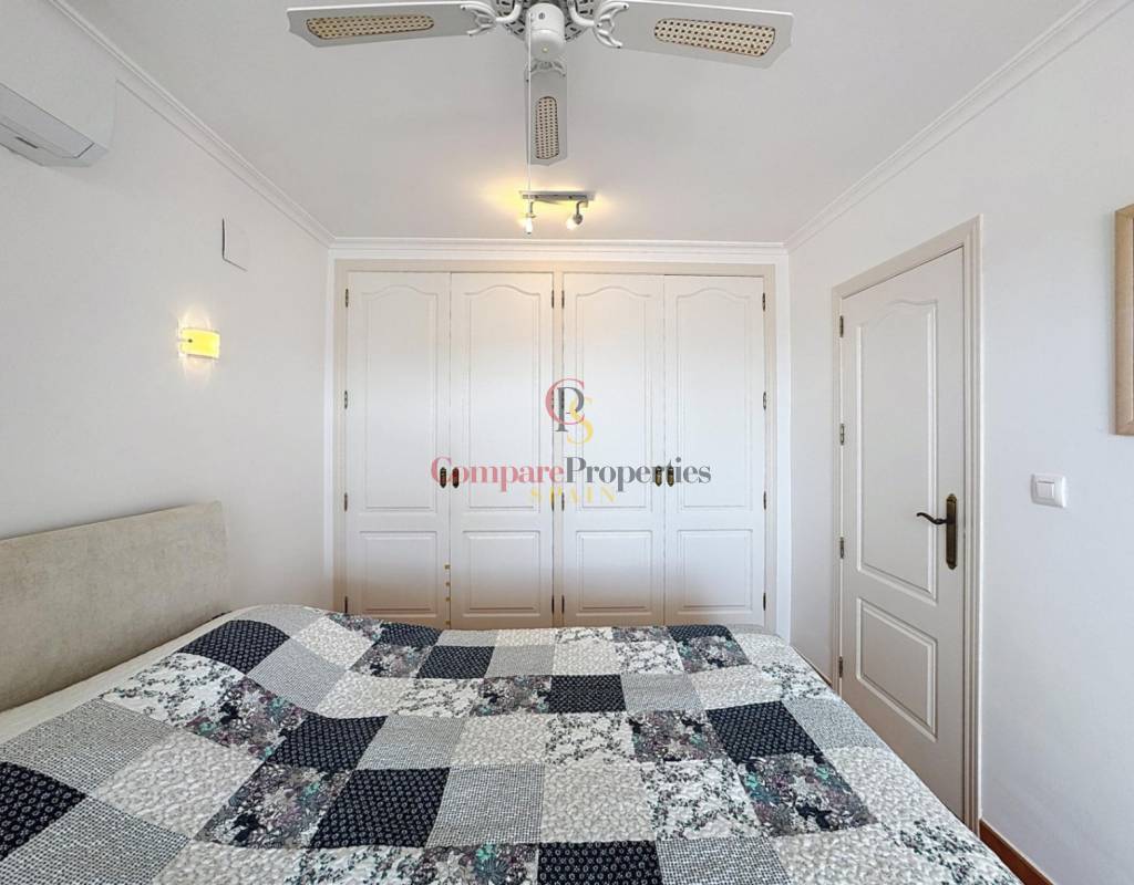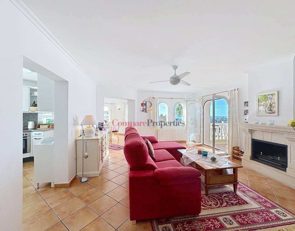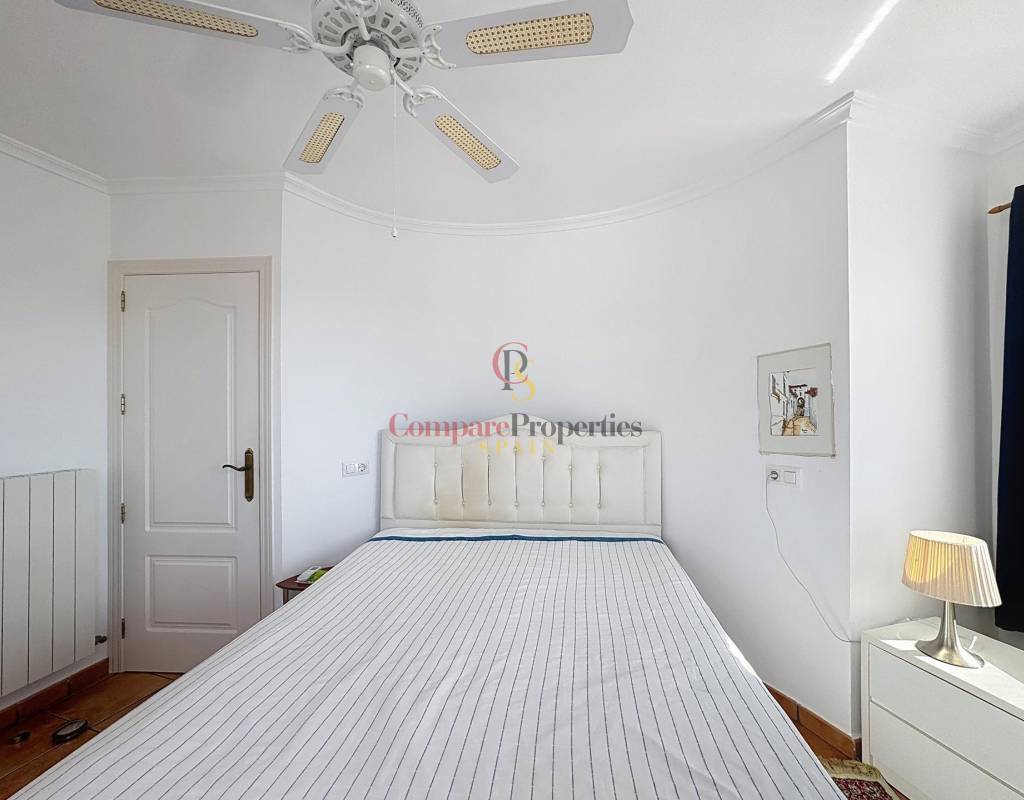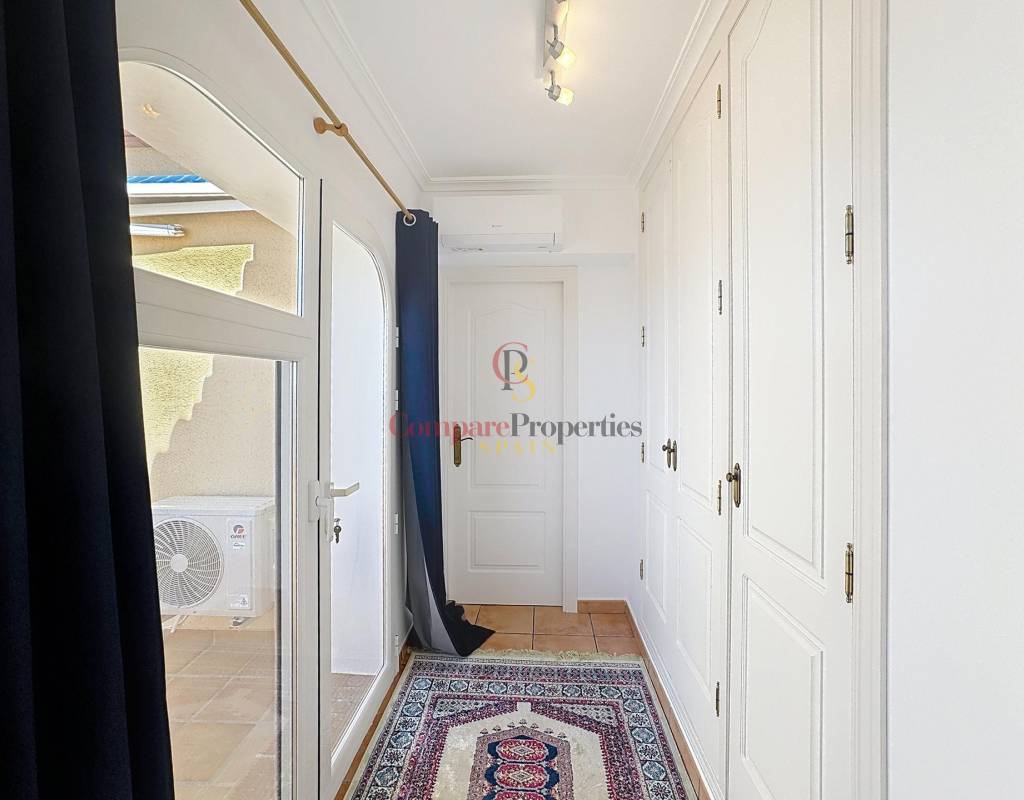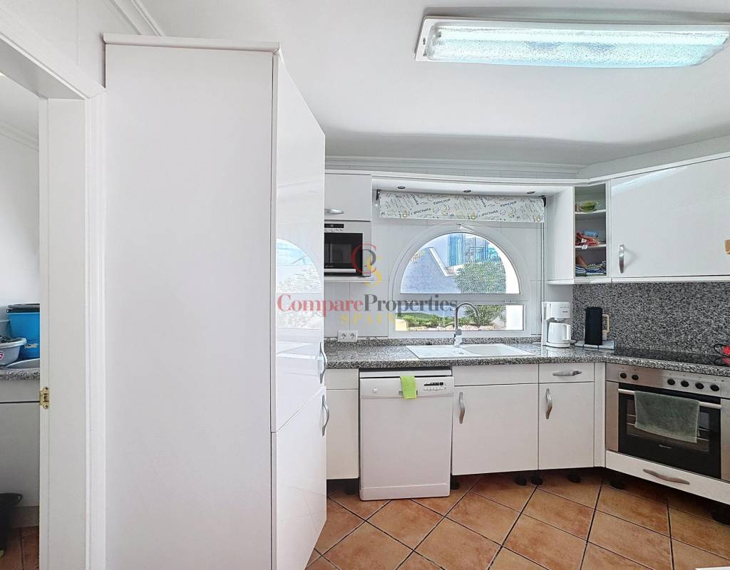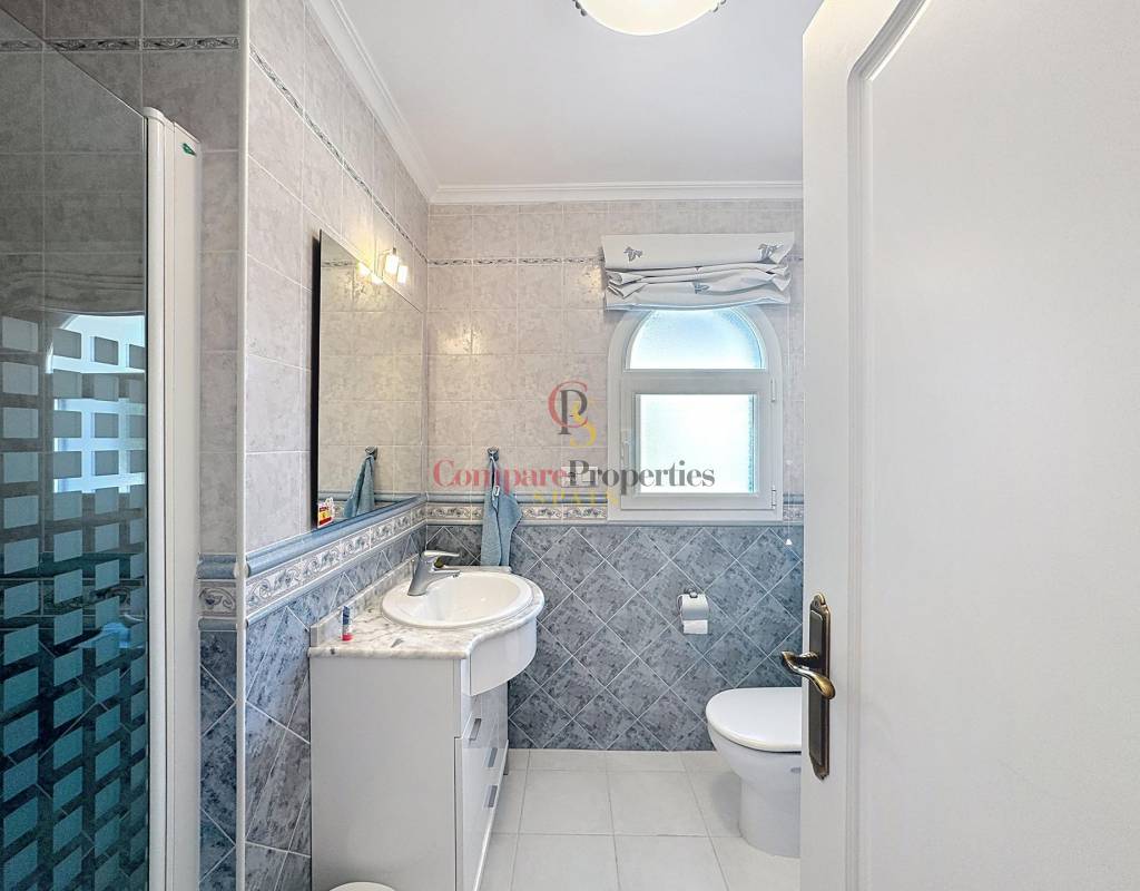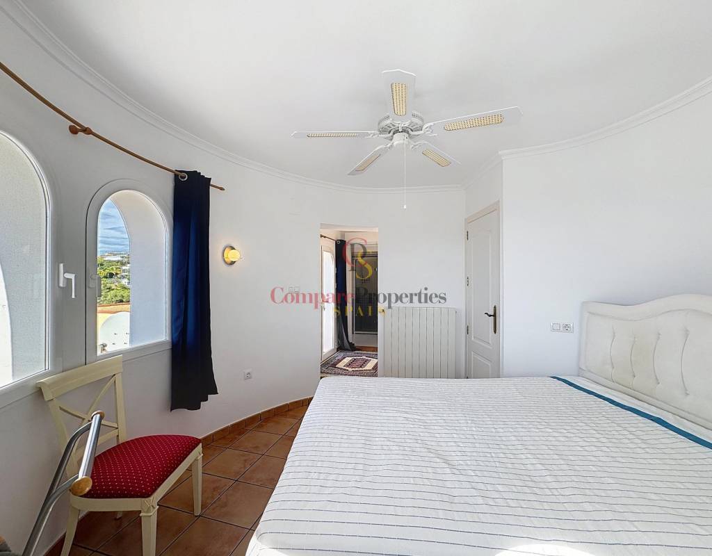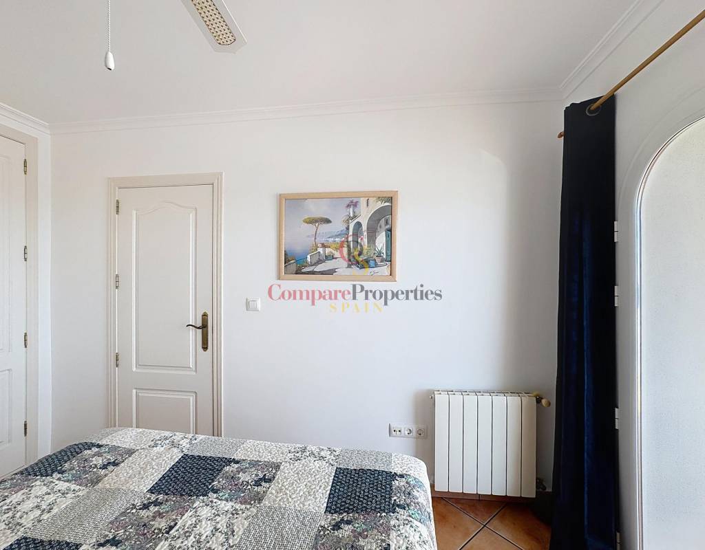 Un dormitorio doble con armarios empotrados, vistas al mar y acceso directo a la terraza.Un cuarto de baño completo.Una cocina independiente con lavadero y despensa, muy luminosa gracias a su ventana exterior.Un amplio salón con chimenea, conectado a la terraza cubierta y a la piscina, ideal para disfrutar del clima mediterráneo.Un comedor con acceso por escalera interior a la planta alta.Planta altaEn este nivel se sitúa un dormitorio principal tipo suite con vestidor, baño con ducha y bañera, y acceso a una terraza con impresionantes vistas al mar y al Peñón de Ifach de Calpe.