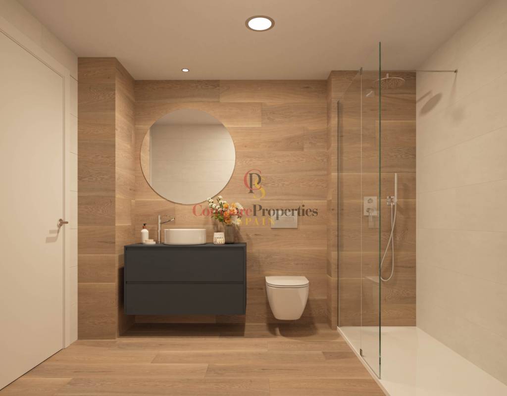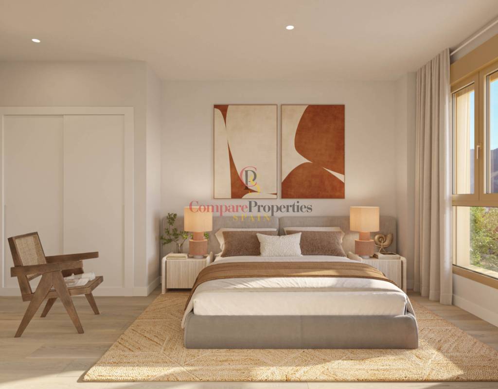 Ventanas y puertas de terraza de aluminio de alta calidad, con rotura de puente térmico y doble acristalamiento con cámara tipo «Climalit». Persianas motorizadas en los dormitorios. Persianas de seguridad en la planta baja de las casas adosadas. Las plazas de aparcamiento están cubiertas por pérgolas. Preinstalación para la recarga de vehículos eléctricos según la normativa. Instalación completa de aire acondicionado por conductos con bomba de calor y frío. Termostato regulador en salón-comedor. Agua caliente mediante sistema aerotérmico.