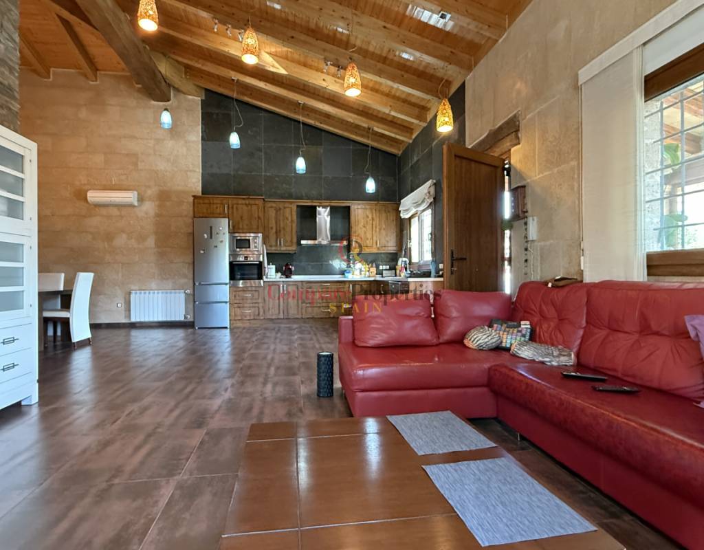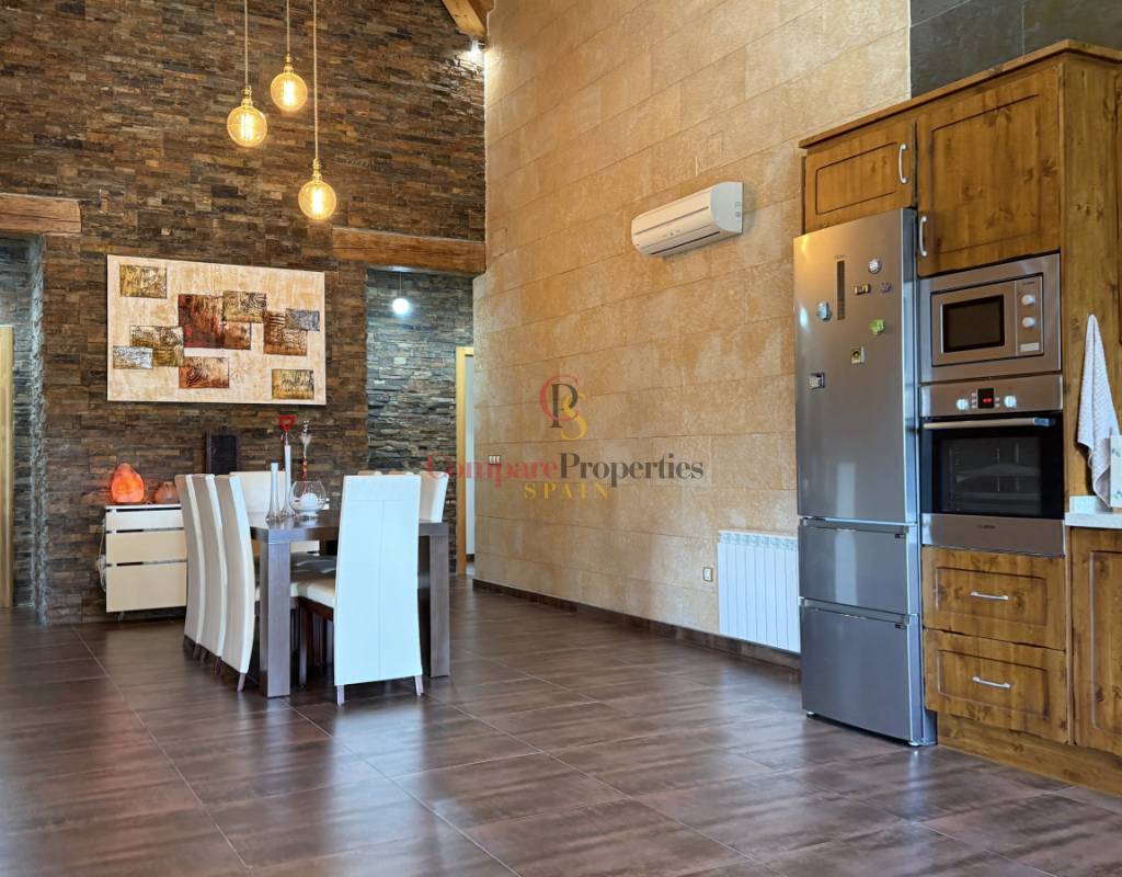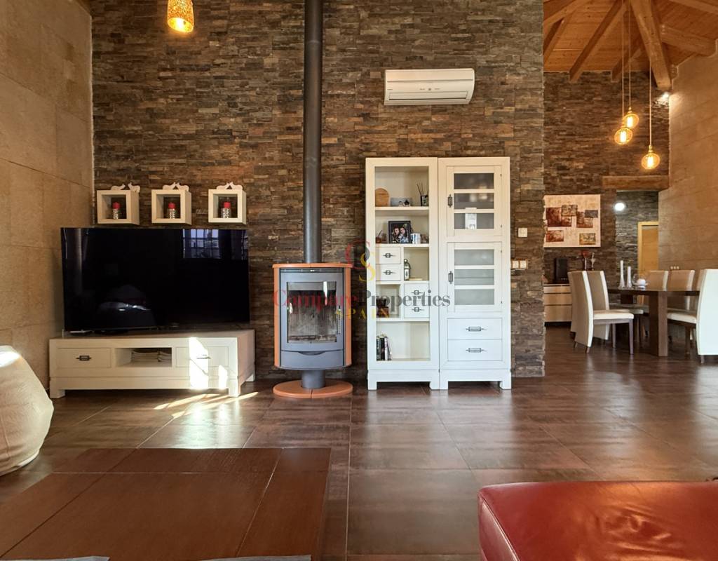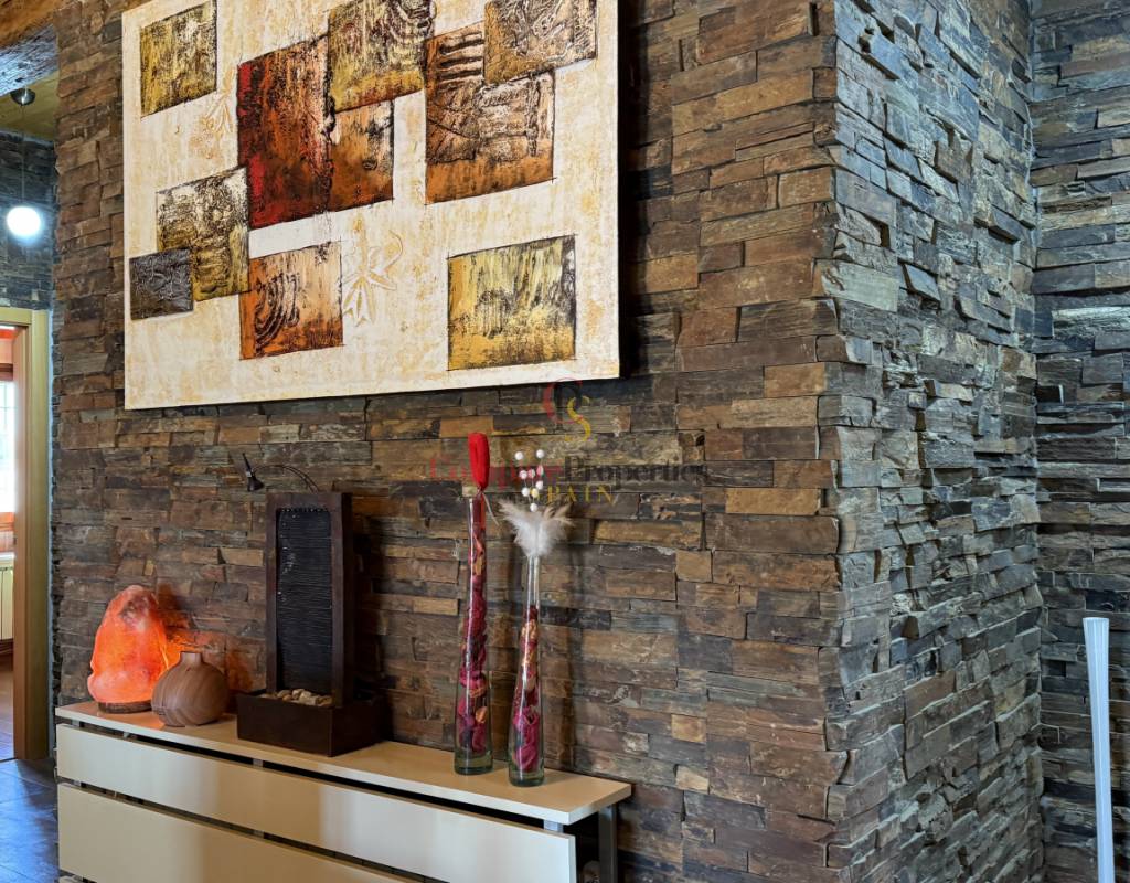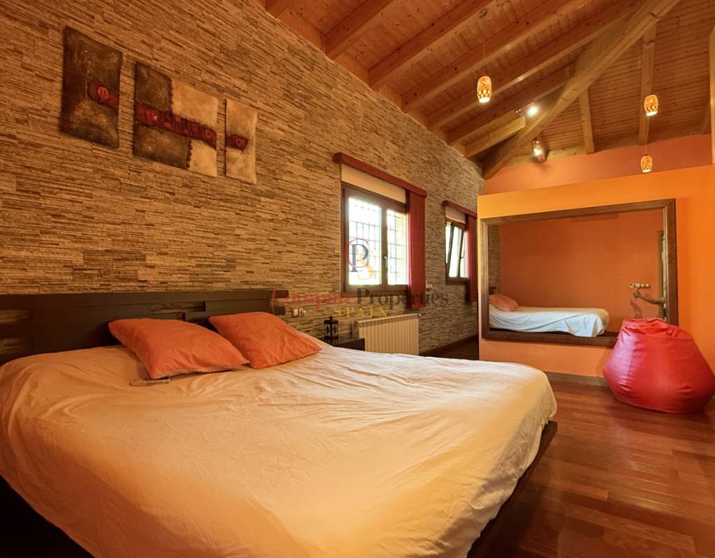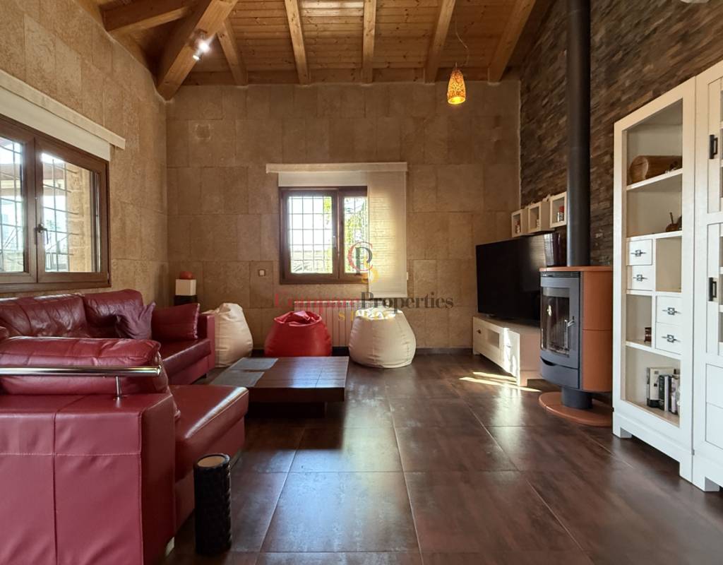 La vivienda cuenta con bodega subterránea, trastero de 20 m², aire acondicionado en todas las estancias, chimenea de leña en el salón, y una espectacular piscina salina climatizada de 8×4 m, cubierta, con electrólisis y control automático de pH. Los interiores destacan por techos y puertas de madera maciza y ventanas de PVC con doble acristalamiento, aportando calidez y aislamiento. Los techos son de gran altura lo que otorga una sensación de amplitud extraordinaria.