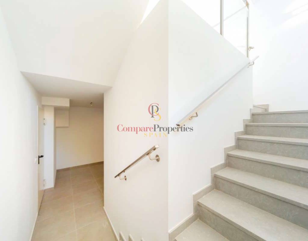 - Le rez-de-chaussée comprend un salon-cuisine-salle à manger, des escaliers menant à l'étage, des toilettes, une buanderie, une salle de bain, une chambre à coucher, un porche, une pergola préfabriquée légère en aluminium blanc, une piscine et une terrasse. Il dispose également d'une pré-installation pour un ascenseur.