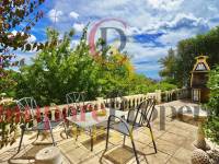 En suivant le couloir et en sortant par la porte d’entrée, on accède à l’extérieur, avec de belles vues sur la vallée. De là, des escaliers mènent soit à la rue, soit à la grande pièce de rangement et aux jardins de faible entretien. À ce niveau, un agréable espace pavé permet de profiter des vues sur la montagne et la piscine. En continuant tout autour de la maison, plusieurs autres coins terrasses invitent à la détente ou aux repas.