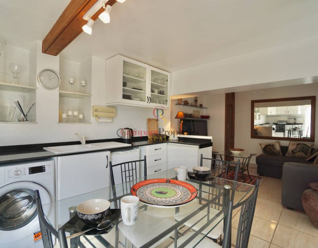 Quelques marches mènent à l’entrée d’un appartement indépendant pour invités. Celui-ci comprend une chambre, actuellement avec deux lits simples mais pouvant accueillir un lit double, une armoire encastrée et une grande fenêtre avec vue dégagée. De l’autre côté se trouve un salon-salle à manger-cuisine ouvert, avec espace TV, cuisine équipée et coin repas. La cuisine dispose de tout l’électroménager nécessaire, de plans de travail et de nombreux rangements. Une grande fenêtre apporte beaucoup de lumière naturelle et donne sur une terrasse extérieure.