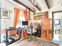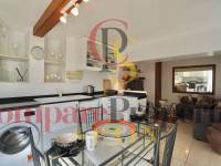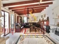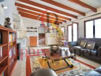 La salle à manger communique avec un grand salon doté de poutres apparentes au plafond et de larges fenêtres. L’espace est convivial et confortable, adapté à la vie de famille comme à la réception d’invités. La pièce est équipée de la climatisation et d’un poêle à granulés et bois, assurant un confort optimal toute l’année.