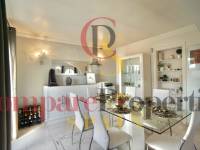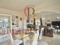 On accède ensuite à une terrasse couverte, offrant un agréable coin salon extérieur et un espace de rangement pratique, avec vue sur la vallée. À côté se trouve une terrasse extérieure pour les repas, avec vue sur la mer et la vallée — idéale pour dîner en plein air ou recevoir. De là, des portes vitrées mènent à la salle à manger intérieure, lumineuse et assez spacieuse pour accueillir une grande table et des rangements supplémentaires.