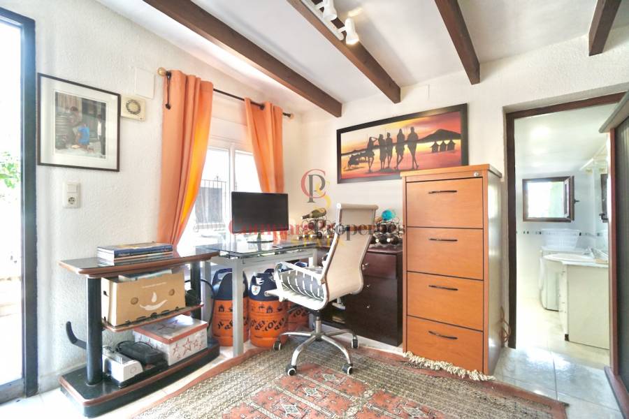 La villa dispose de deux accès : l’un par un garage privé et l’autre par un double carport fermé avec portail. Depuis le carport, quelques marches descendent vers un espace invité indépendant, actuellement utilisé comme bureau, mais qui pourrait facilement être aménagé en chambre double avec salle de bains privative.