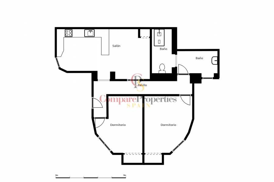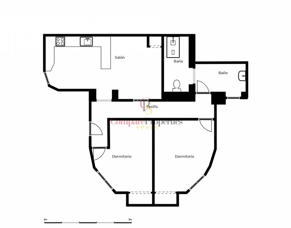 Depuis le salon, un couloir intérieur mène à la cuisine, deux chambres doubles et deux salles de bains. Ce couloir permet également d’accéder au jardin par une entrée indépendante.