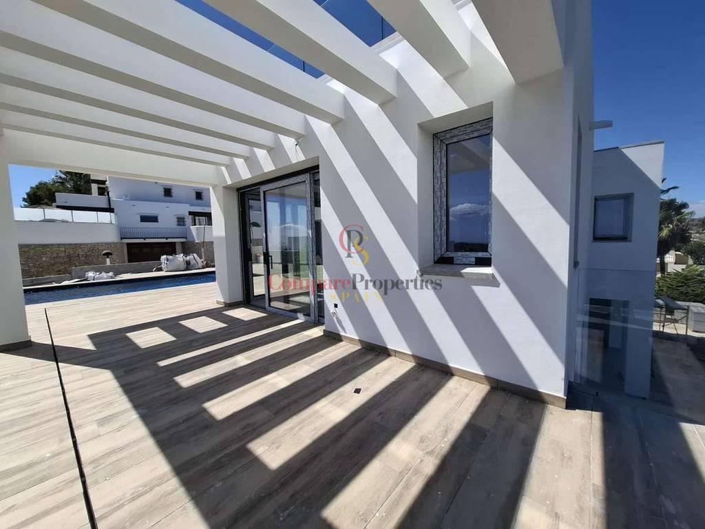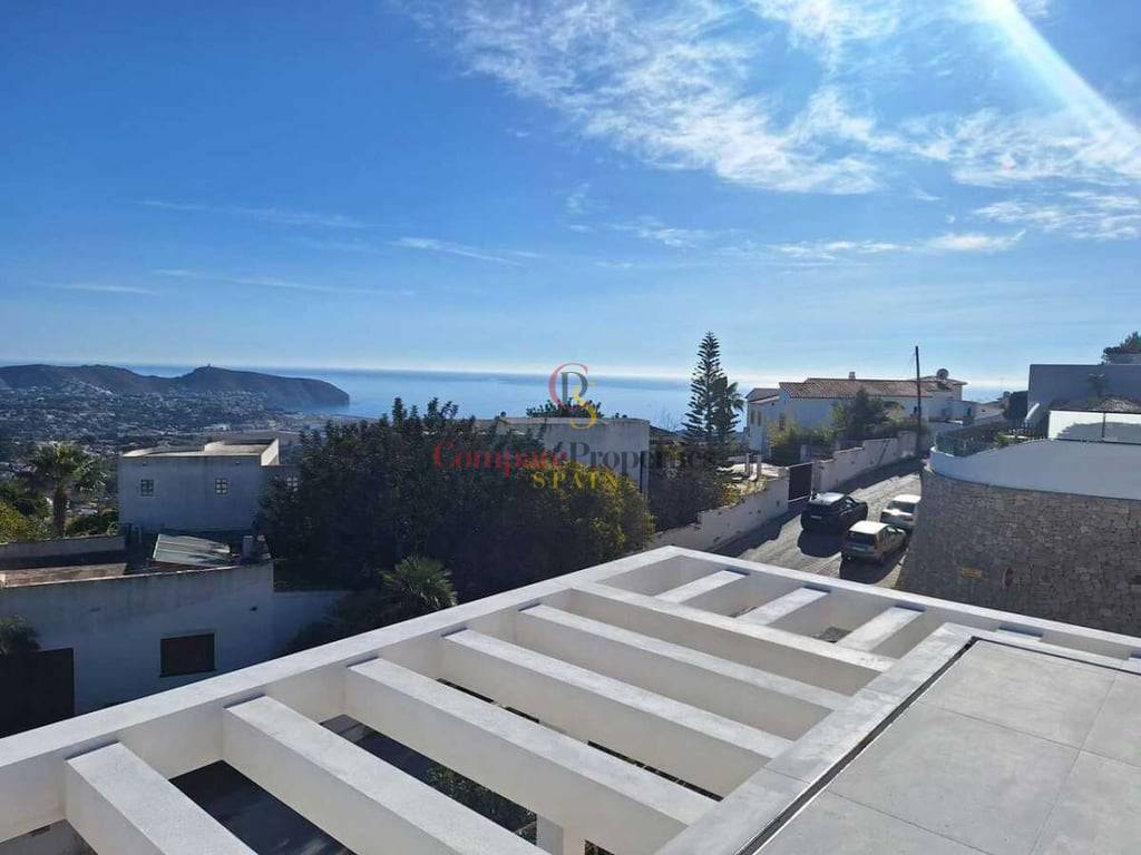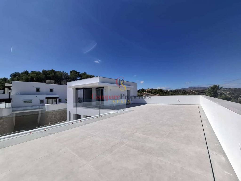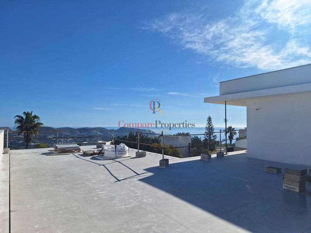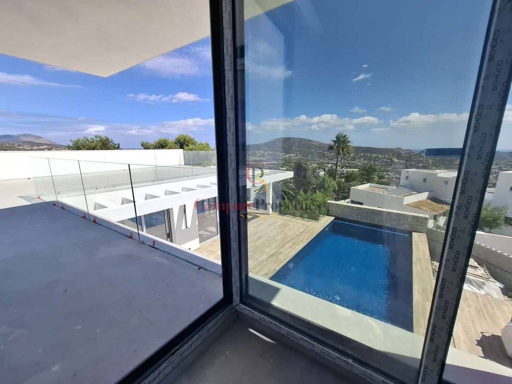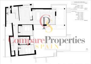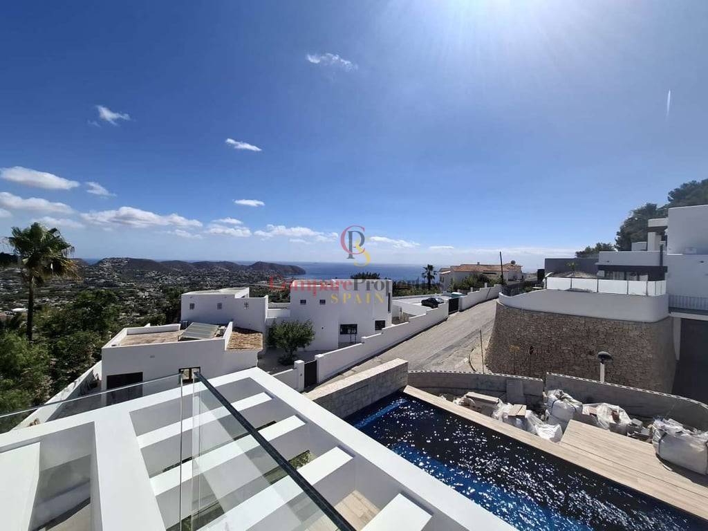 Villa de luxe dans le quartier de Benimeit, Moraira, sur un terrain d'angle de 817 m2. Larges vues panoramiques, vues partielles sur la mer depuis le rez-de-chaussée et vues panoramiques complètes sur la mer depuis le Compare Properties Spain étage. La maison a une superficie construite de 233,50 m2 répartis sur un rez-de-chaussée avec un hall d'entrée, des toilettes invités, un salon, une cuisine séparée, un couloir, 2 chambres et 1 salle de bain. A l'extérieur, une terrasse de près de 100 m2 entoure une piscine à débordement de 35 m2 et un barbecue. Le 1er étage est accessible par un escalier où se trouve la chambre principale avec 1 salle de bain en suite et dressing. Et à l'extérieur, il y a une terrasse avec vue panoramique sur la vallée et la mer. Au sous-sol, il y a un garage, un débarras et un réservoir d'eau d'irrigation. La villa a été conçue avec des matériaux de haute qualité, notamment des capteurs solaires sur le toit. Son achèvement est prévu pour fin 2023.