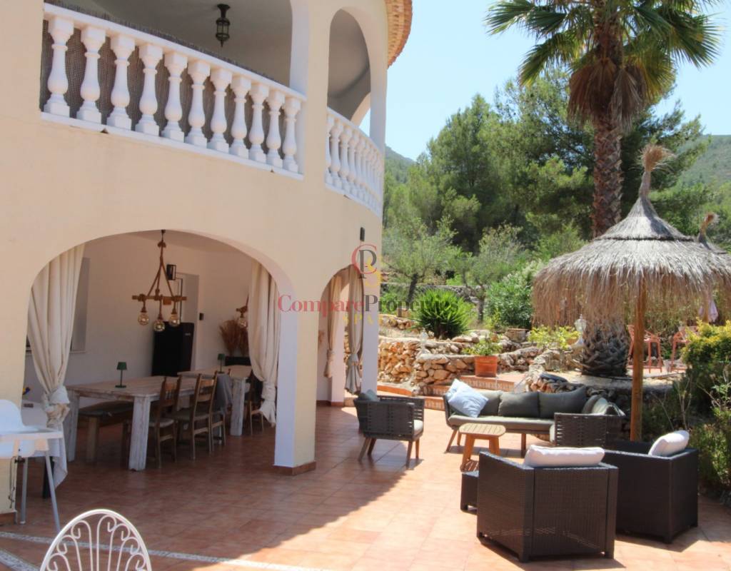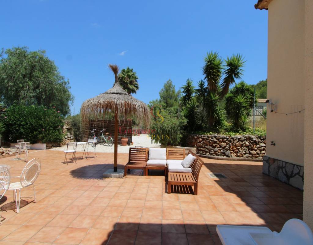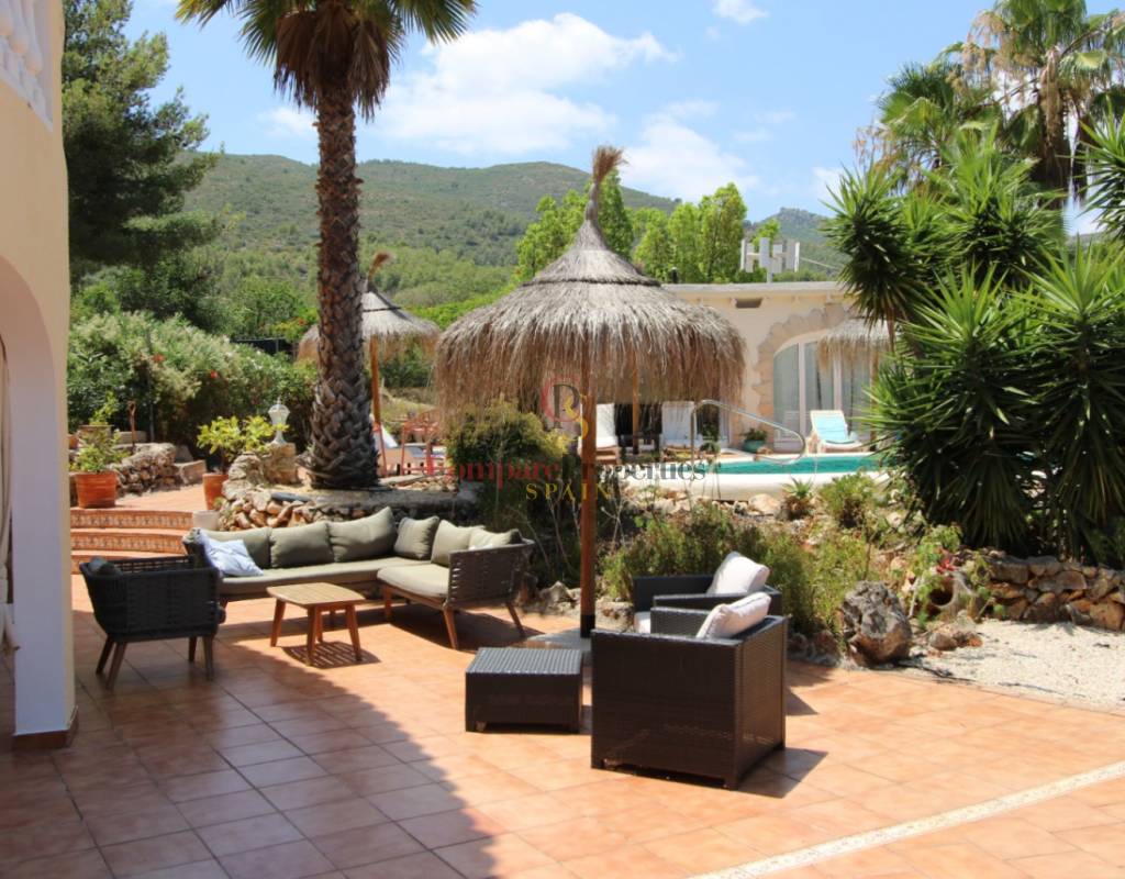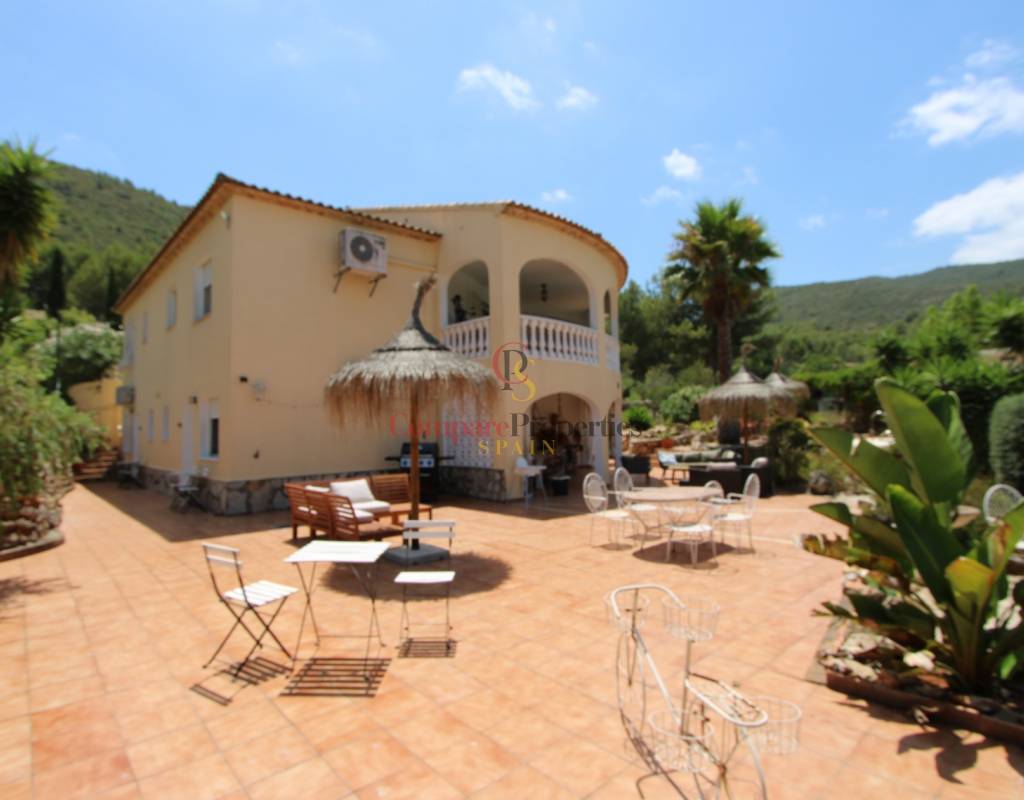 La villa est située sur un large terrain près du village de Jalón. Elle dispose de deux entrées indépendantes avec un stationnement pour 15 ou 20 véhicules, ainsi qu'un garage pour une voiture. Le stationnement principal mène à une grande terrasse ouverte avec diverses chaises et tables. À gauche se trouve la maison principale, qui comprend le logement privé des propriétaires à l'étage supérieur avec deux chambres et, à l'étage inférieur, trois appartements indépendants de deux chambres. À droite, il y a un petit abri d'une chambre.