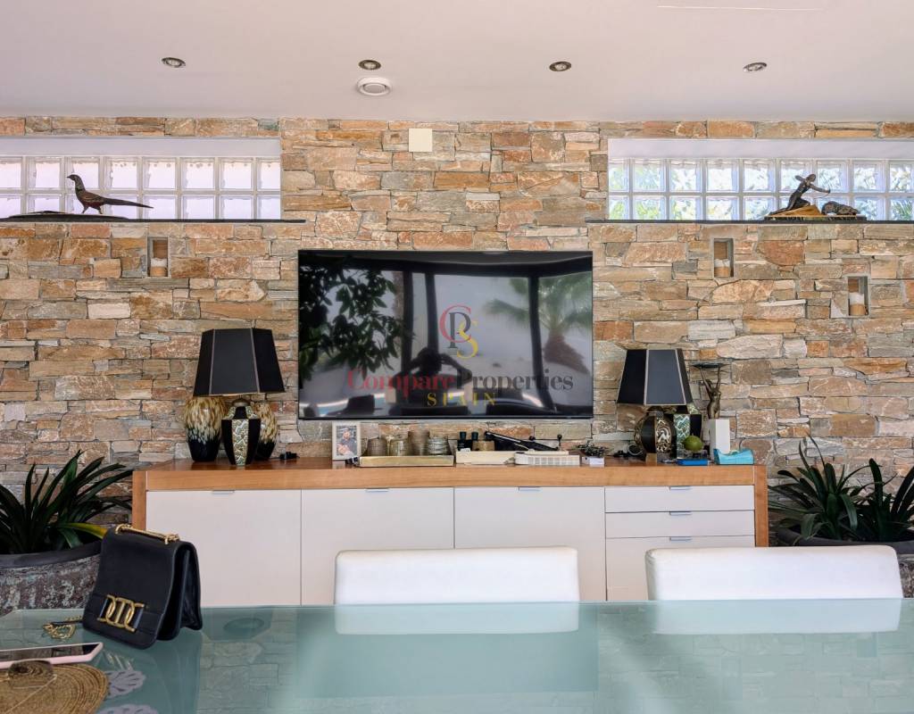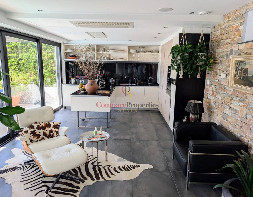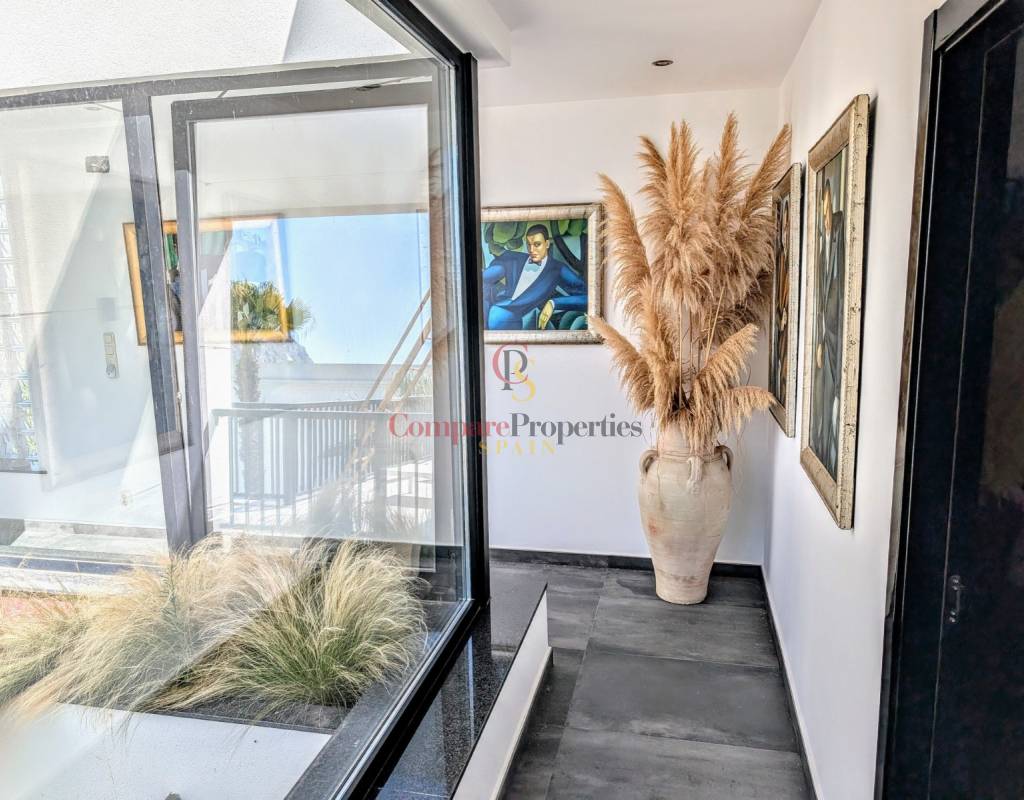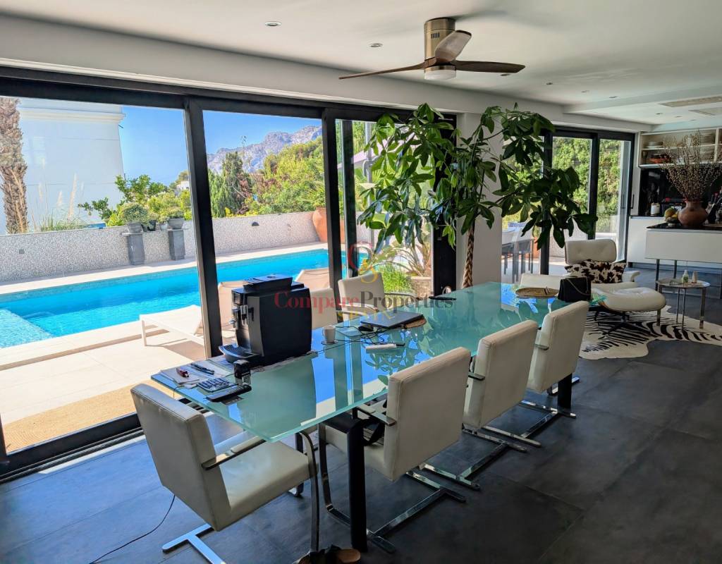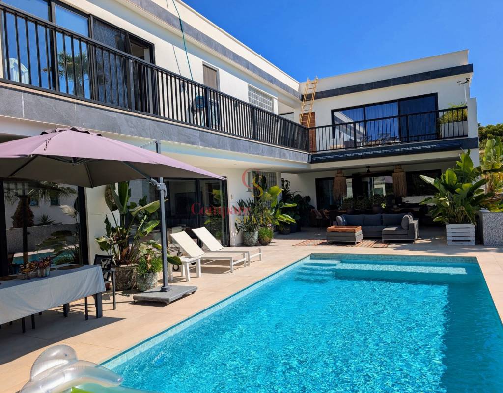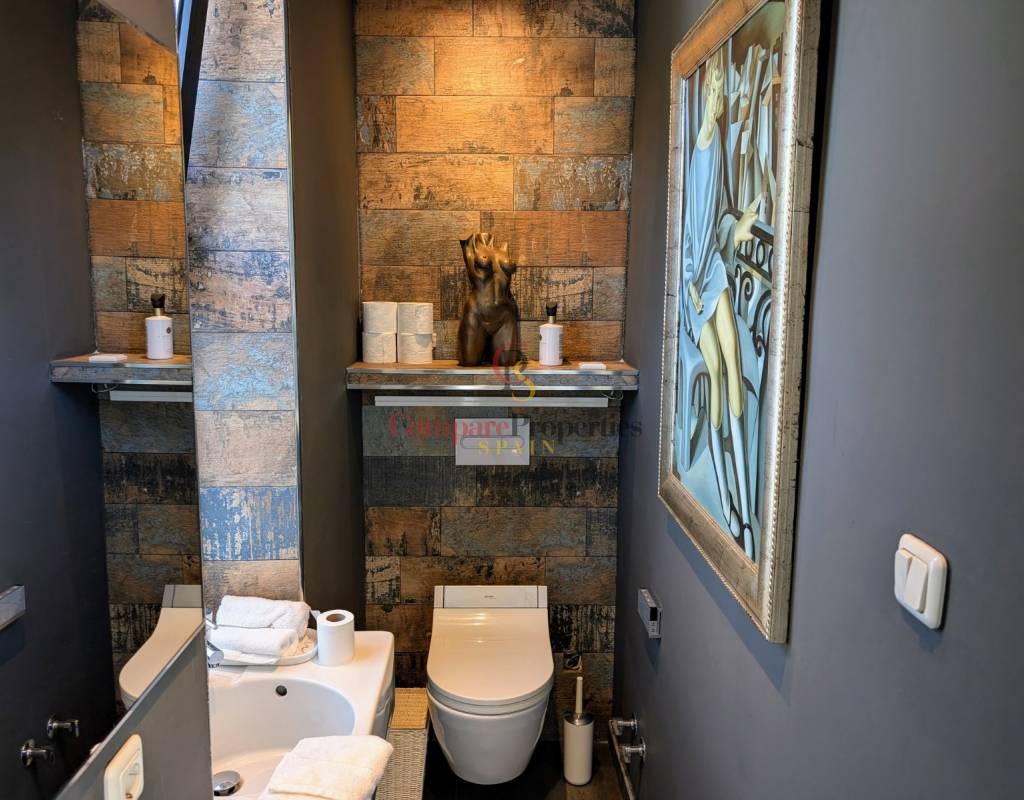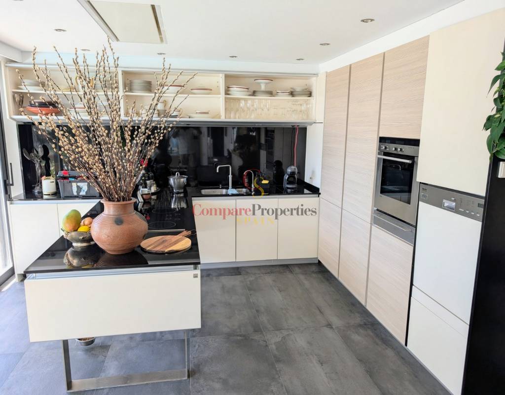 Cette luxueuse villa exotique et moderne avec vue sur la mer est située dans le quartier populaire de La Calalga à Calpe. La villa est distribuée sur trois étages et située sur un terrain de 800m2 avec un jardin tropical mature facile d'entretien. L'entrée de la propriété se fait par un parking spacieux avec un abri à voile à l'extérieur de l'entrée du garage. La villa a été conçue de manière exquise avec l'utilisation du verre partout où cela est possible afin de maximiser la lumière et l'expérience de vie intérieure/extérieure. Vous entrez dans l'étage principal, un couloir lumineux avec des toilettes pour invités et un mur de placards de rangement vous mène après l'escalier à la magnifique cuisine/salle à manger/salle familiale avec des portes et des fenêtres vitrées sur toute la hauteur donnant sur la terrasse de la piscine et un mur de pierre caractéristique pour donner à la pièce le facteur "wow". La cuisine design a été entièrement équipée avec des meubles en bois clair et crème, des plans de travail en granit noir et des appareils électroménagers en acier inoxydable. À l'autre bout du hall d'entrée se trouve le salon, une pièce étonnamment spacieuse avec une cheminée contemporaine et des portes vitrées pleine hauteur menant à la cuisine d'été tropicale et à la terrasse de la piscine. La terrasse de la piscine est accessible à la fois depuis le salon et la cuisine. Il y a deux terrasses couvertes et des marches menant au jardin. À gauche, deux chambres doubles, dont l'une avec vue sur la mer, sont dotées d'armoires et de salles de douche attenantes. À droite se trouve la chambre principale, une grande pièce avec de nombreux placards, un meuble de télévision, des portes vitrées menant au balcon, une vue sur la mer et une grande salle de douche en-suite avec des rangements supplémentaires. En descendant l'escalier depuis le hall d'entrée, on accède au demi sous-sol, où l'on trouve une grande buanderie et un grand débarras qui donne accès à l'immense garage. Au bout du couloir se trouve la salle de bien-être, qui pourrait être une grande chambre 4, comprenant un sauna, une table de massage/traitement et une salle de douche. La villa est entourée sur trois côtés d'un jardin facile d'entretien comprenant des plantes matures, des palmiers et des arbres fruitiers, tous avec auto-irrigation.- Points clés :- 3 chambres à coucher, possibilité d'en faire 4- 4 salles de bains- Toilettes invités- Salle de séjour- Cuisine/Famille- Buanderie- Nombreux espaces de rangement- Le propriétaire a laissé un espace pour l'installation d'un ascenseur.- La terrasse couverte à l'extrémité du Compare Properties Spain étage peut être transformée en bureau avec vue sur la mer.- Système de climatisation central par aérothermie- Système photovoltaïque produisant de l'électricité avec 12 panneaux solaires- Système de sonorisation intégré- Système d'aspiration centralisé- L'emplacement est Partida Calalga : - A distance de marche du centre de sports nautiques Bassetes, de la plage La Fustera ou de la plage Playa de la Fossa- A distance de marche d'un grand choix de restaurants- A 14 minutes en voiture d'un terrain de golf- A 19 minutes en voiture de l'accès à l'autoroute à Benissa- Si vous cherchez une villa extraordinaire qui vous offre un design contemporain, un emplacement pratique, l'efficacité énergétique et un merveilleux style de vie intérieur/extérieur, ne cherchez pas plus loin.