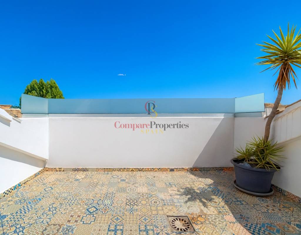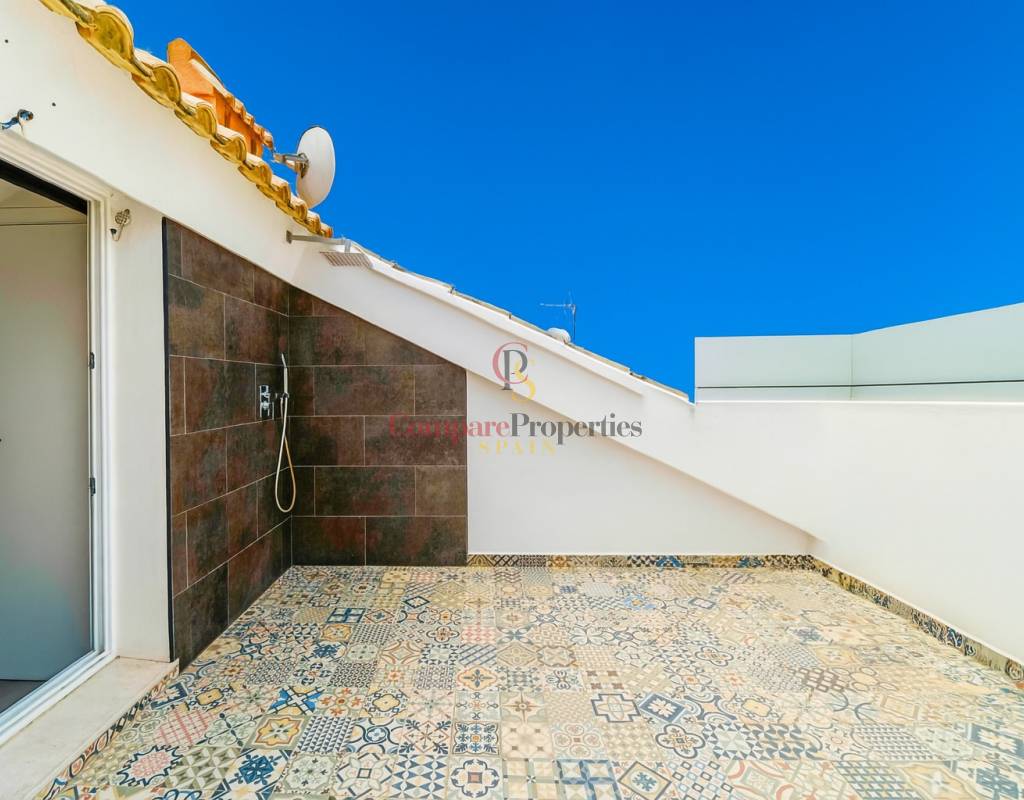 Compare Properties Spain étage : salon-salle à manger avec terrasse ensoleillée, cuisine ouverte équipée, trois chambres (deux avec accès à la terrasse) et deux salles de bains complètes.Dernier étage : chambre type loft, toilettes et solarium avec barbecue et store, parfait pour profiter du climat méditerranéen et organiser des réunions en plein air.Caractéristiques et extras : climatisation, garage et cave inclus, prêt à emménager.