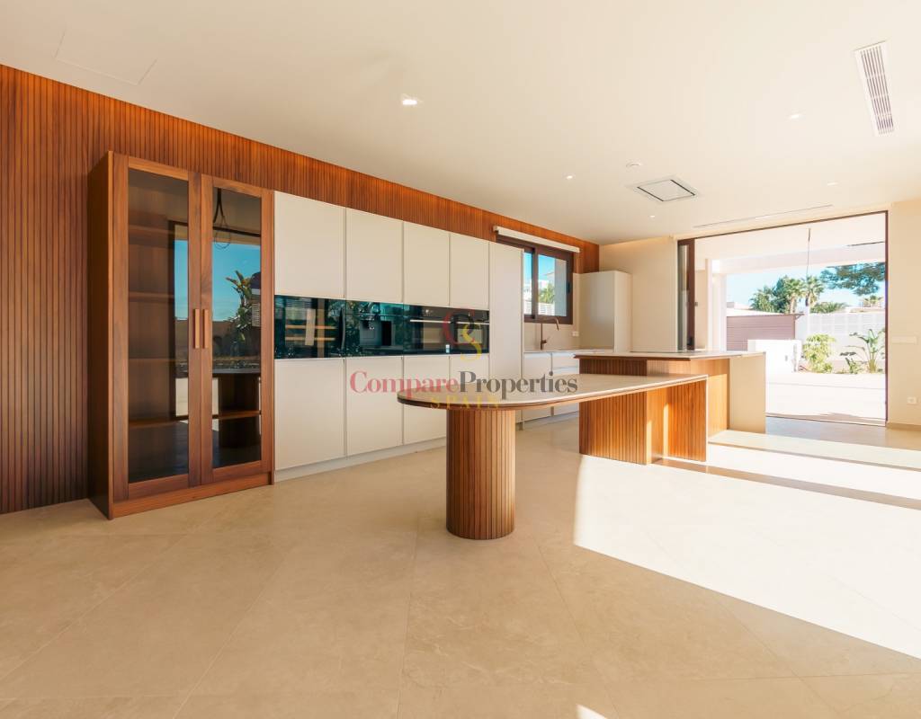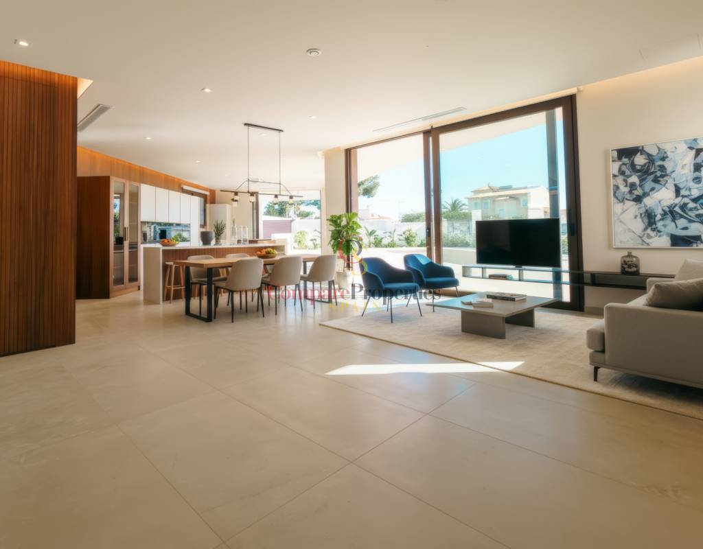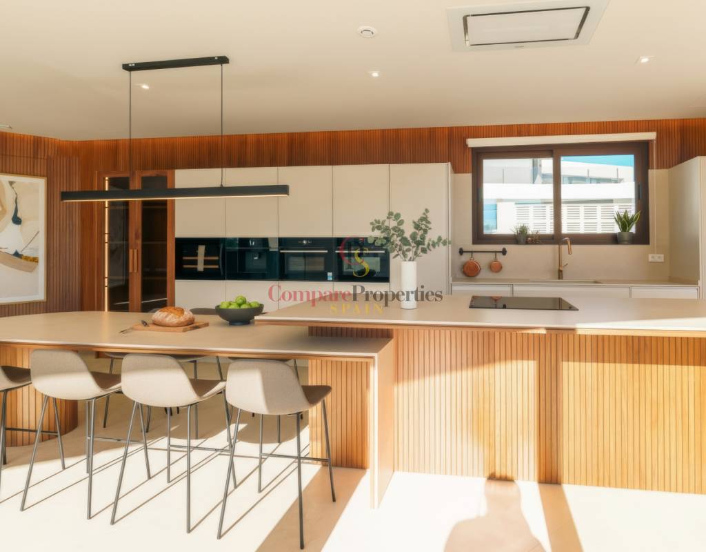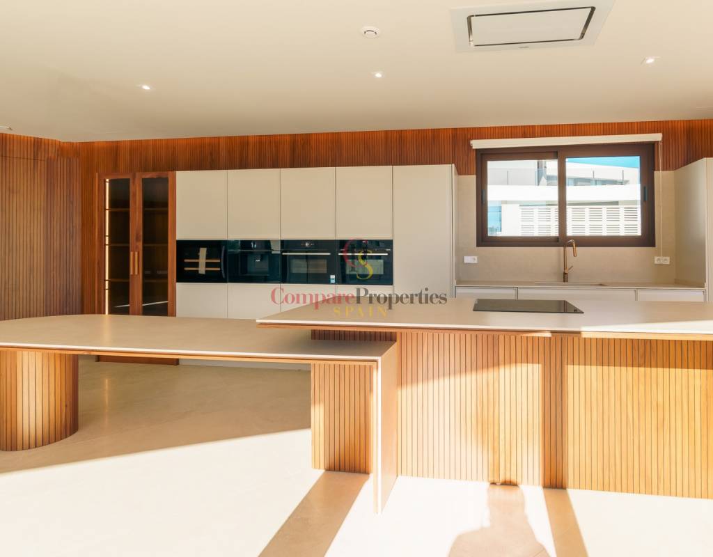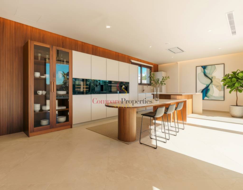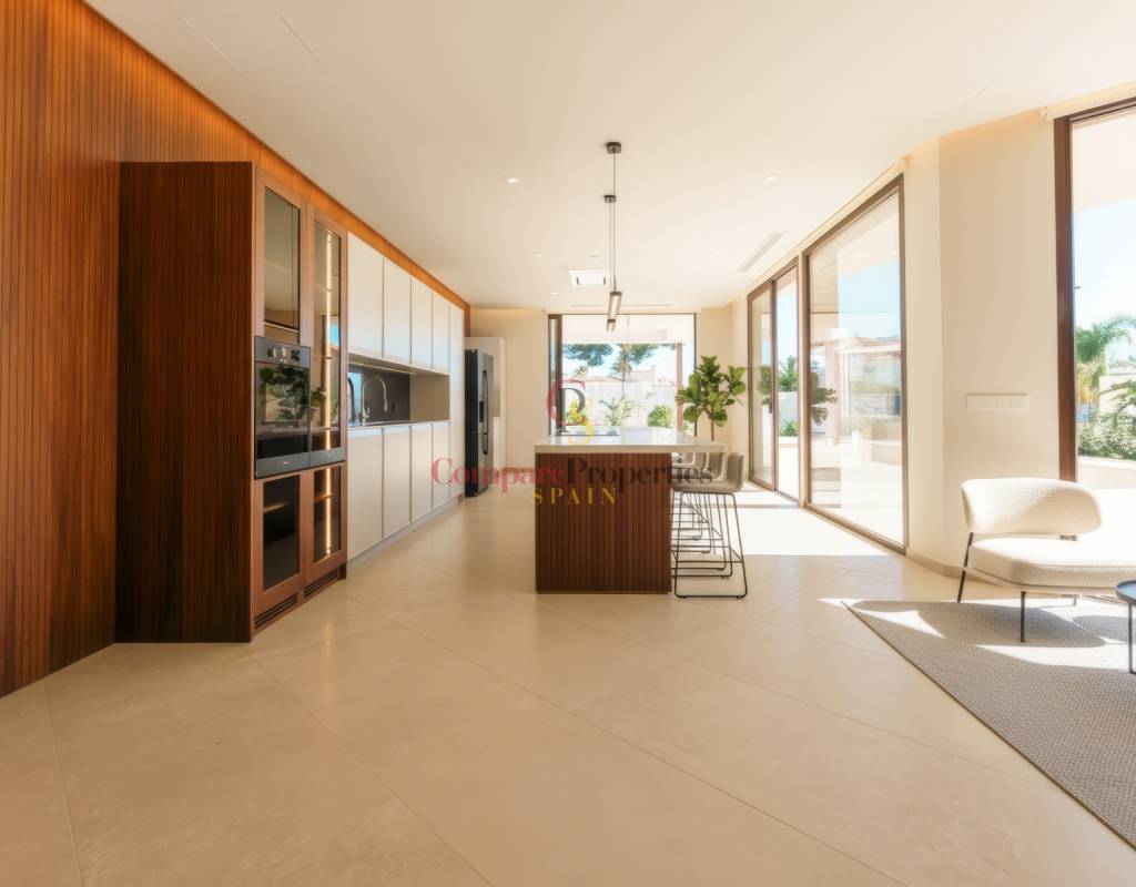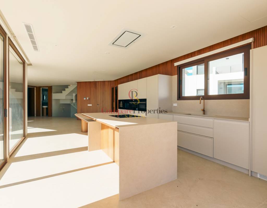 Intérieurs au design contemporain, sols grand format et larges baies vitrées. Cuisine moderne ouverte sur le salon, fonctionnelle et élégante.